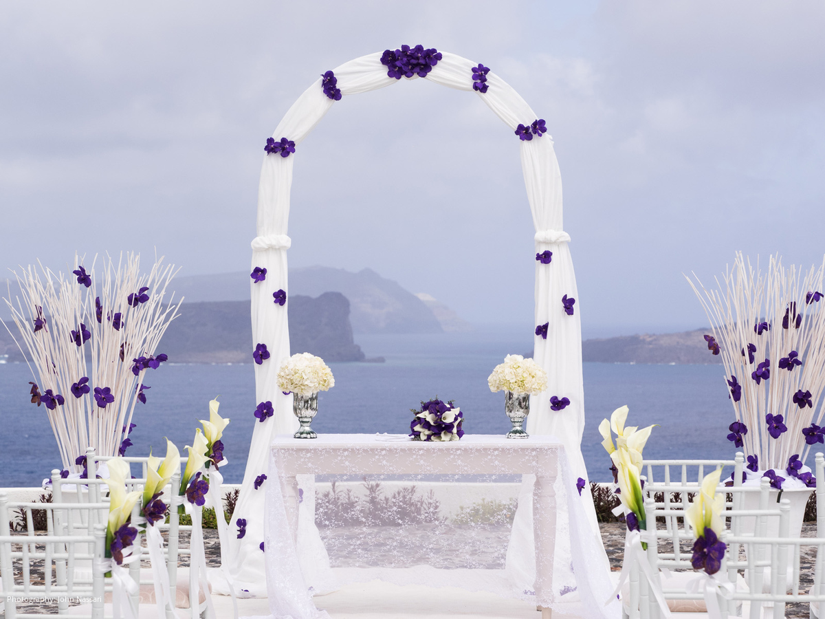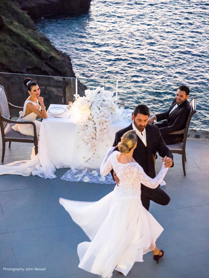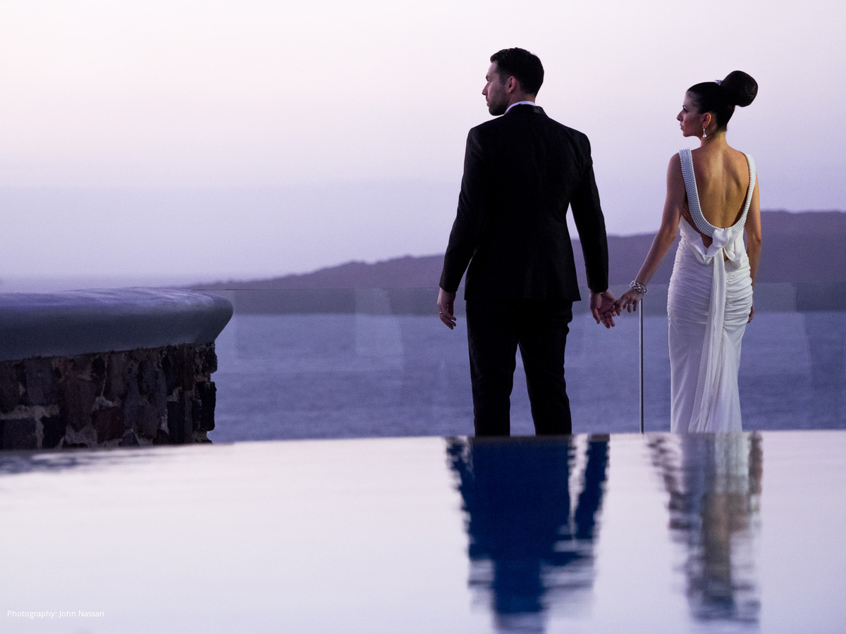 Marie and George took the same approach when planning their vow renewal in Santorini, Greece. Not only is Santorini, Greece one of their favorite islands, but it also reflects their Greek culture. While their wedding was fun and energetic, the ambiance of the vow renewal was much more relaxed and dreamy. Headed by Mitheo Events, the vision and concept for the renewal was luxury, finesse, classic beauty, and high esthetics.