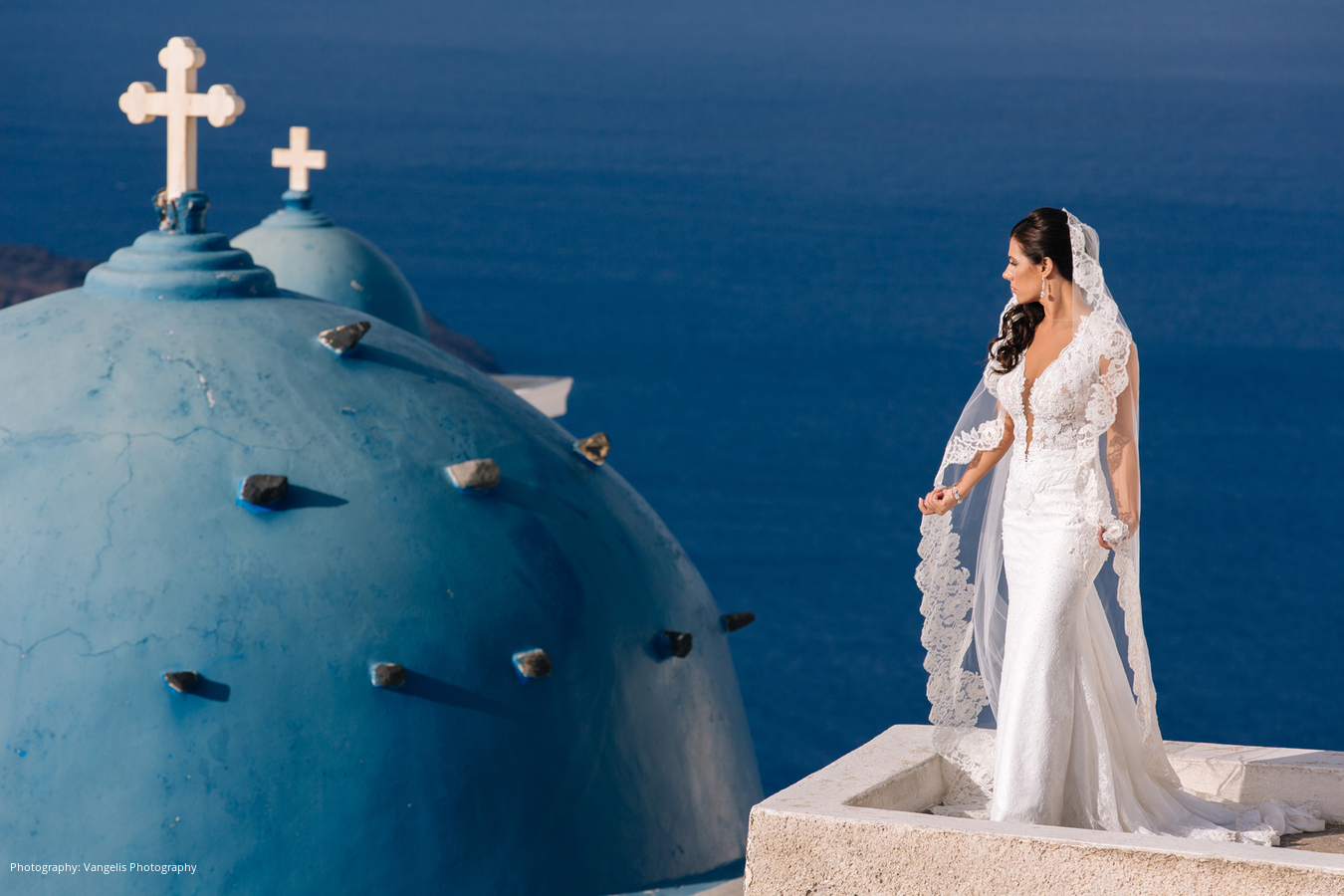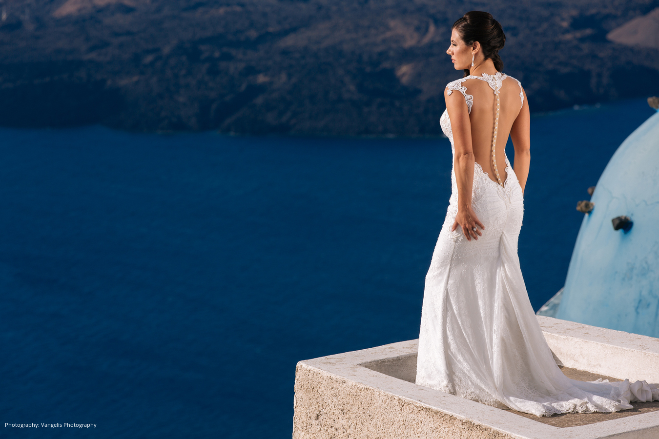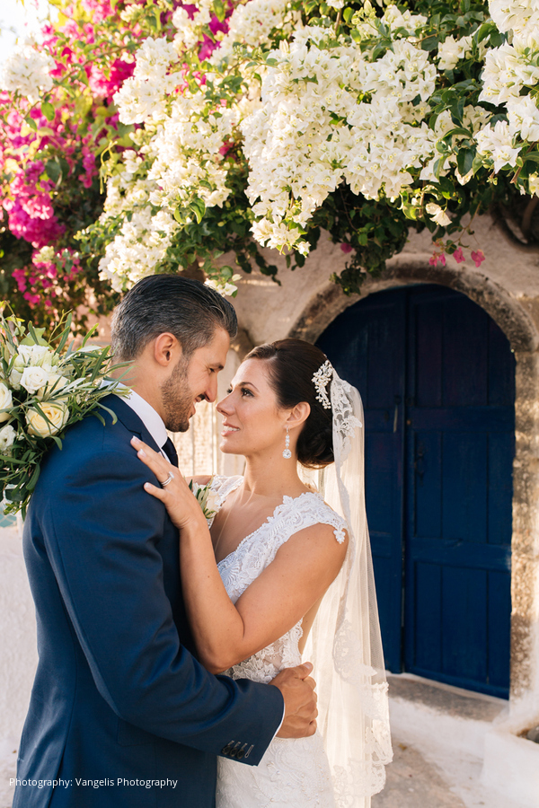 Location: Santorini Gem, Santorini, Greece; Floral and Event Design, Planner: Divine Weddings Pyrgos, Santorini, Greece; Wedding Dress: Berta