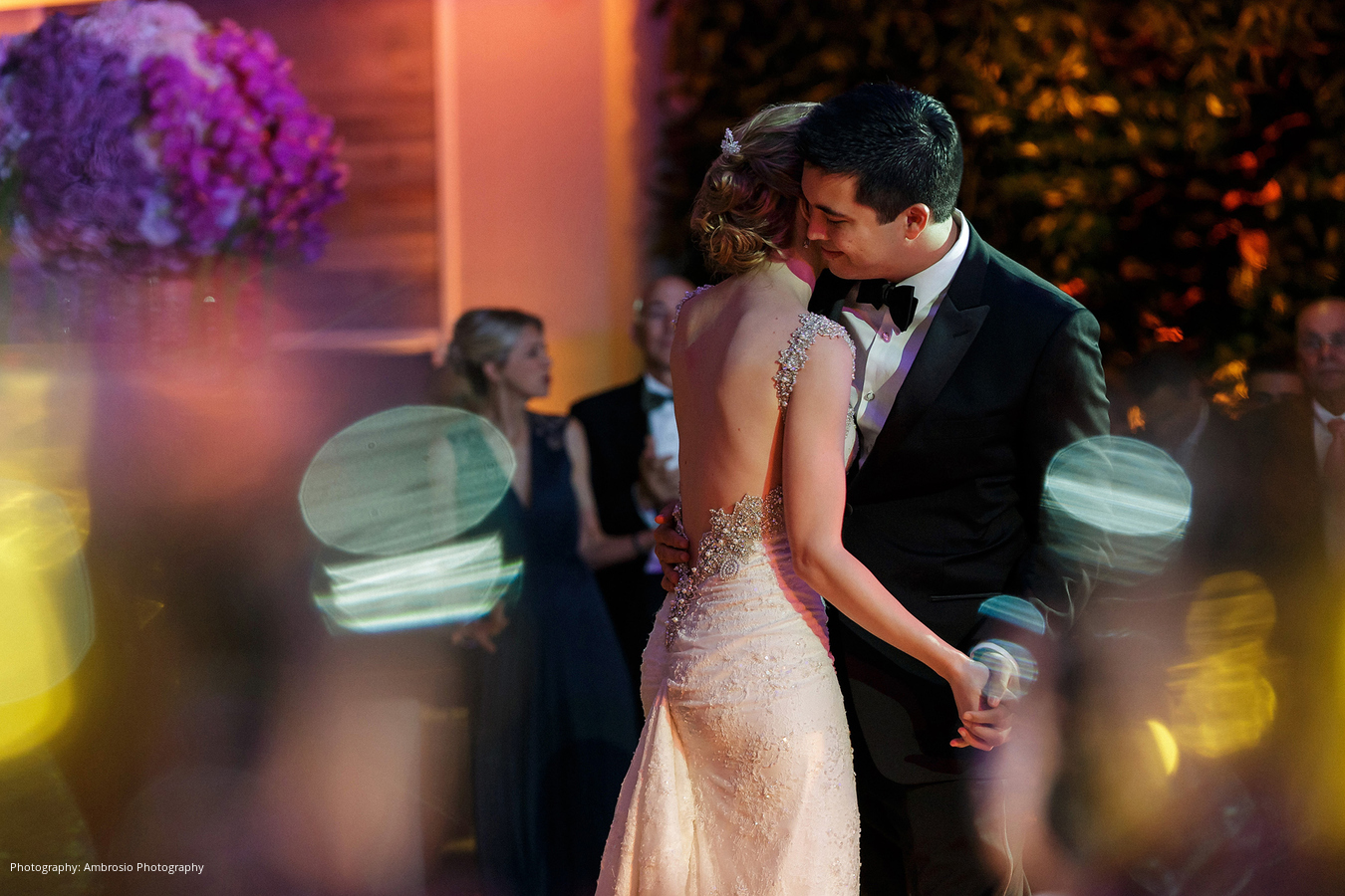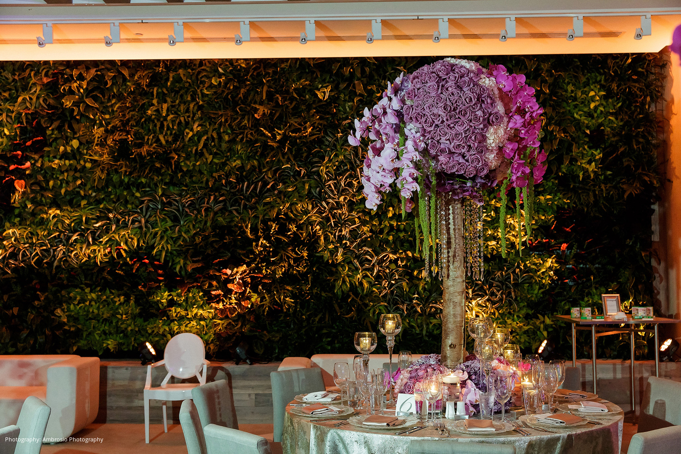 At the reception, guests were treated to great food and a DJ who kept everyone dancing throughout the night. The reception space featured a green wall, which served as the perfect contrast to large bouquets of orchids on the tabletops, creating a vibrant Miami ambiance.