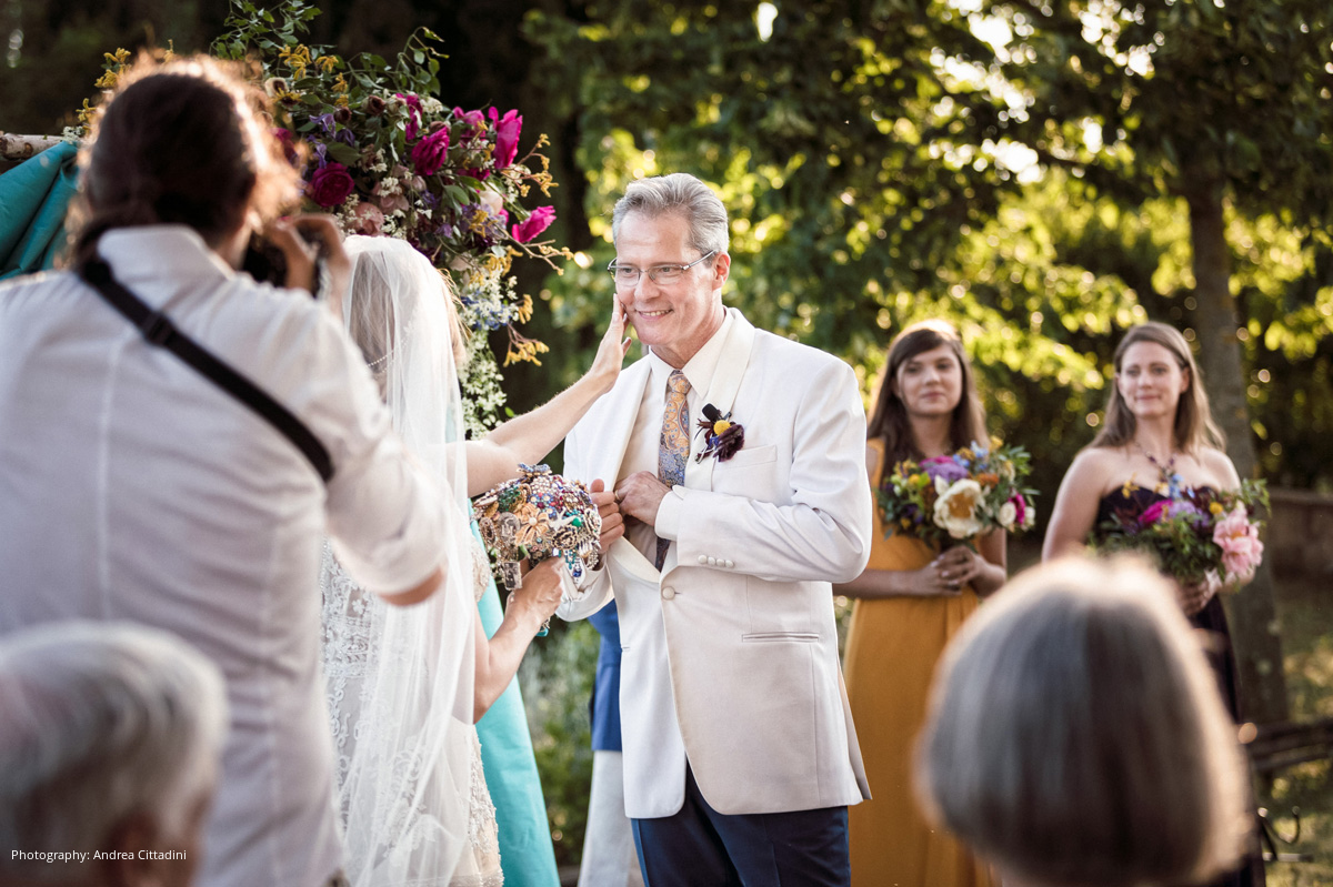 The next day, when David asked his new fiancé about what her dream wedding would be, she simply answered with, “Italy.” Their wedding planning process began with searching for a venue where they could stay with their guests, while also hosting a ceremony and reception at the same location. Once they came across Il Grande prato in Castelfiorentino, they knew it’d be the perfect spot.