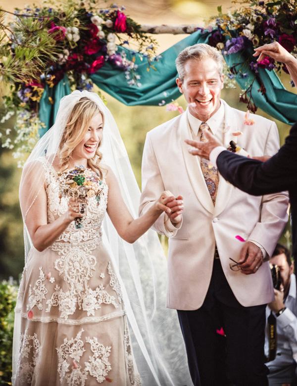 When it came time for the wedding ceremony, the bride and groom were joined by their guests on a stunning hillside, where they recited vows they had written, along with poetry and the tunes of an acoustic guitar. The bride carried a bouquet she had made herself from vintage jewelry, complete with precious family heirlooms. For the reception, Edison bulbs were strung over a single, long reception table, and fairy lights in the trees added a warm glow to the outdoor patio for dancing.