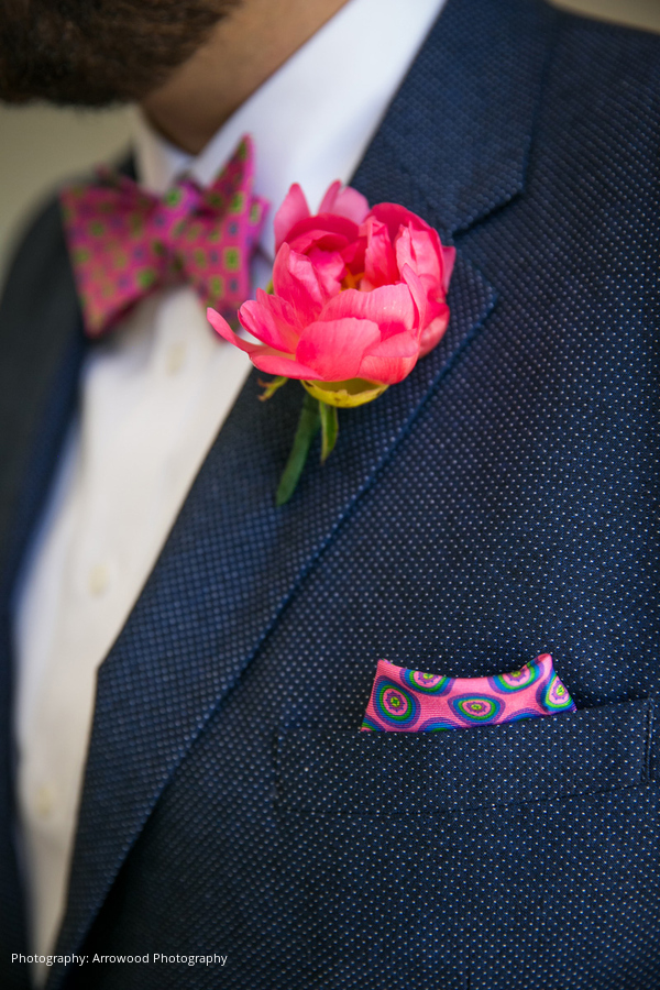 Each attendee was given a coral peony boutonniere or corsage, keeping with the main décor theme of the wedding. Peonies also appeared on the invitations and menus. Under the beautiful California sky, guests were seated poolside and enjoyed a three-course dinner catered by Cindy Pawlcyn’s, along with wine pairings from Alpha Omega winery and Broc Cellars. After the sun set, everyone relaxed in the main house, indulging in a whiskey tasting and an assortment of desserts.