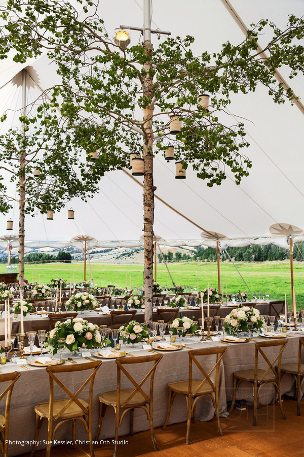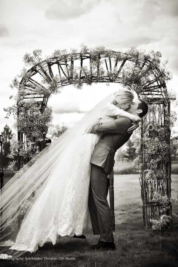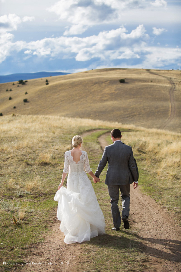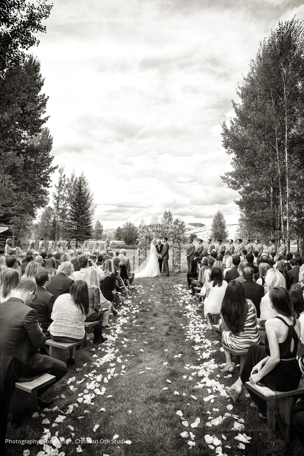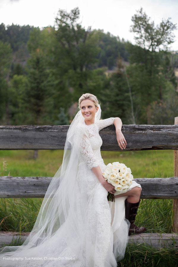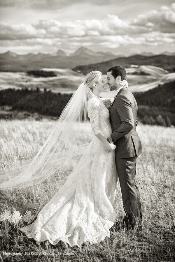 Location: The Ranch at Rock Creek, Philipsburg, Montana; Floral and Event Design, Planner: Habitat Events, Missoula, MT ; Rentals and Lighting: The Party Store, Columbia Falls, MT; Stationery: Calabash Card Co., Birmingham, AL; Wedding Dress and Veil: Monique Lhuillier; Tuxedo: John Varvatos; Tie: Hermes