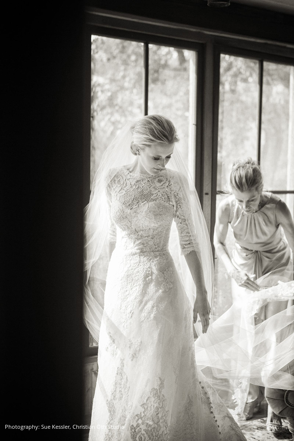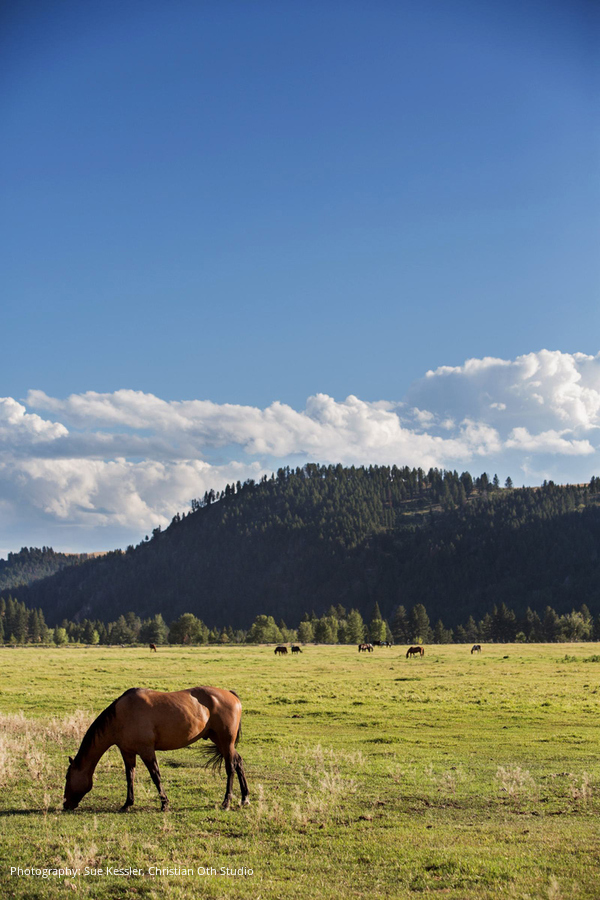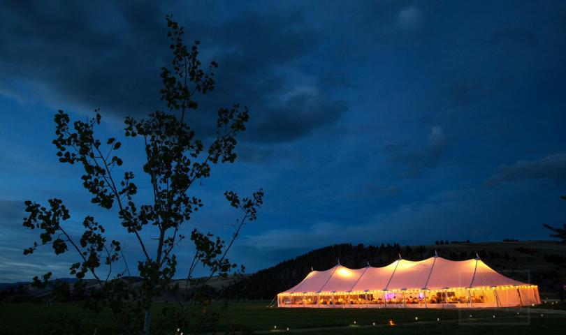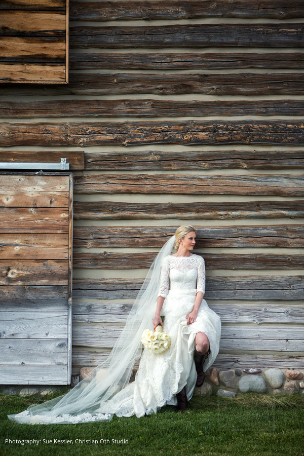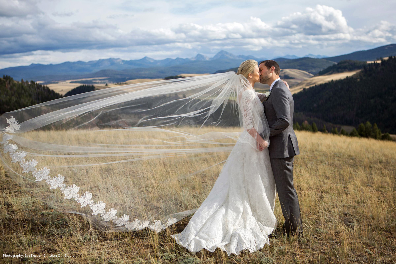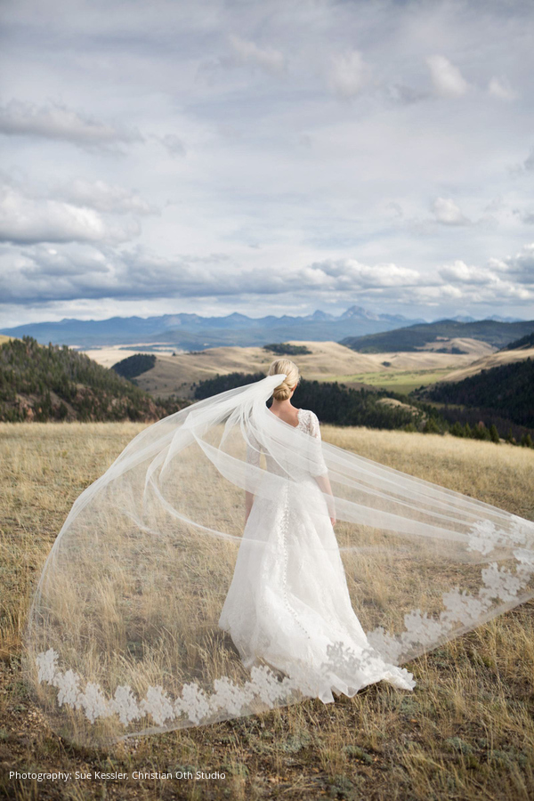Location: The Ranch at Rock Creek, Philipsburg, Montana; Floral and Event Design, Planner: Habitat Events, Missoula, MT ; Rentals and Lighting: The Party Store, Columbia Falls, MT; Stationery: Calabash Card Co., Birmingham, AL; Wedding Dress and Veil: Monique Lhuillier; Tuxedo: John Varvatos; Tie: Hermes