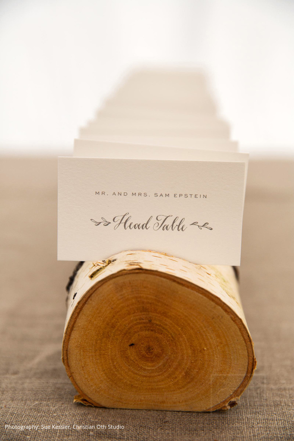 The feel of the reception was rustic yet elegant, with linens and gold accents that made the tent feel warm. Adding birch wood and branches around the tent poles enhanced the feel of the rustic outdoors.