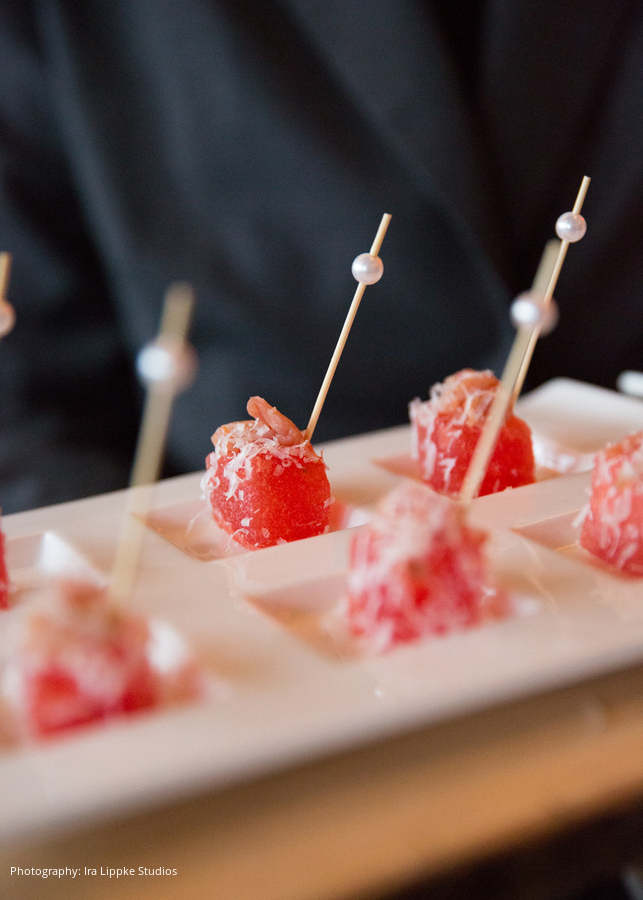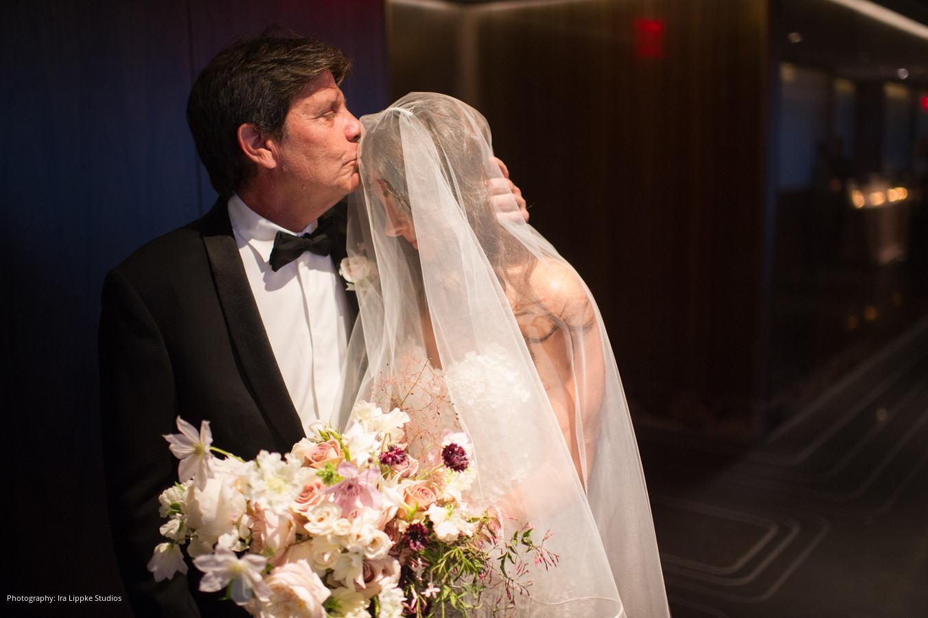 On the morning of the wedding, the bride and groom woke up at the Park Hyatt Hotel, relaxed by the pool, and spent the morning together. The rest of the day went by in a flash, and everything turned out exactly as the couple had envisioned. A rainy day did nothing to damper the mood inside the Rainbow Room, as a stunning chuppah looked that much more dreamlike against the white clouds. Inspired by the Rainbow Room itself, the venue’s colors were used in a design scheme of purples, greys, Lucite and crystal, which was thoroughly enjoyed by a guest list that included Giada De Laurentiis, Flea, and Chad Smith and Josh Klinghoffer from the Red Hot Chili Peppers.