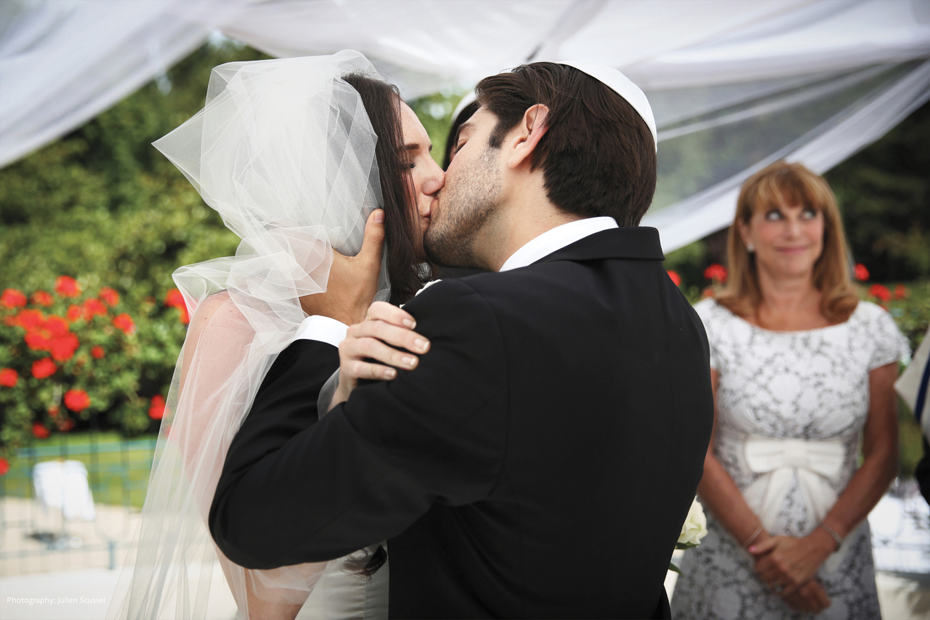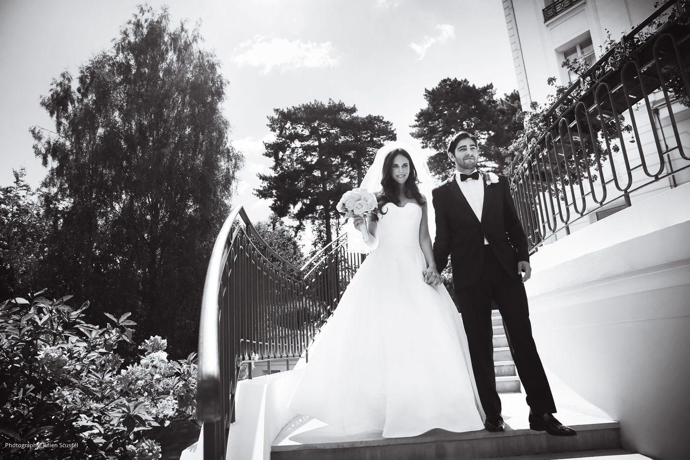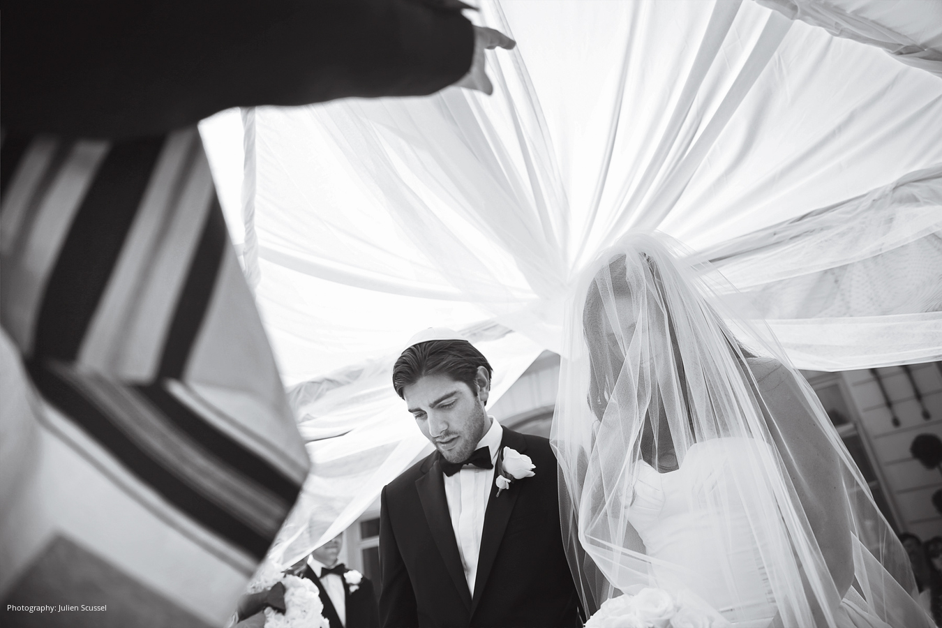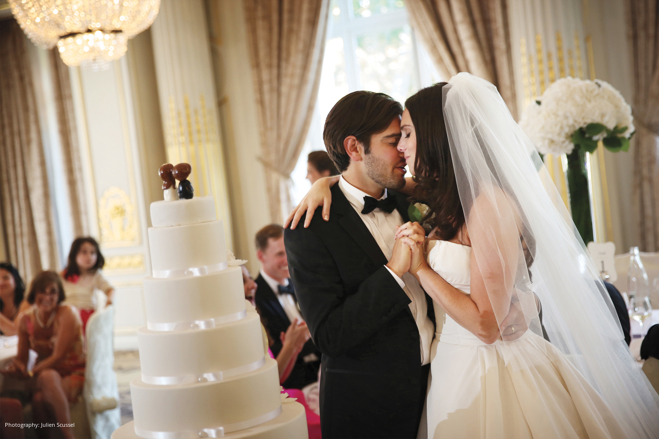 Wedding Dress: Reem Acra Veil: Kleinfeld, New York, NY; Groom’s Tuxedo: Hugo Boss; Photography: Julien Scussel, Paris, France