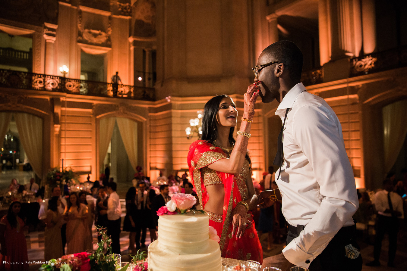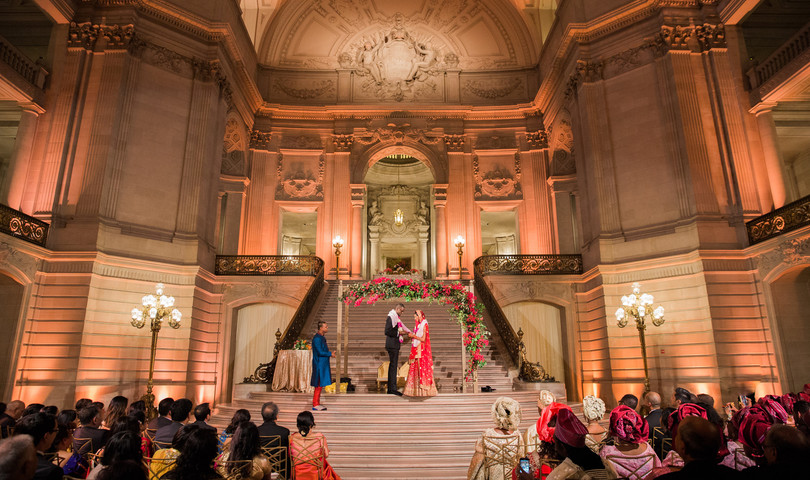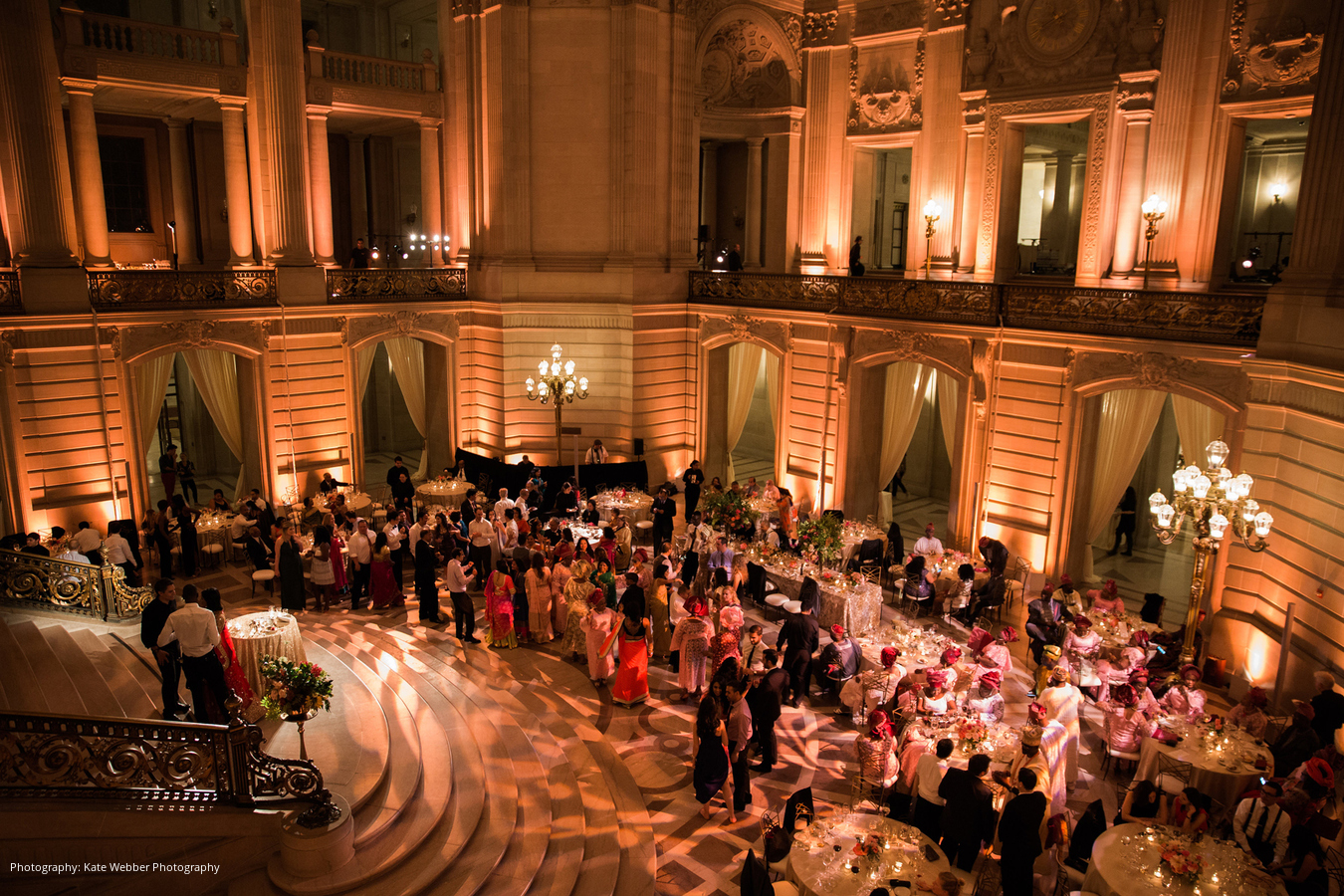 Location: San Francisco City Hall, San Francisco, CA; Planner: MAP Weddings & Events, San Francisco, CA; Photography: Kate Webber Photography; Floral Design: Angella Floral Arts, Fairfax, CA; Wedding Dress: Sabyasachi; Groom’s Attire: Indochino; Linen: La Tavola Fine Linen Rental, San Francisco, CA; Caterer: Taste Catering, San Francisco, CA; Rentals: Standard Party Rentals, Richmond, CA; Rentals: Classic Party Rentals, San Francisco, CA; Lighting: Everything Audio Visual, San Francisco, CA; Cake: SusieCakes, San Francisco, CA; Hair & Makeup: Professional Makeup Artistry, San Francisco, CA ; Cinematography: Weddings on Film, San Francisco, CA