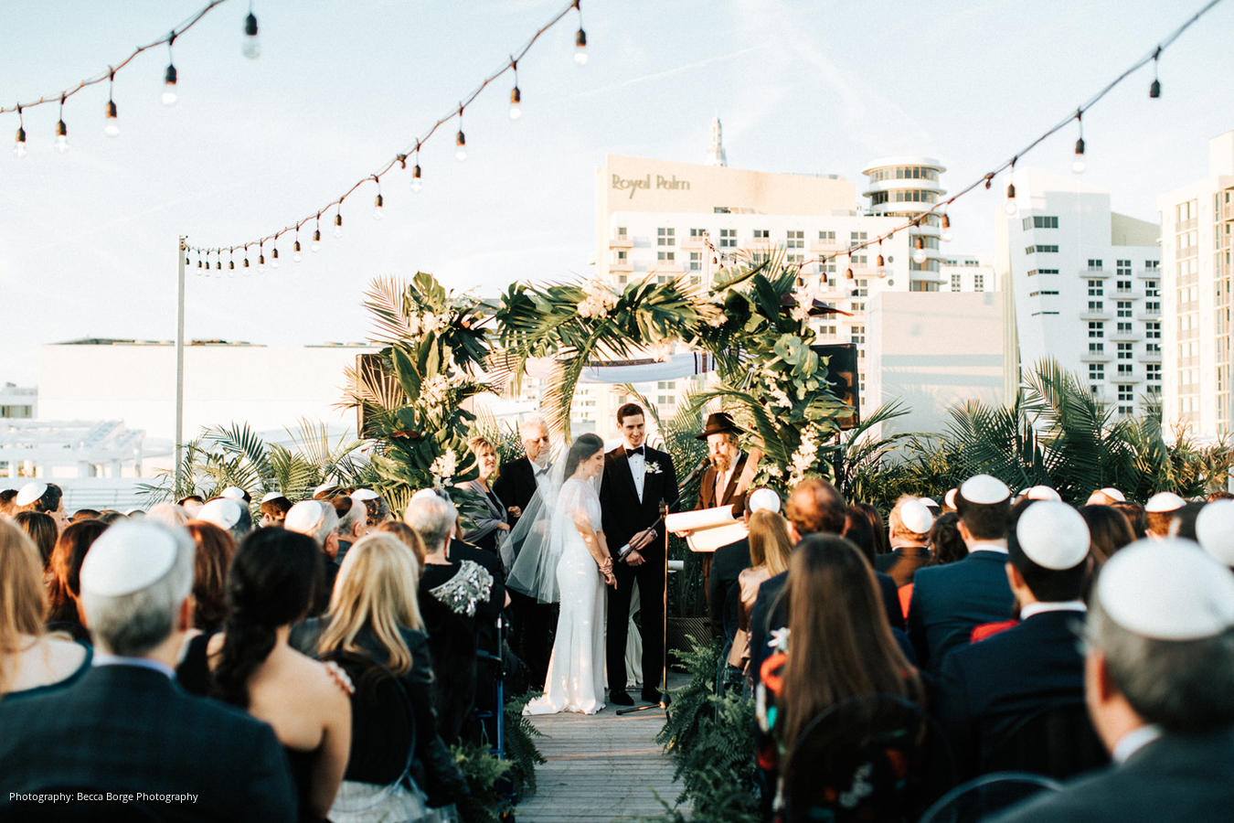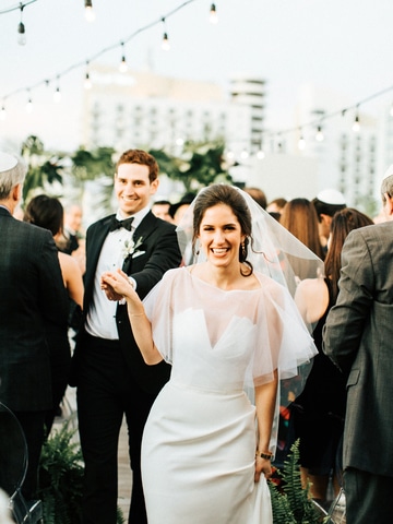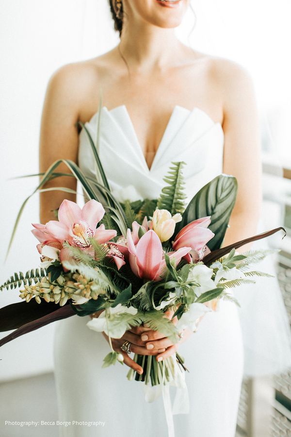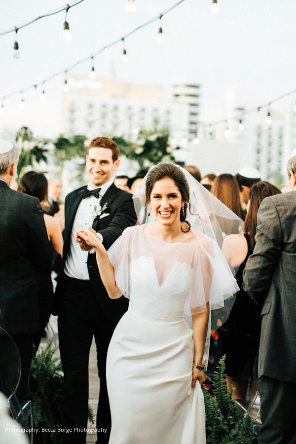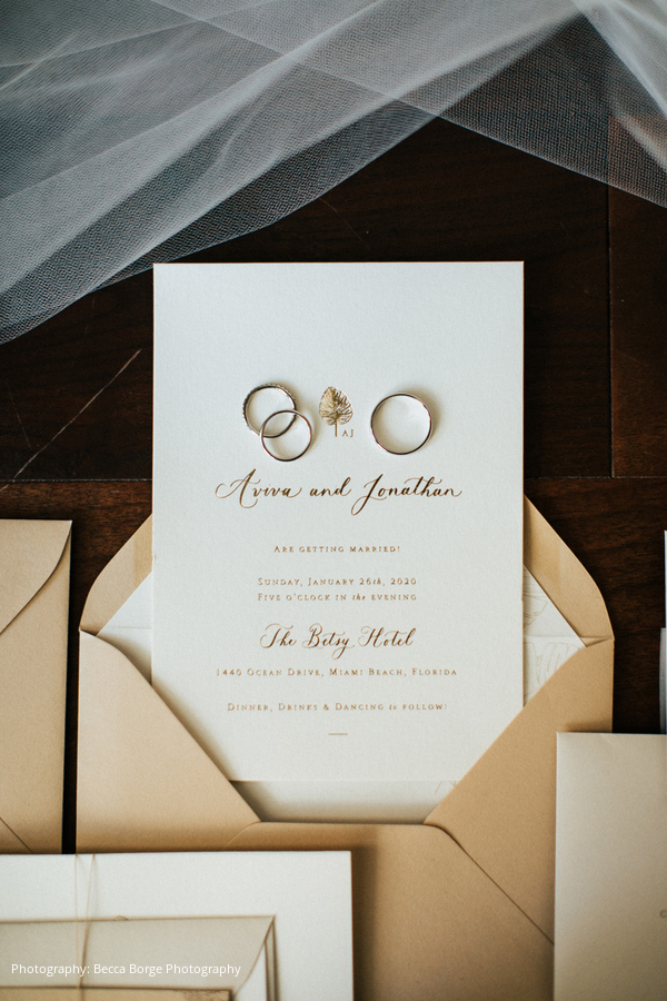 From the start, Aviva and Jonathan’s wedding planning process was smooth and stress-free, as they were both aligned in what they wanted and envisioned with a tropical wedding in Miami. Aviva’s parents were actually engaged at The Betsy Hotel in Miami Beach; so, when they bride and groom-to-be were visiting wedding venues, they knew The Betsy was the right fit. The couple also took a cue from Aviva’s sister, who had worked with Orange & Rose Events for her wedding, which Aviva says was the “best decision we ever made.”