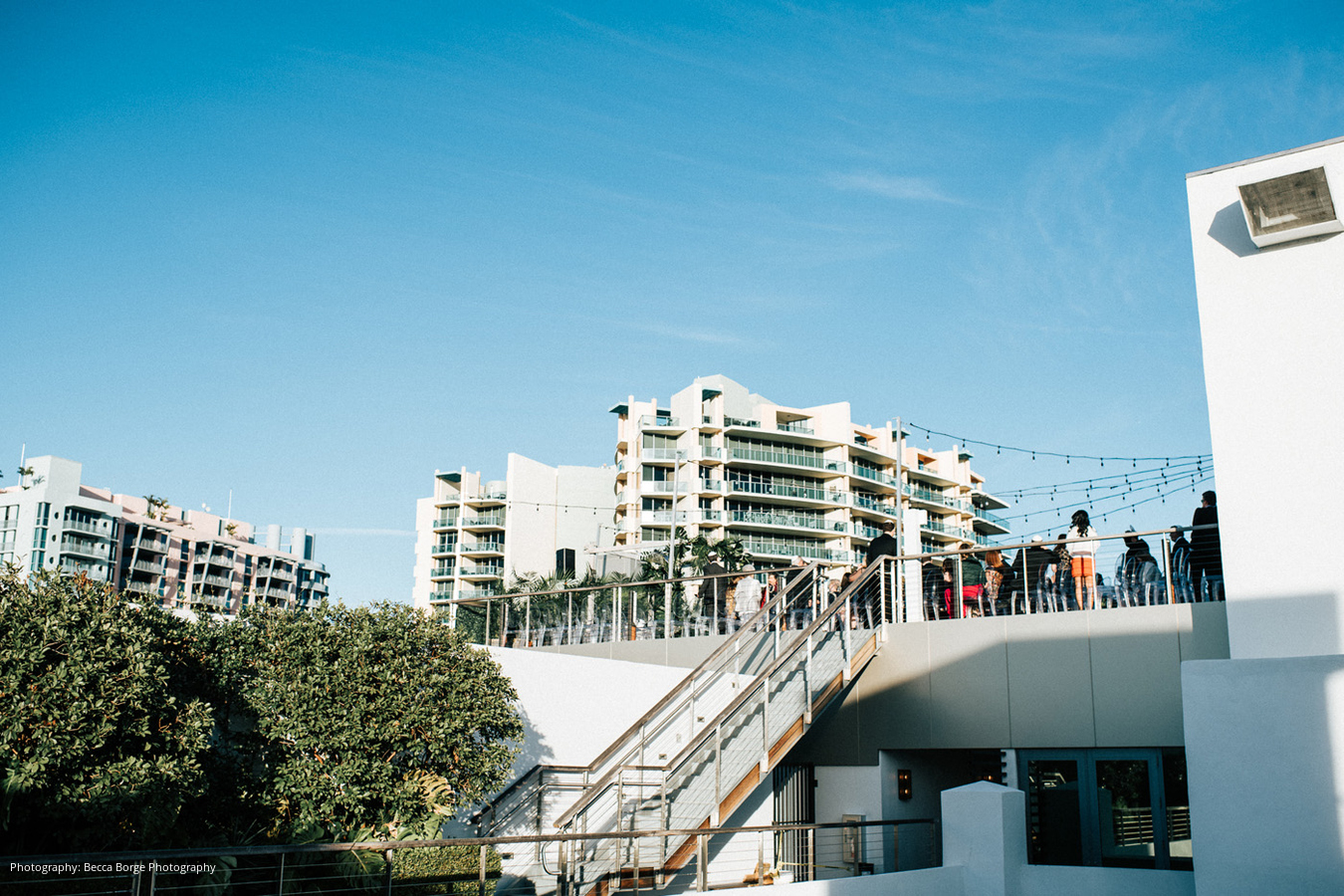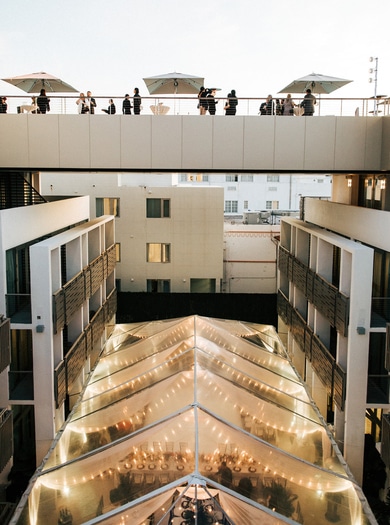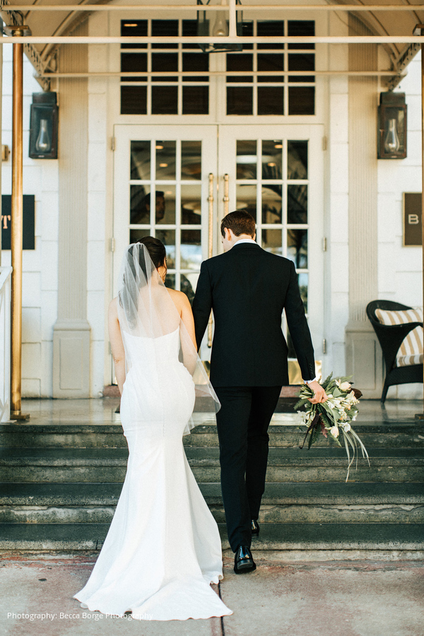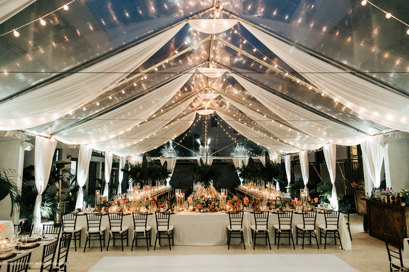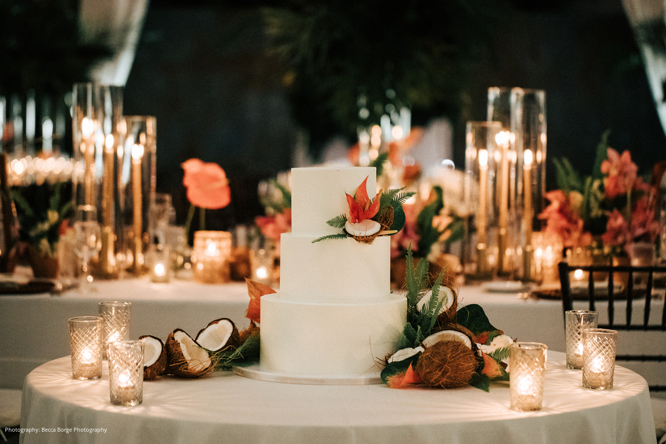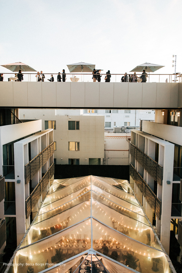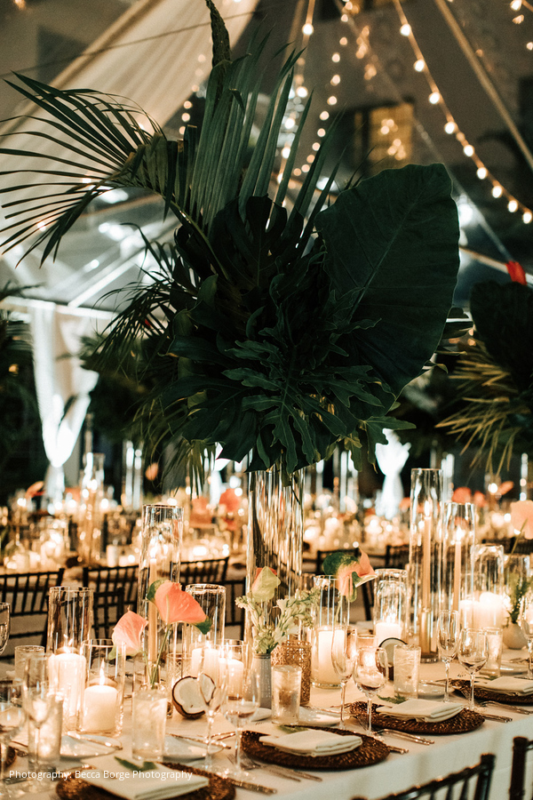 A sunset cocktail hour was held by the rooftop pool, leading to a lively reception. “The centerpieces that they created with Veronica from Anthology Co. blew everyone away,” describes the bride. “We loved the opened coconuts and subtle pink color that the flowers added. The tent had a very warm glow and felt inviting and elegant – we received a lot of compliments that night.