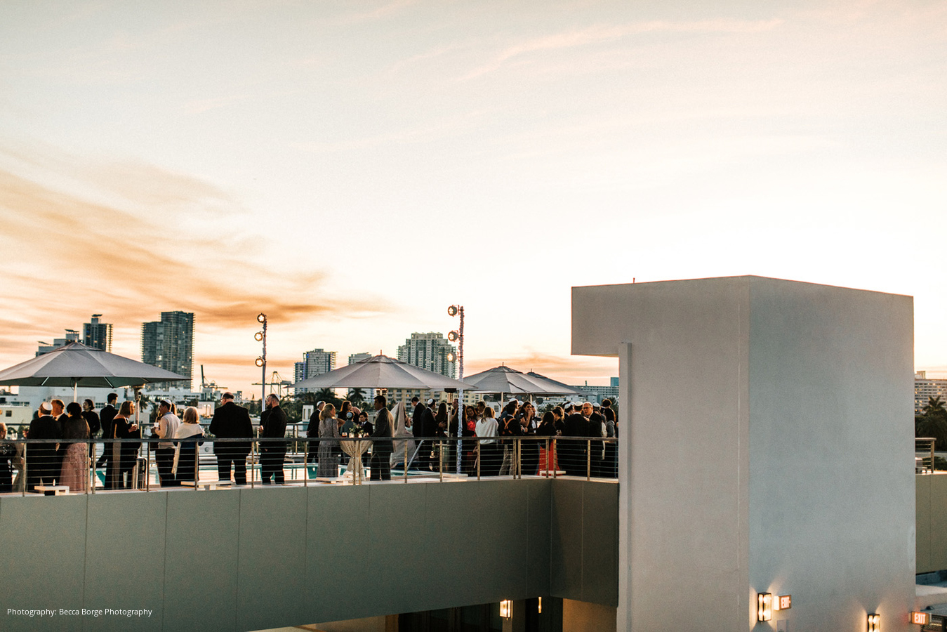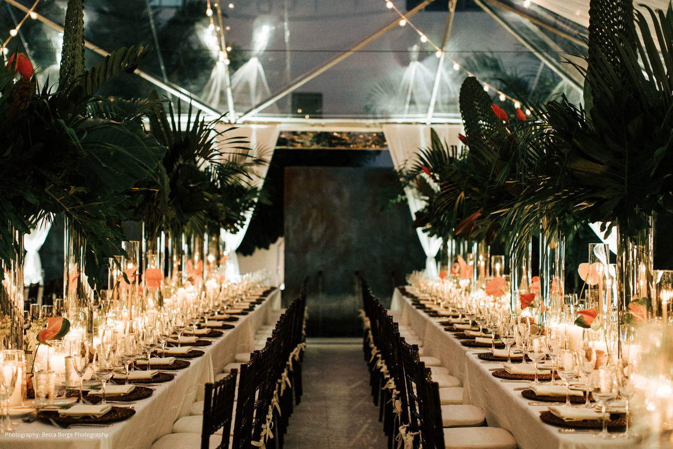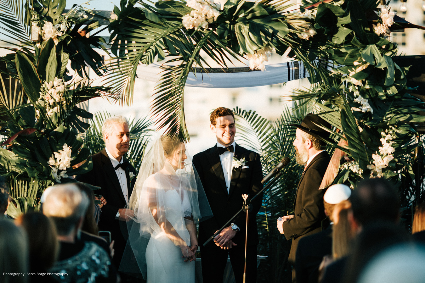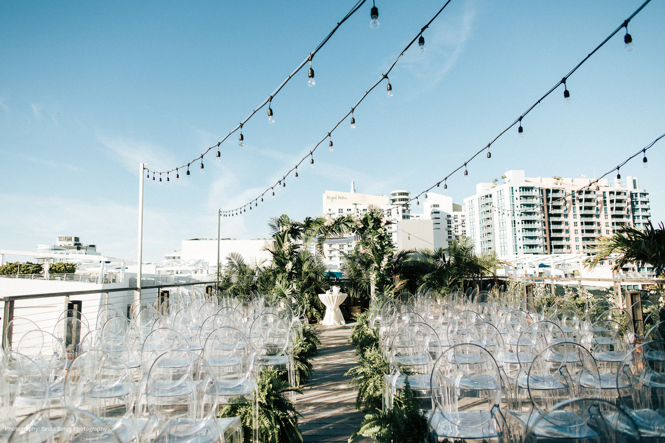 When the wedding day arrived, the bride and groom were excited and thrilled to have their family and friends together in Miami to celebrate with them. Having complete trust in their group of planners and vendors, they were truly able to enjoy each other, their guests, and the party itself. The ceremony took place on the rooftop of The Betsy, offering a fantastic view of Miami Beach. Orange & Rose also created a lush, tropical setting with ghost chairs for a sleek look that felt true to the couple’s style.
