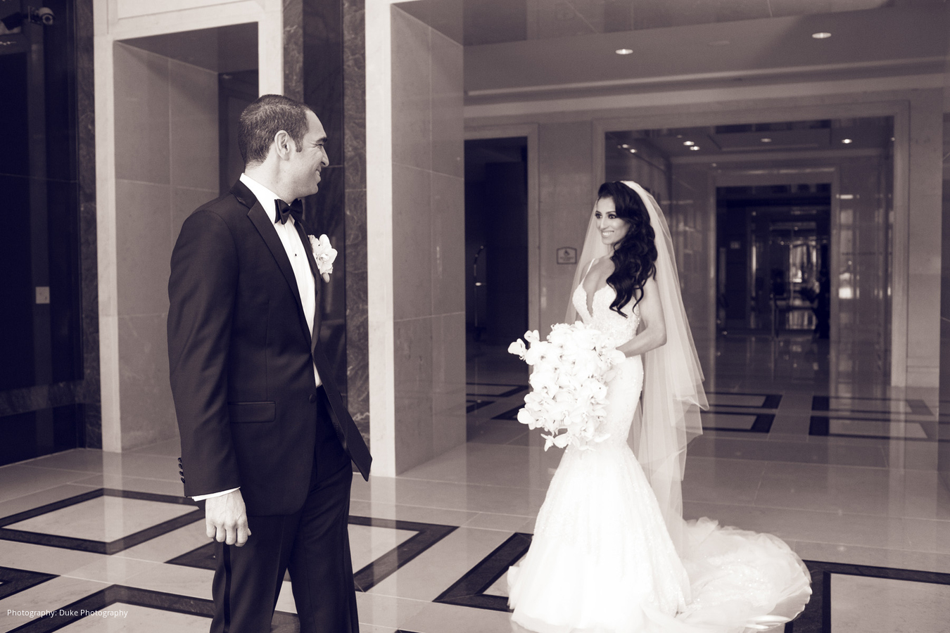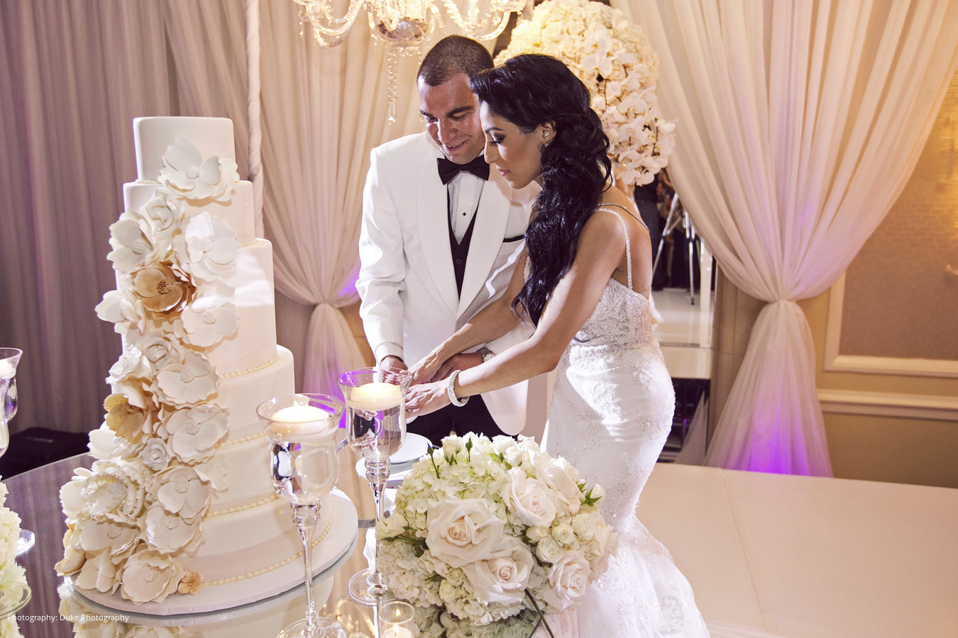 The bride and groom had a chic, modern Persian ceremony with mirrored décor, which made everything reflect beautifully. An array of Persian items on display represented different symbols of love, life and prosperity. “We wanted our guests to feel like royalty, celebrities and VIP guests,” the bride describes. In order to create that special ambiance, a red carpet was rolled out for guests to walk down during the cocktail hour. A customized step-and-repeat was also hung, so guests could have their pictures taken on the red carpet to commemorate the occasion.