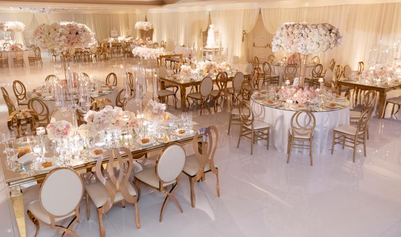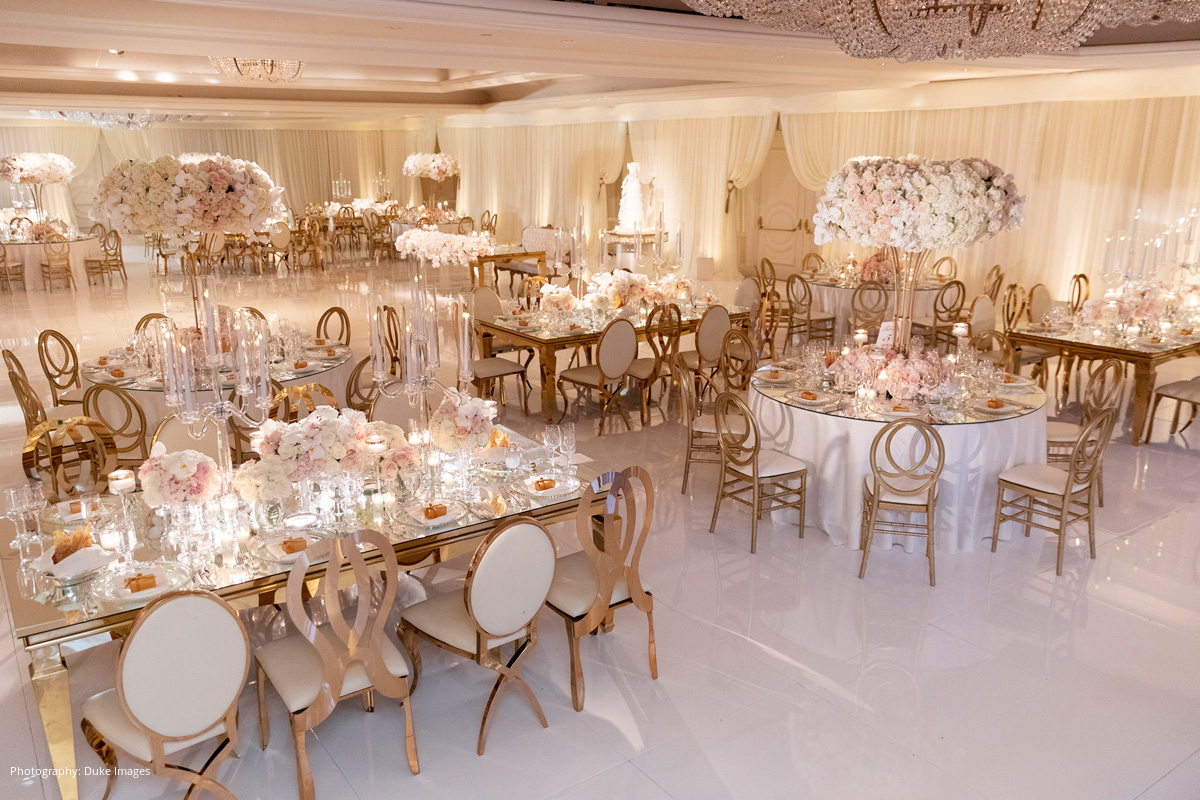 Inspired by the 17th century baroque palaces they visited during their travels together – particularly The Hermitage and Catherine’s Palace in St. Petersberg – the couple’s vision for their wedding décor was a blend of classic luxury and timeless elegance. When guests entered the ballroom, they were surrounded by a dreamy ambiance of ivory, blush, and gold. A pristine white dance floor stretched from wall to wall with Jessica and Alistair’s initials, and the mirrored tables were covered with lush floral arrangements, candles, and crystal candelabras.