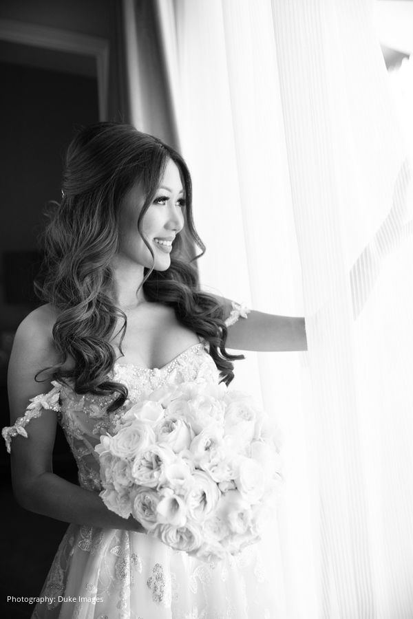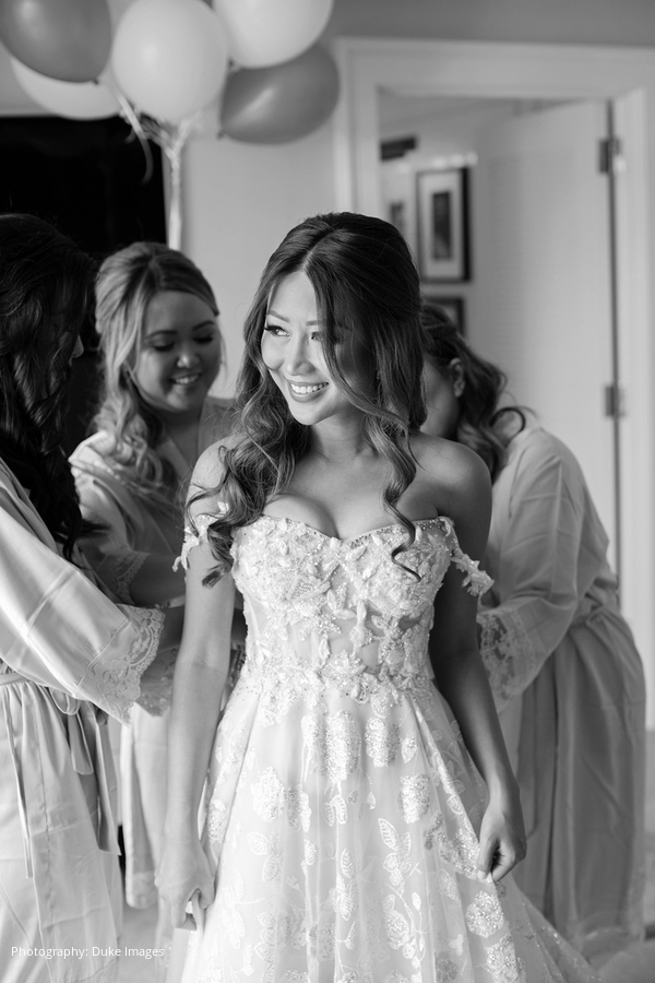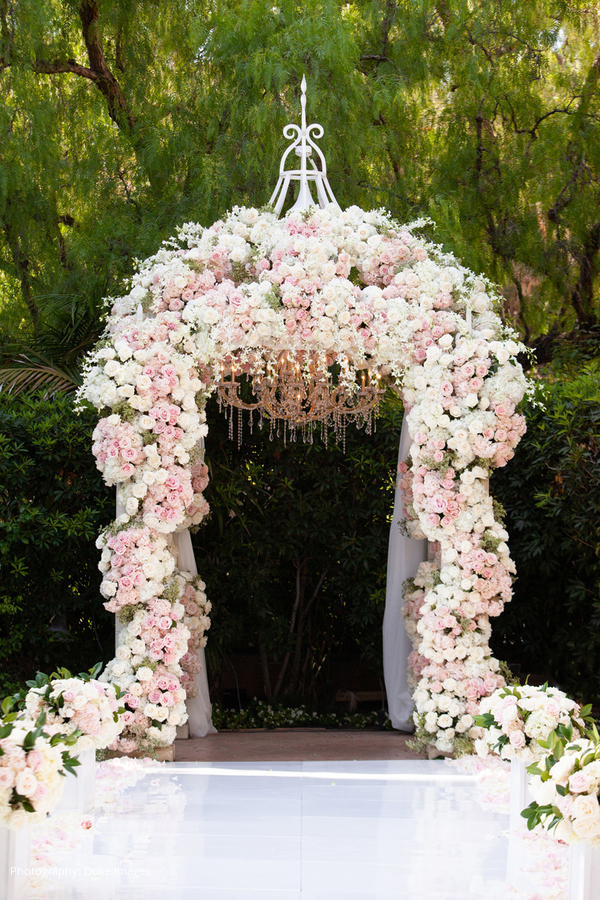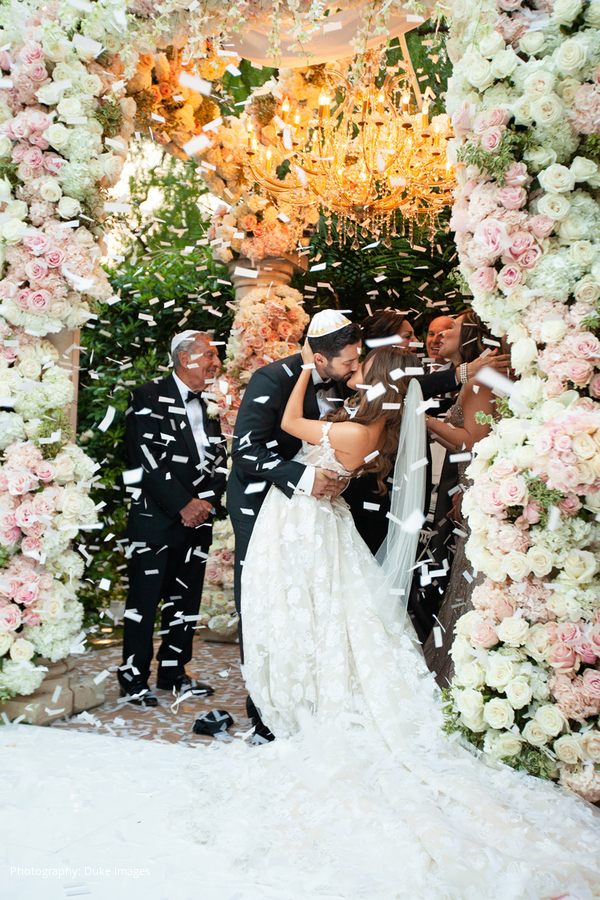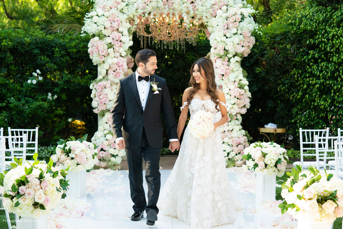 “One of the most special moments of our wedding was to be pronounced husband and wife underneath the most beautiful blush and white floral chuppah that included a large, elegant, lighted crystal chandelier,” says the bride. “Our wedding was also a multicultural and interfaith marriage, with Alistair being British and Jewish and me being Filipino and Catholic.