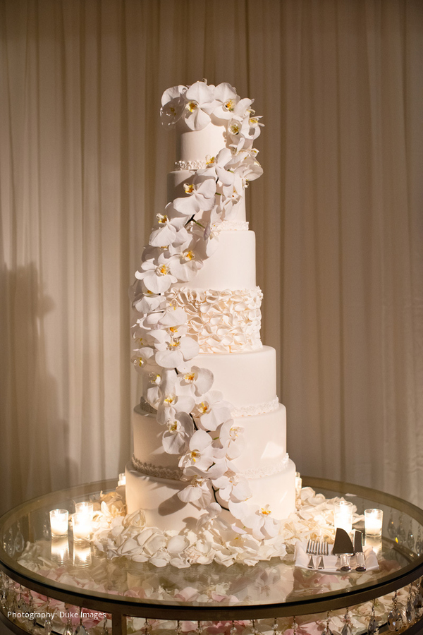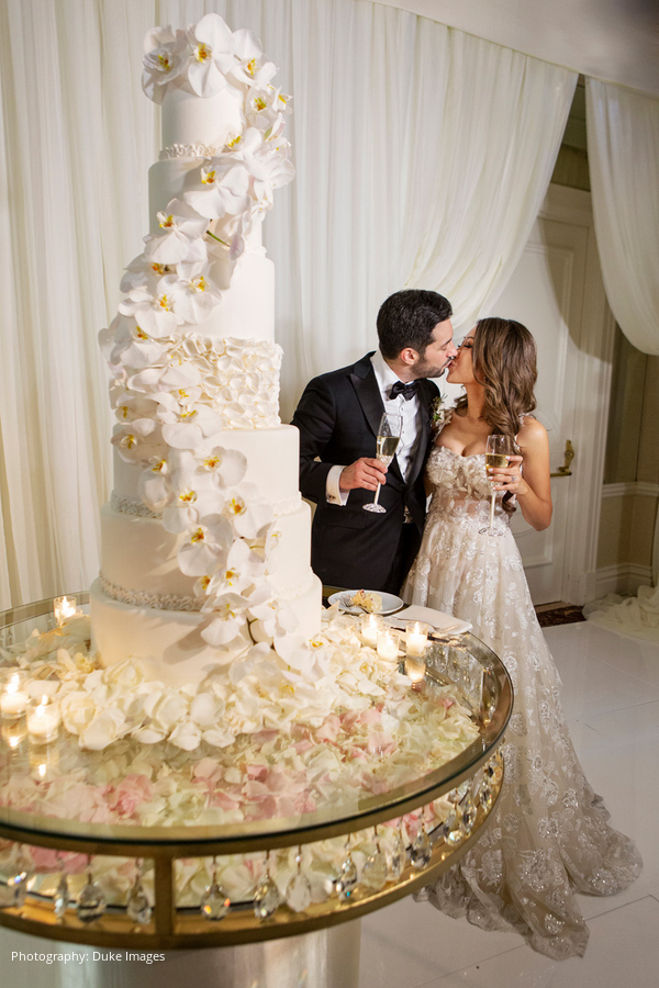 The incredible décor was matched by a sublime wedding menu that included dishes like lobster risotto, chateaubriand, orange blossom crème brulee, a seven-tiered wedding cake, and late night snacks of cheeseburger sliders and chicken and waffles.