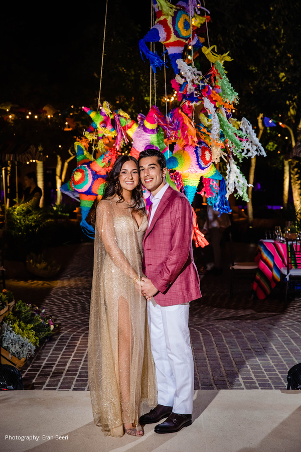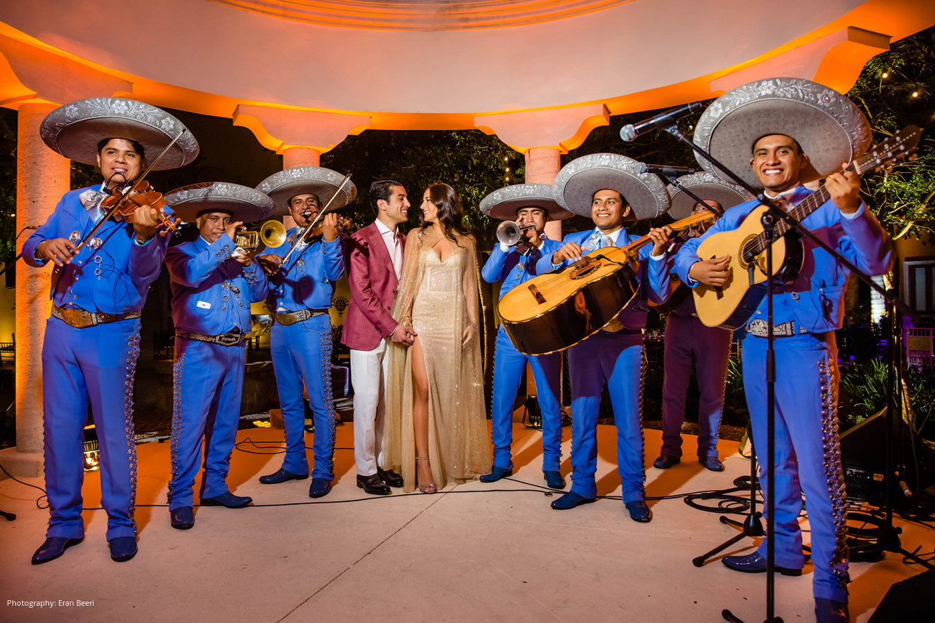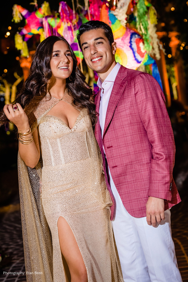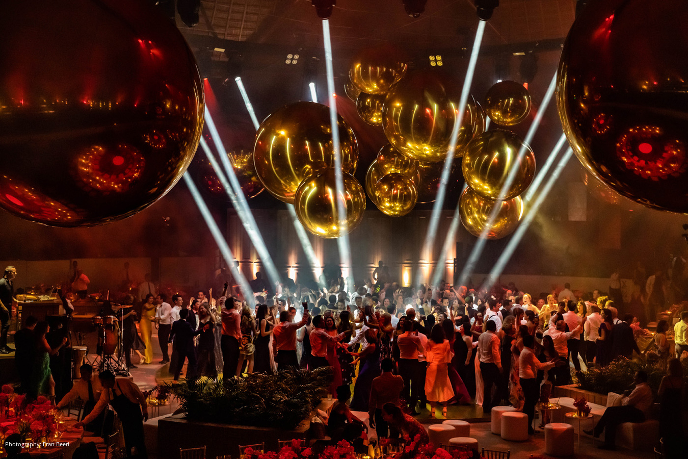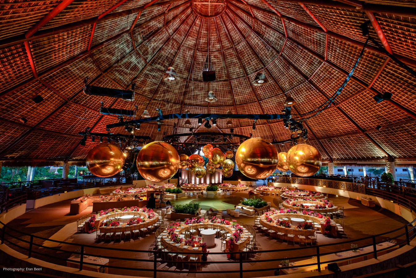 At the reception, the newlyweds and their guests headed to the grand palapa where 12-foot metallic gold spheres were suspended from the 125-foot-high ceiling. While the over-the-top decor wowed guests, the most memorable part of the weekend was the couple's energy and the way everyone celebrated their love.