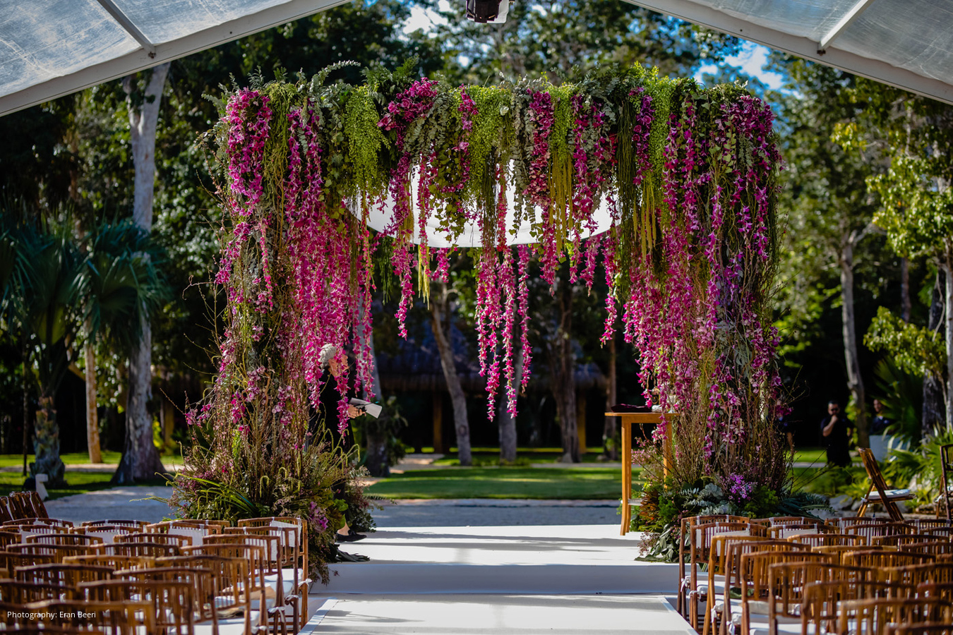 After an unforgettable weekend, it was finally time for the bride and groom to get married. The wedding took place at Ixtul Ranch – a magnificent private ranch, home to the largest Palapa in the world (13,500+ sqft), where the main event took place. Guests arrived at the beautiful cocktail reception, which was set up around the Badekin, a Jewish custom where the groom veils the bride. The bride and groom then said, "I Do" under a tropical hot pink Chuppah.