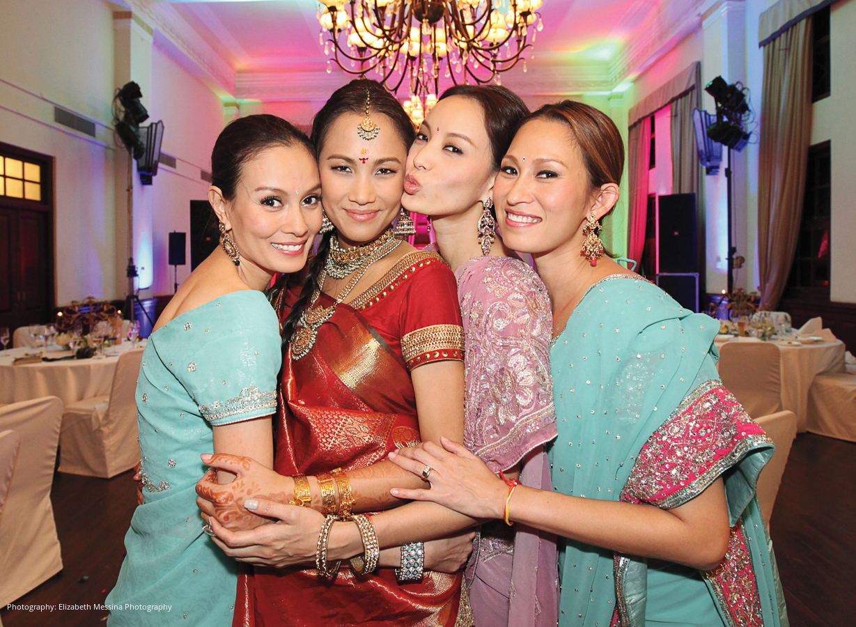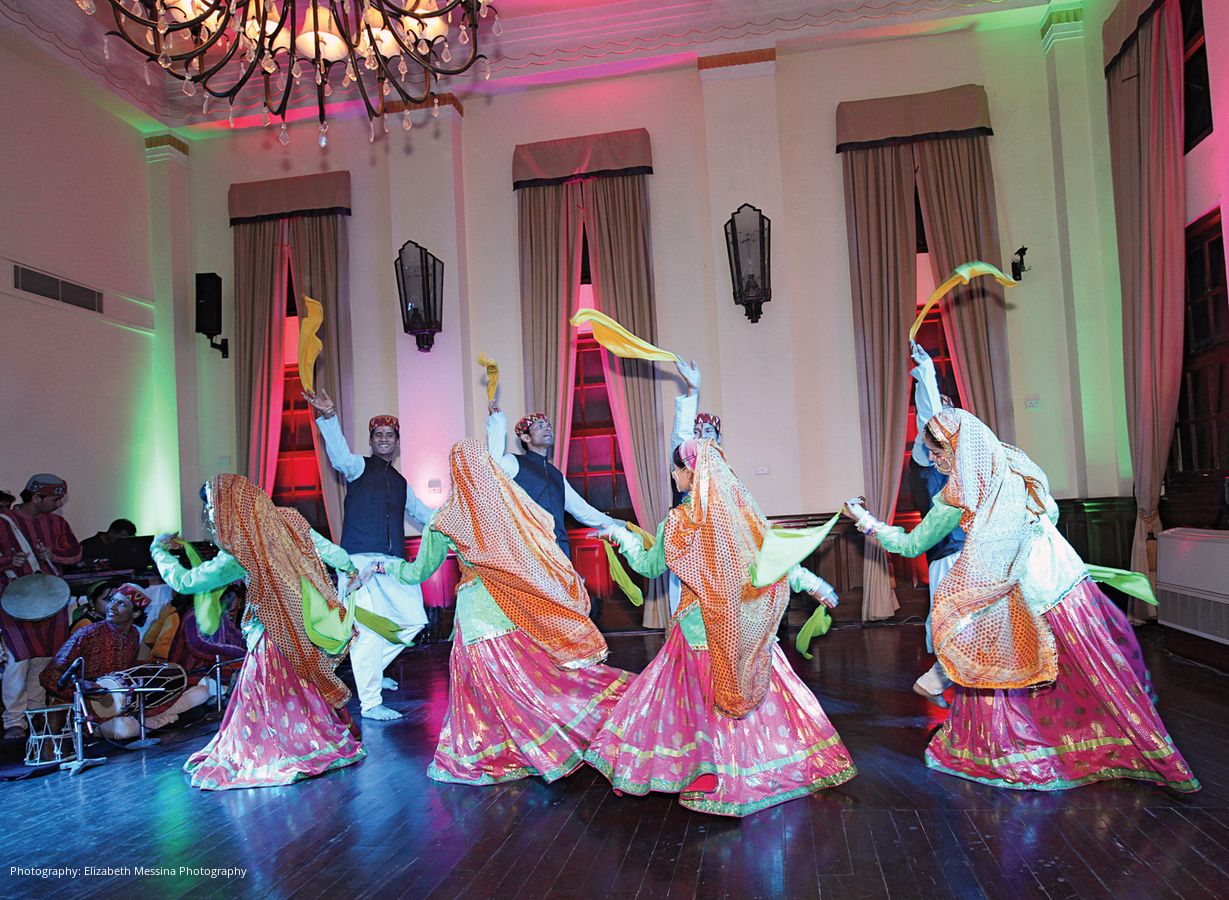 Following the ceremony, guests were shuttled back to the resort for the reception. Desiring a celebration that exuded happiness and elegance, the designers used locally-grown and harvested carnations, tuberoses, gladiolas and colorful lighting to honor the couple’s wishes. White linens, as well as white blooms nestled in shallow glass containers, were styled gracefully along with timeworn, ornate gold candelabras. Guests dined on an artistically-displayed sumptuous feast, while entertainment was provided by a traditional Indian band, sitar guitarist and Bhangra dancers. By the end of the night, the party was in full swing with a DJ mixing Bollywood and Western dance music.