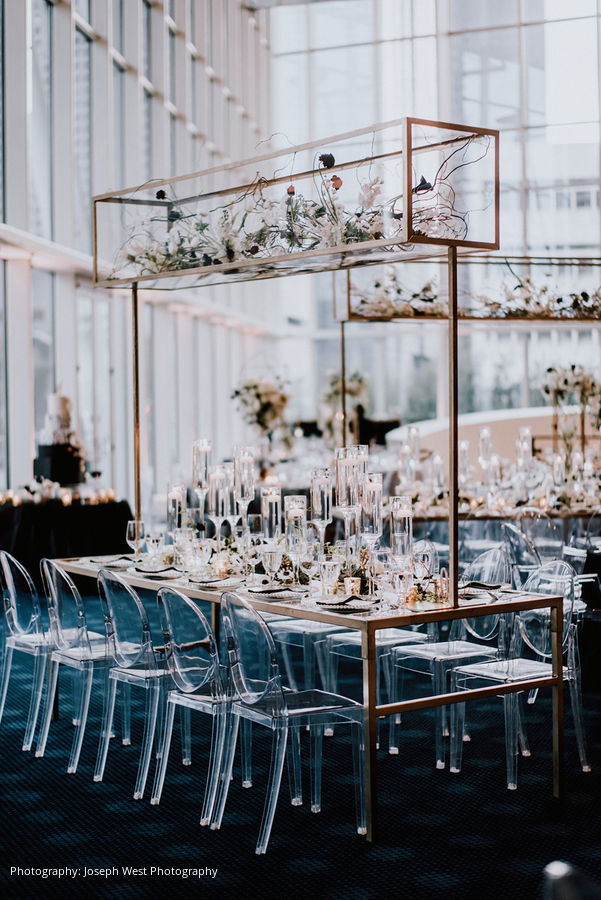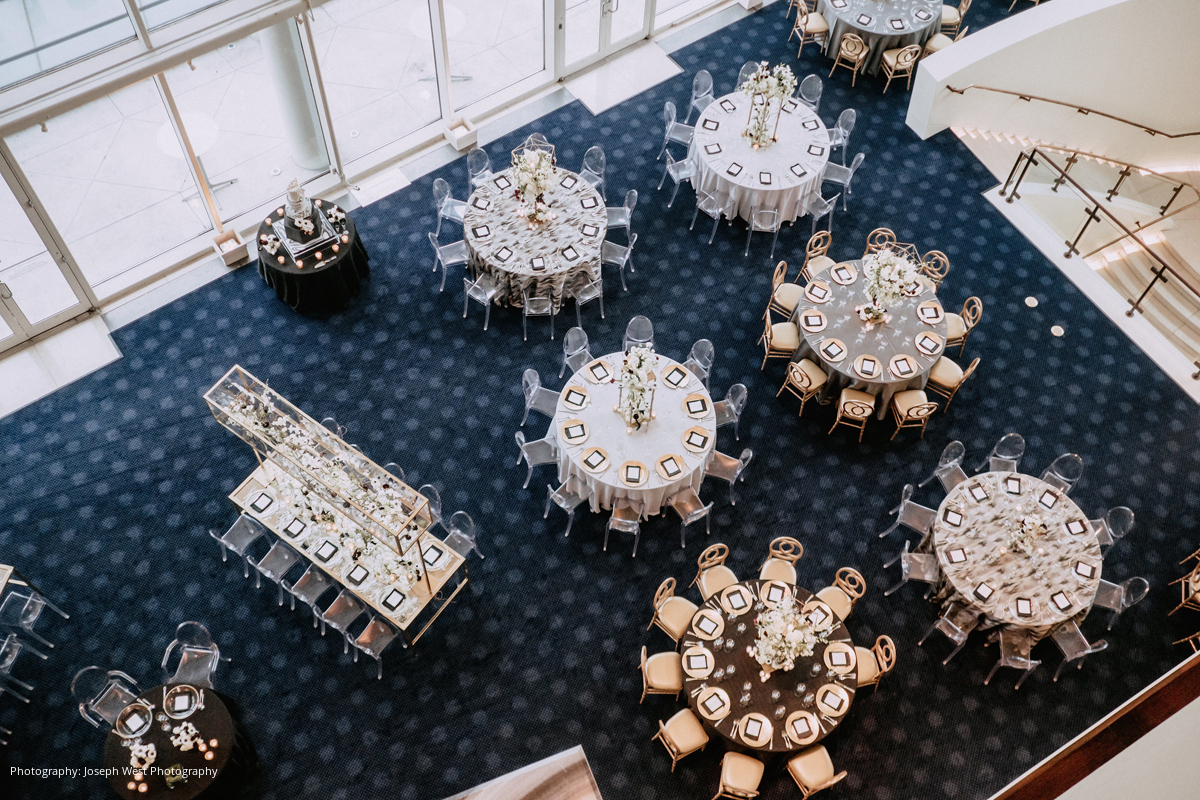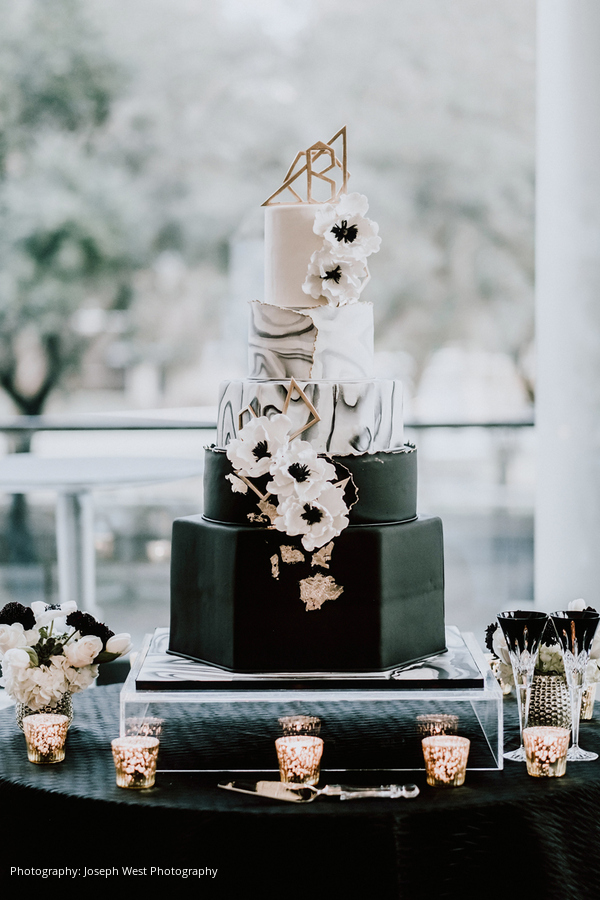When the bride envisioned her wedding, she wanted it to be different than what had been done before – romantic, moody, modern, and with a touch of glam. What unfolded was the perfect décor scheme of dark table settings, dark floral arrangements, and a stunning agate overlay on the dance floor. The groom also loved his espresso bar, which he chose in lieu of a groom’s cake, along with South American-inspired cuisine.