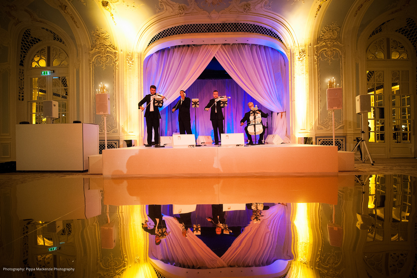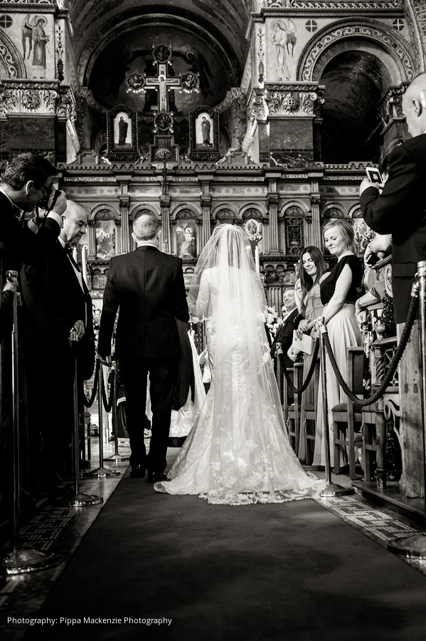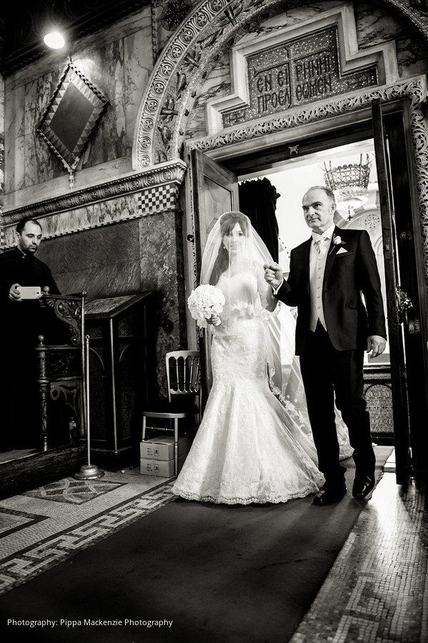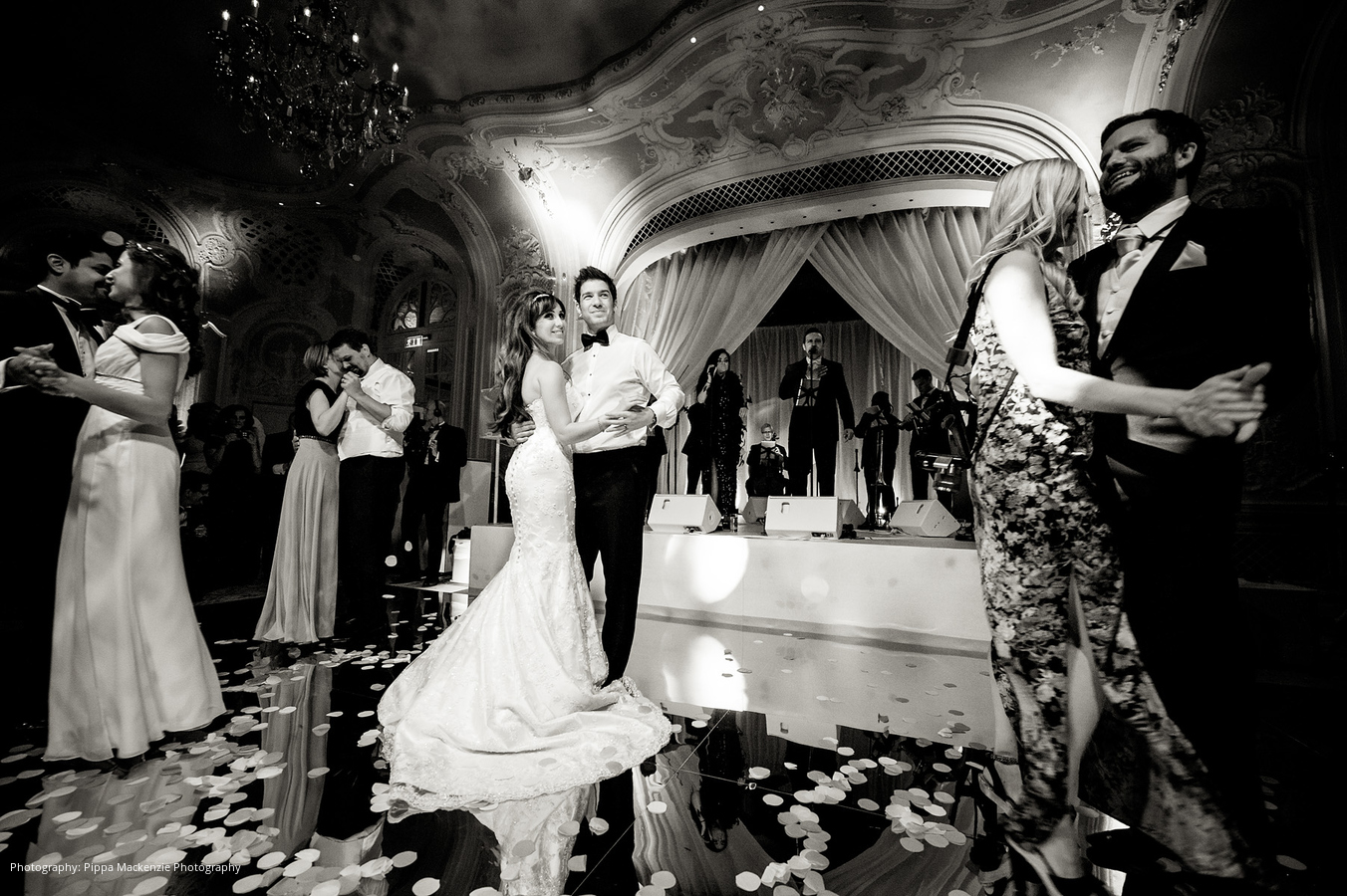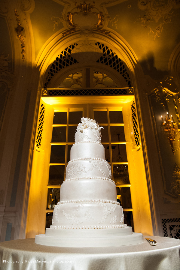 Location and Caterer: The Savoy London, England; Event Design and Planner: By Bruce Russell, London, England; Floral Design: Wild About, London, England; Linen: 88 Events, London, England; Rentals: Great Hire, London, England; Lighting: Wise Productions, London, England; Cake: Little Venice Cake Company, London, England; Stationery: Intricate Creations, London, England; Wedding Dress and Veil: Sassi Holford
