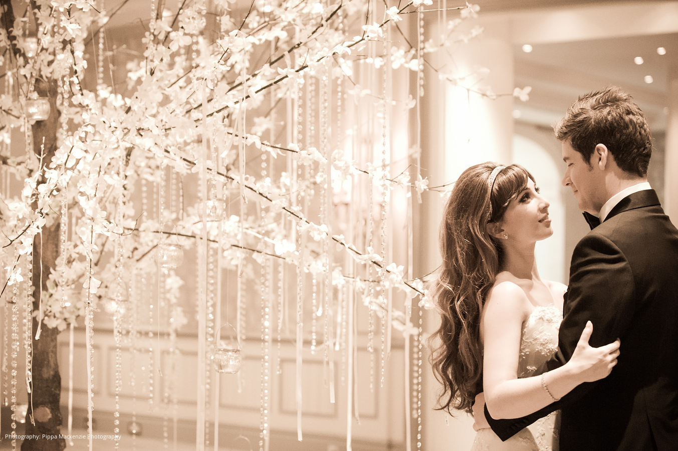 Their wedding theme was old Hollywood glamour. The reception had neutral palettes of ivory and cream with a touch of gold and accents of mirrors and crystals. There was an abundance of flowers to create warmth. Candles were lit everywhere with a scent of Hellebores to create a romantic ambience. One of the reasons why they chose The Savoy was that they were able to have an a la carte menu. The food and wine tasting was one of their favorite experiences of the planning process.