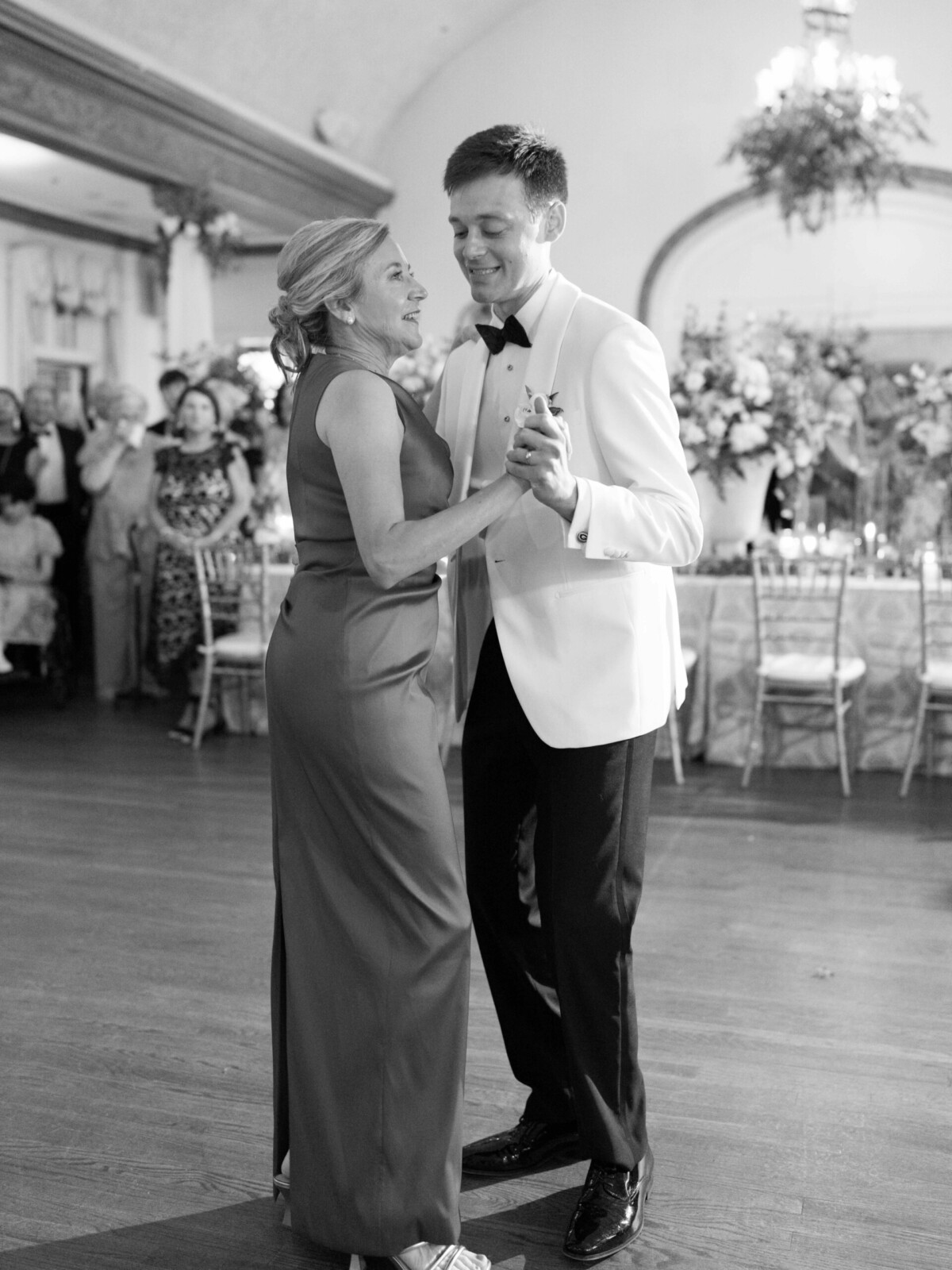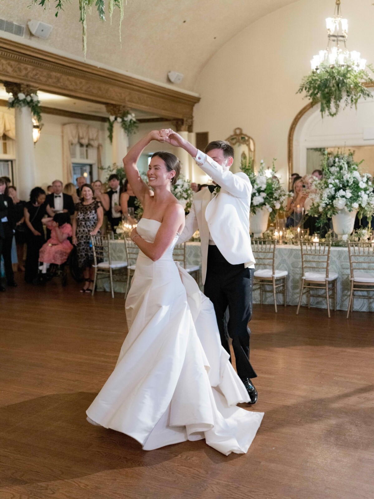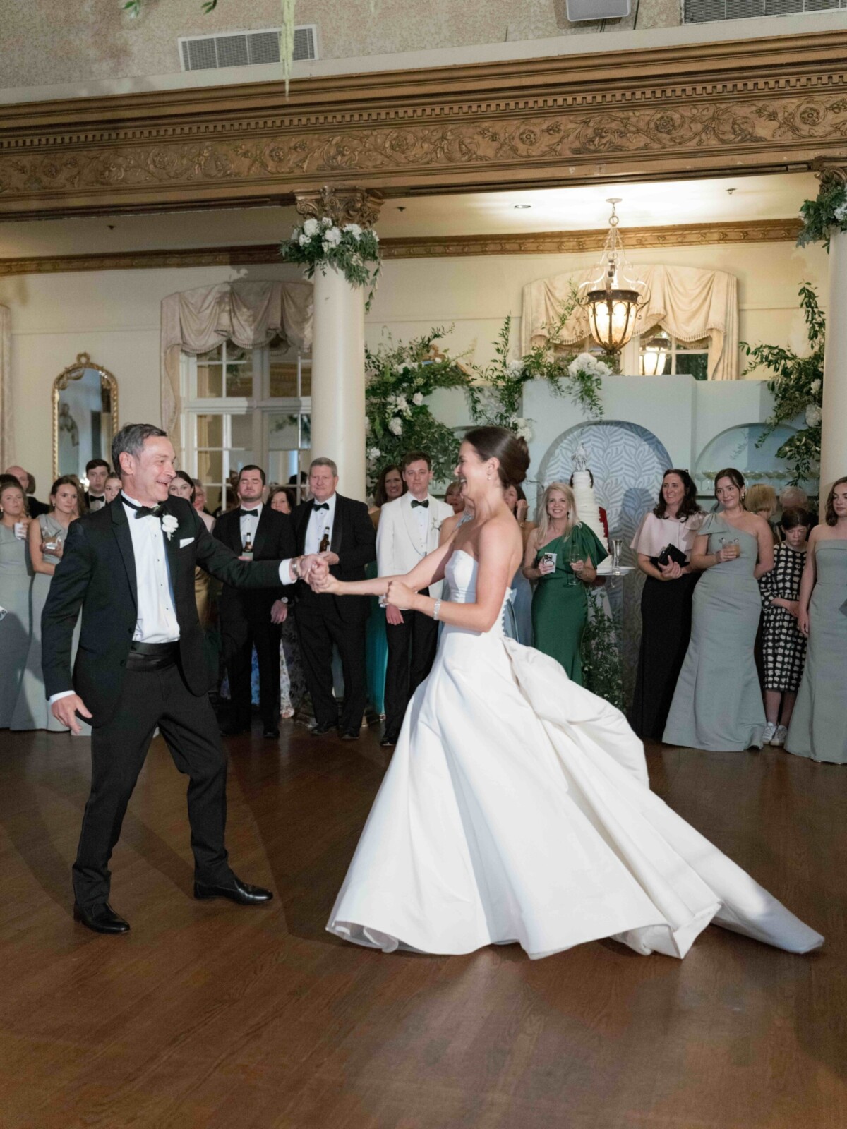 “God’s presence was palpable as we retreated back down the aisle, hand-in-hand as husband and wife,” says the bride. “While we were most excited to start our lives together as one, we were equally as thrilled to have all of our most cherished people gather collectively in celebration. As a couple, we believe that our greatest asset is our family. We are both lucky enough to come from rather large families. Our parents instilled in us a strong foundation of faith and deep understanding of unconditional, compassionate love. In effort to honor a lifetime of devotion, Weston and I opted to include a ‘first dance’ with both sets of our parents. We waltzed around the dance floor to ‘Fly Me to the Moon’ by Frank Sinatra, the same song my parents danced to on their wedding night.”