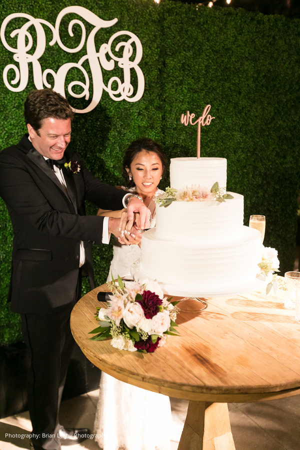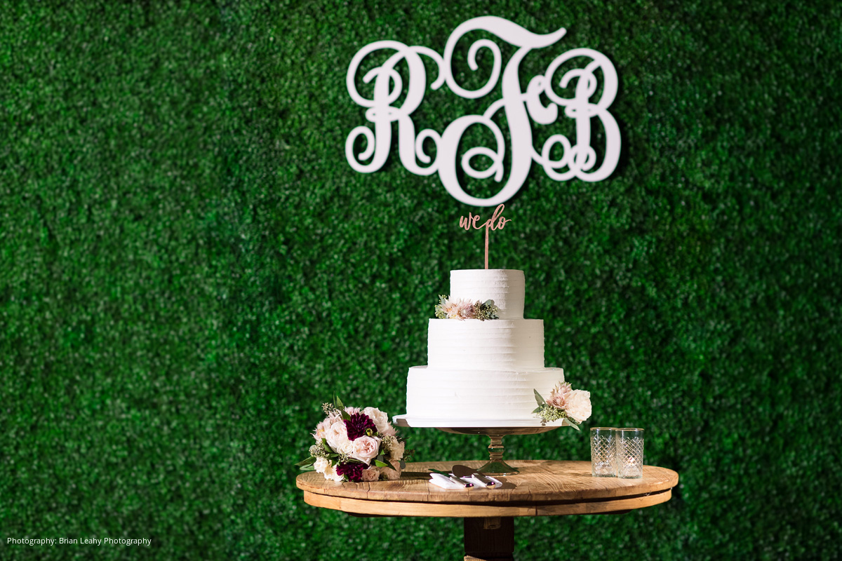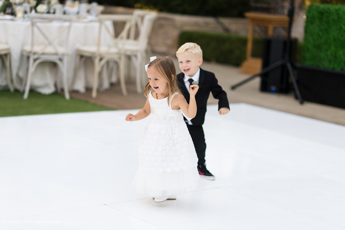 The ceremony was officiated by Brian’s uncle (who also married his father and stepmom), and a cocktail reception followed. For the reception, the bar, stage, and dance floor setup was laid out in a concert-like design, prompting guests to fill the dance floor before dinner was served. Guests enjoyed a menu of filet mignon, sea bass, and wine that was brought in by a renowned vintner who was in attendance. After the newlyweds’ first dance and a lineup of hilarious and loving toasts, the dance floor erupted for the rest of the night.