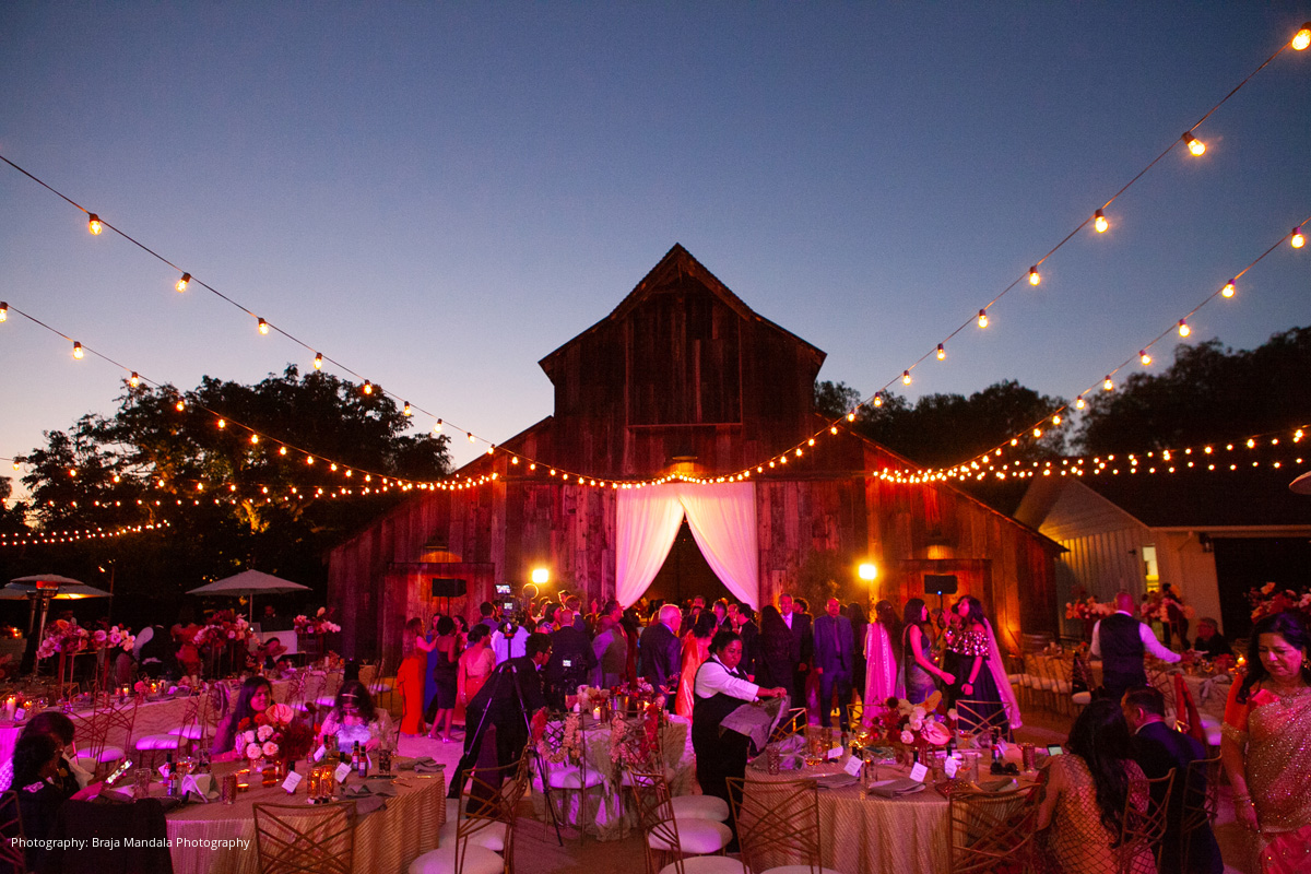The ceremony featured a simple wood mandap that was brought to life with vibrant, winding florals that created the perfect focal point without distracting from the natural surroundings. For the ceremony, the Greengate barn was transformed into an Old Hollywood-esque world with twinkling lights, a grand bar, and vintage furniture. Flowers, pops of red, and vintage gold glassware set the scene beautifully.