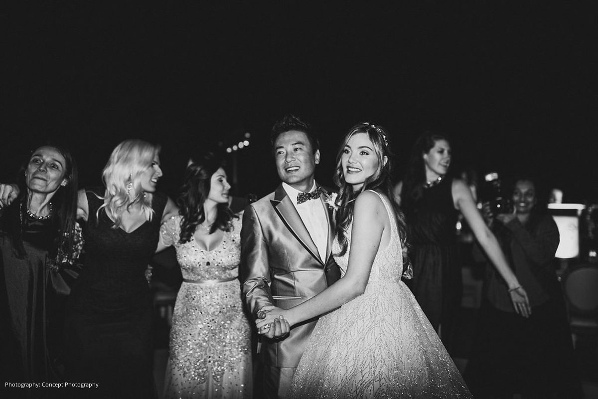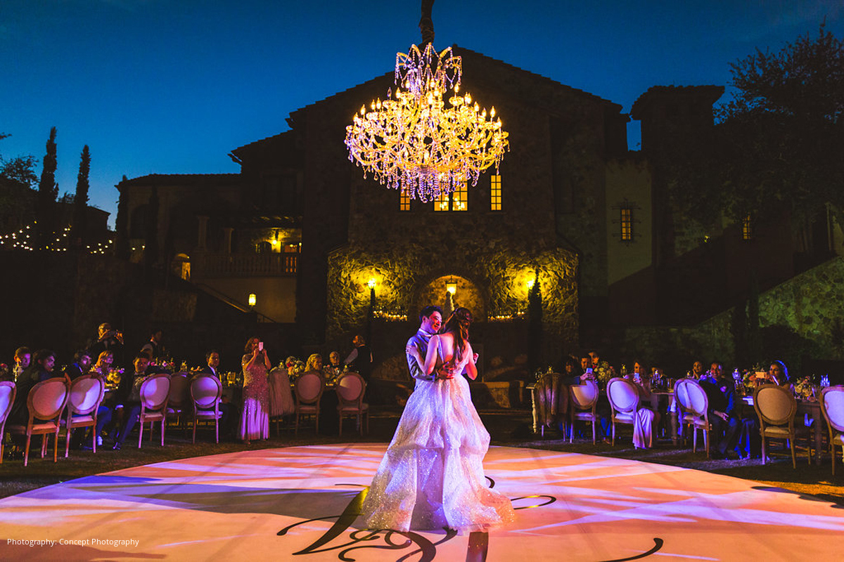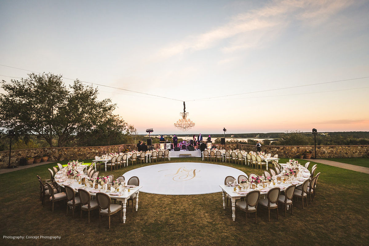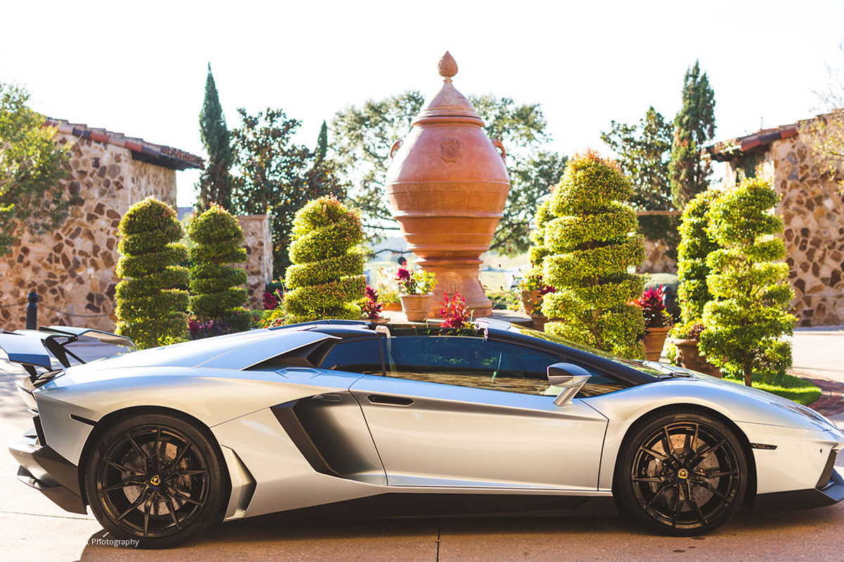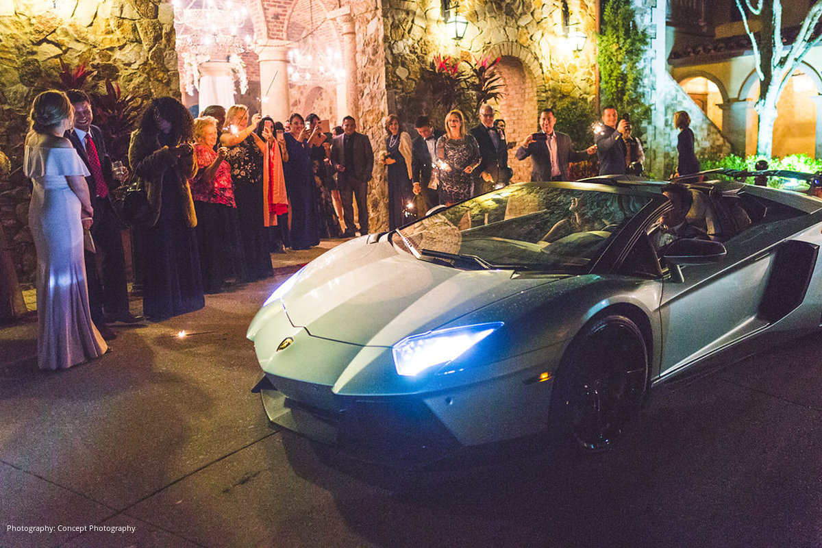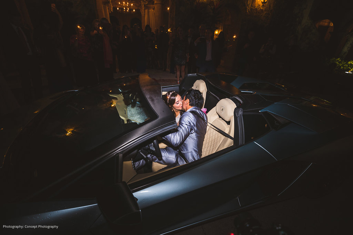 The following reception was lit by candles, fairy lights, and floating chandeliers. A round dancefloor and curved tables added to the intimacy of the space, and everyone celebrated throughout the evening with live music. At the end of the night, the newlyweds bid farewell with a sparkler exit, and drove off in a Lamborghini Aventador convertible.