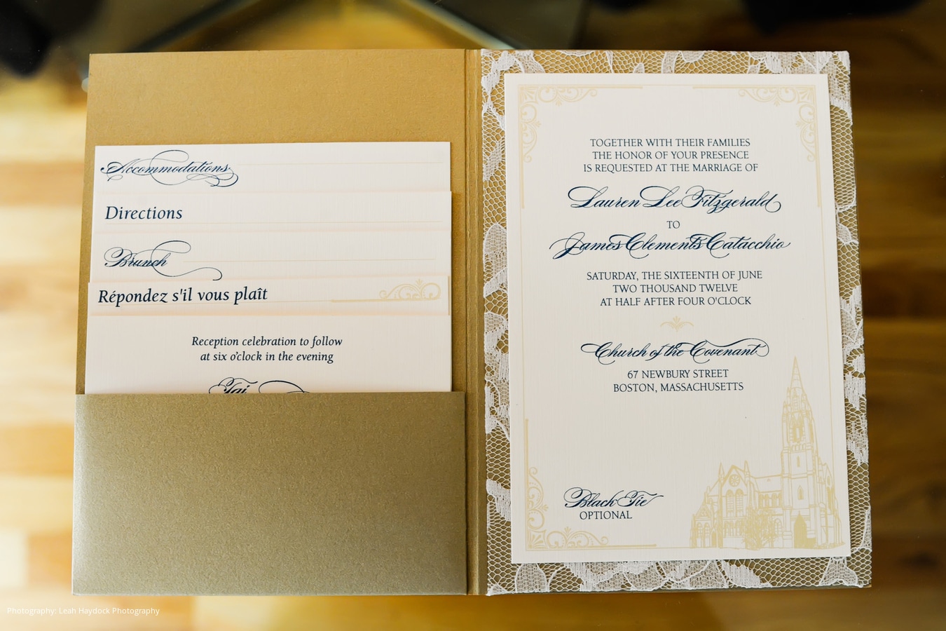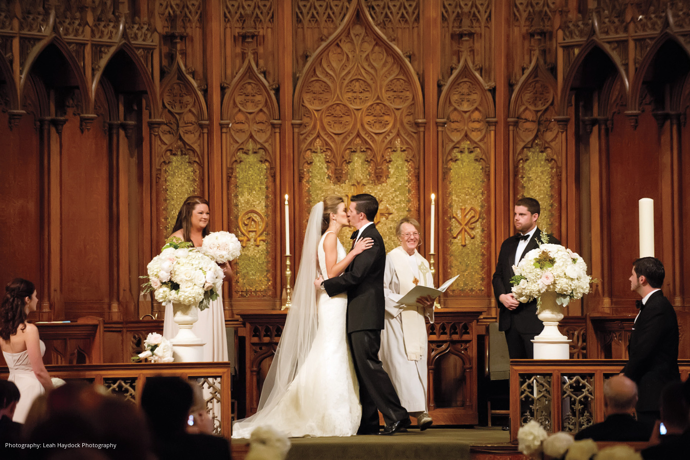Ceremony Location: Church of the Covenant, Boston, MA; Reception Location, Caterer, Cake, Event Design, Planner, Linen and Lighting: Taj Boston, Boston, MA; Floral Design: Bella Floral Design, Marion, MA; Rentals: Rentals Unlimited, Stoughton, MA; Stationery: Zenadia Design, Santa Barbara, CA; Photography: Leah Haydock Photography; Bride’s Dress: Vera Wang