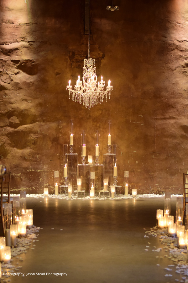 After the cocktail hour, curtains were parted to reveal the reception area. “It was absolutely jaw dropping,” says the bride. “Everyone was left breathless and it set the perfect ambiance.” Candles illuminated the entire space, and floral arrangements cascaded over each table, onto the floor. There were more than 6,000 blooms used in the wedding décor, chandeliers hanging above each table, and a floral installation with hanging tea lights above the head table. The table was also lined with French lace and a pearl applique border.