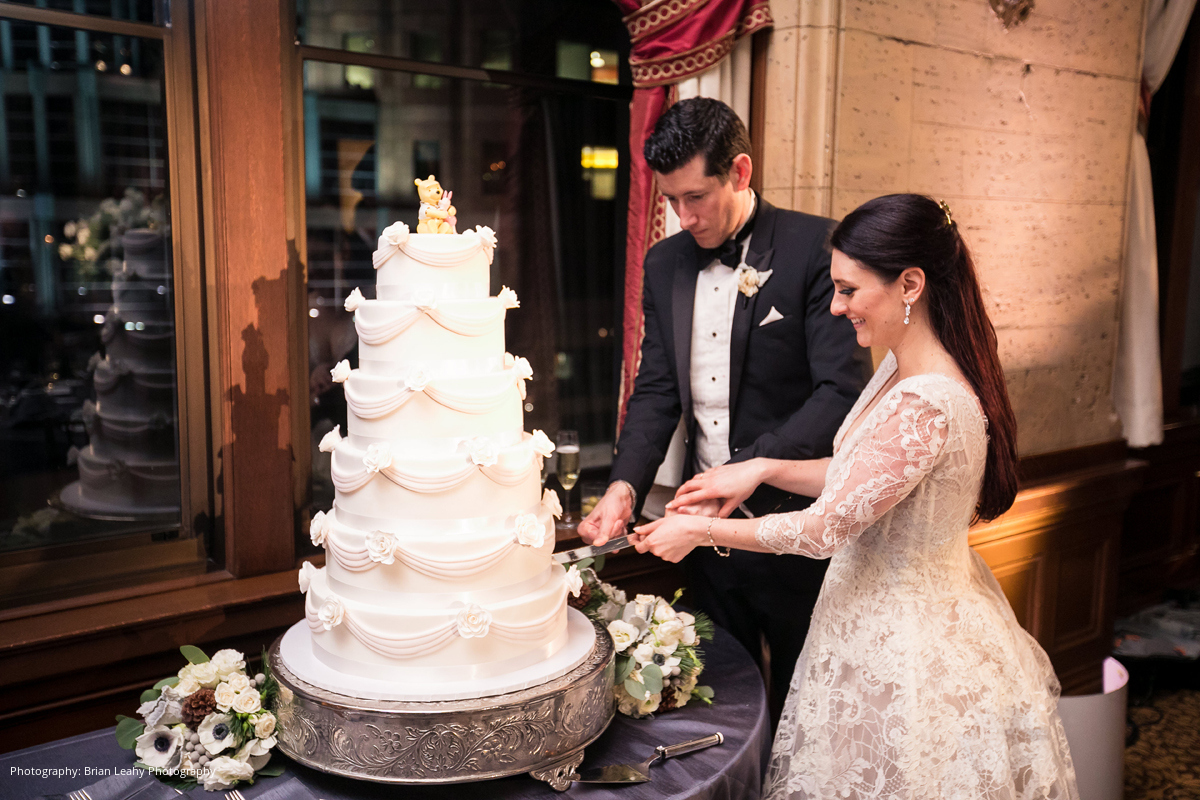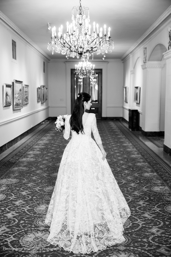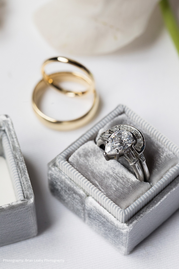 The bride wore something borrowed, blue, old, new, and even had an 1834 sixpence in her shoe – a relic from her father’s childhood coin collection. Erica wanted a wedding dress inspired by the one her mother wore, but her father was the one who found the winning gown. “I promised I’d try on anything he selected, and on his first try, he quietly dug this dress out of a mass of white dresses in the back of a showroom,” Erica recalls.