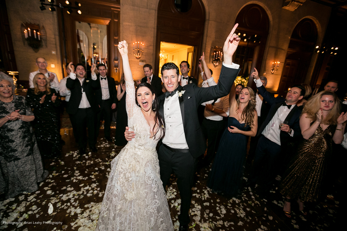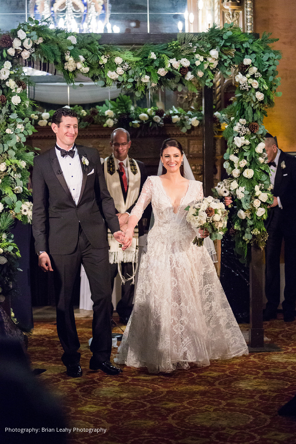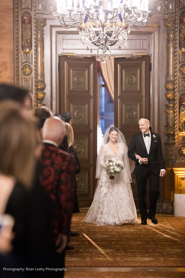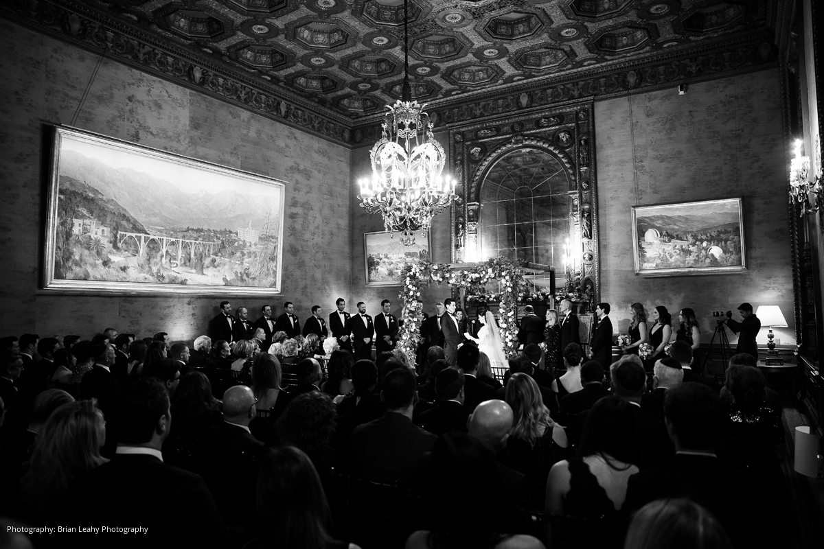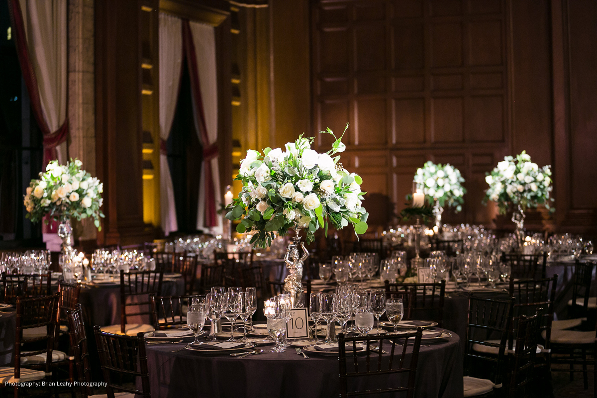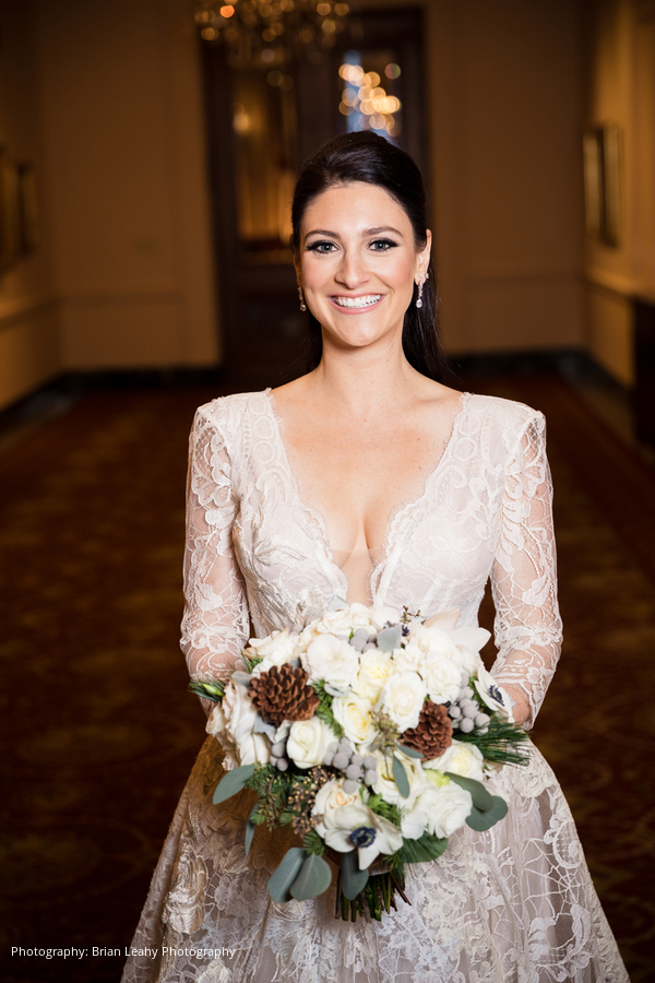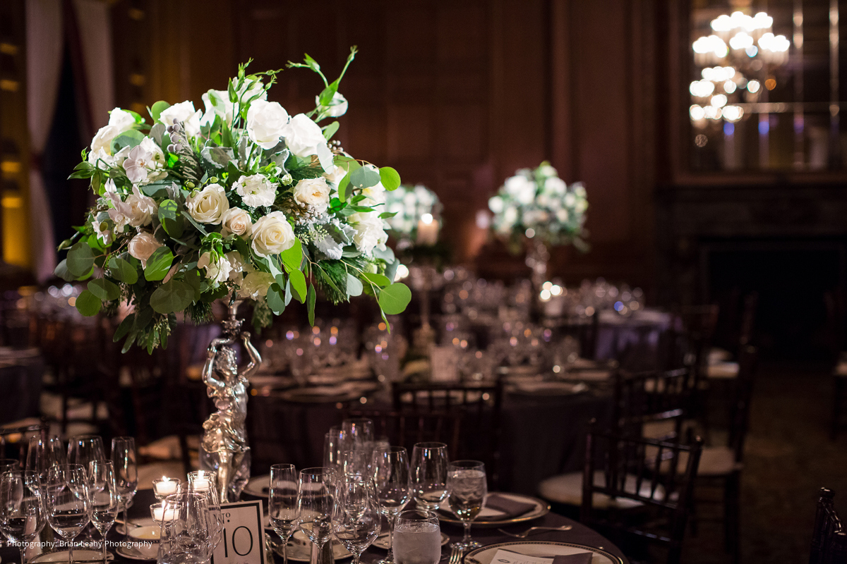 As true Los Angeles natives, Erica and Daniel wanted their wedding location to reflect the storied heritage of the city. Through her work with the Junior League of Los Angeles, Erica fell in love with the Jonathan Club. Partnering with Tessa Brand of Tessa Lyn Events, the wedding décor was designed to emphasize and complement the surroundings. “We wanted the wedding to fit the space, rather than change the space to fit a certain kind of wedding,” Erica shares. “We wanted our guests to look at the space and know it was a January wedding. It’s not often that you attend a winter wedding, and we wanted to embrace it.”