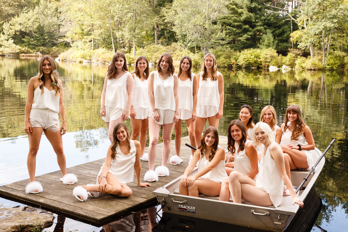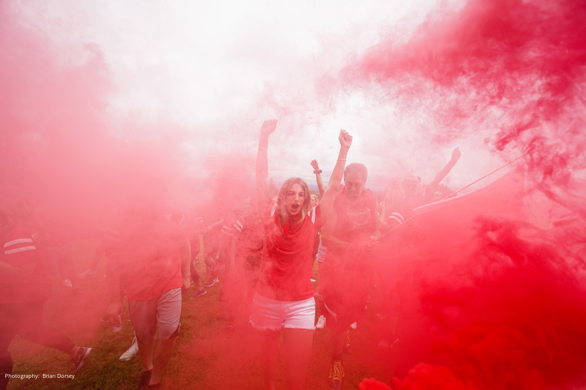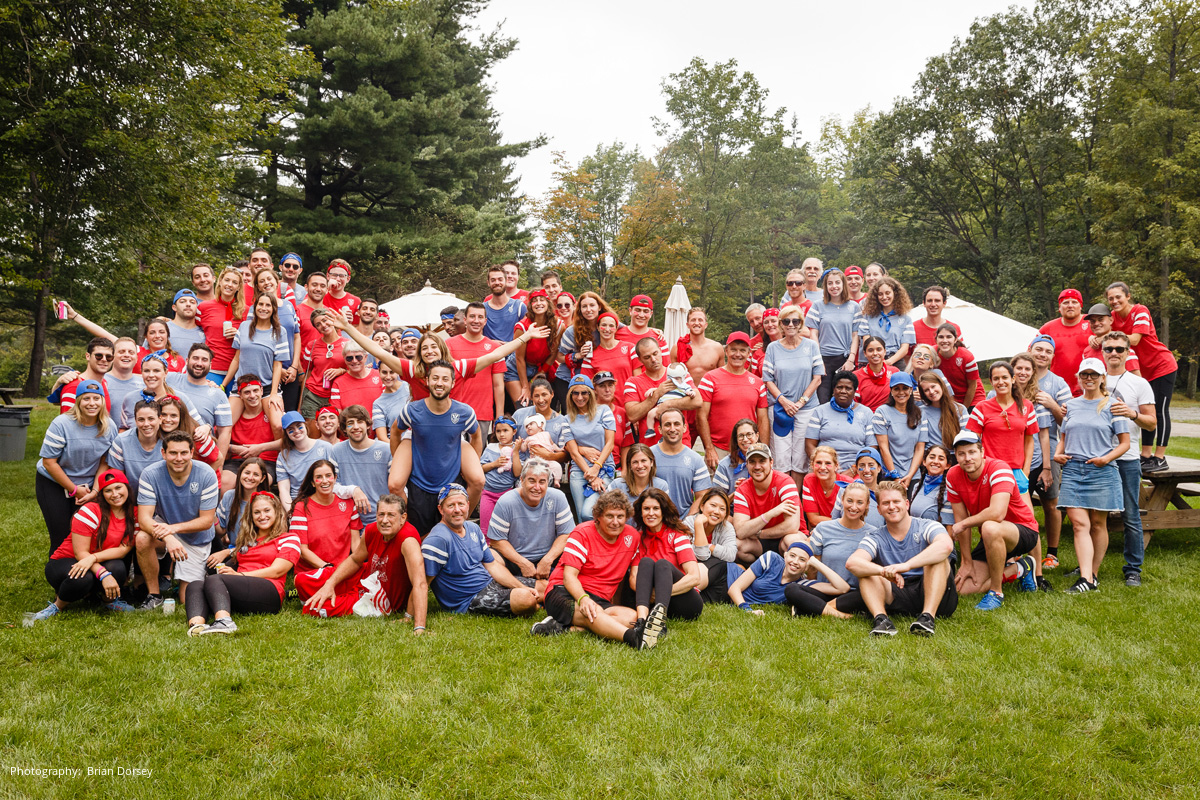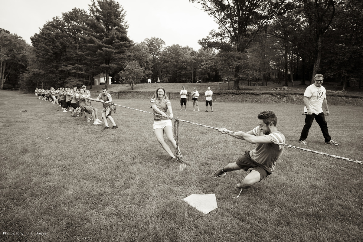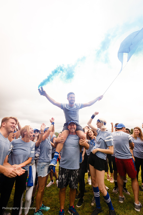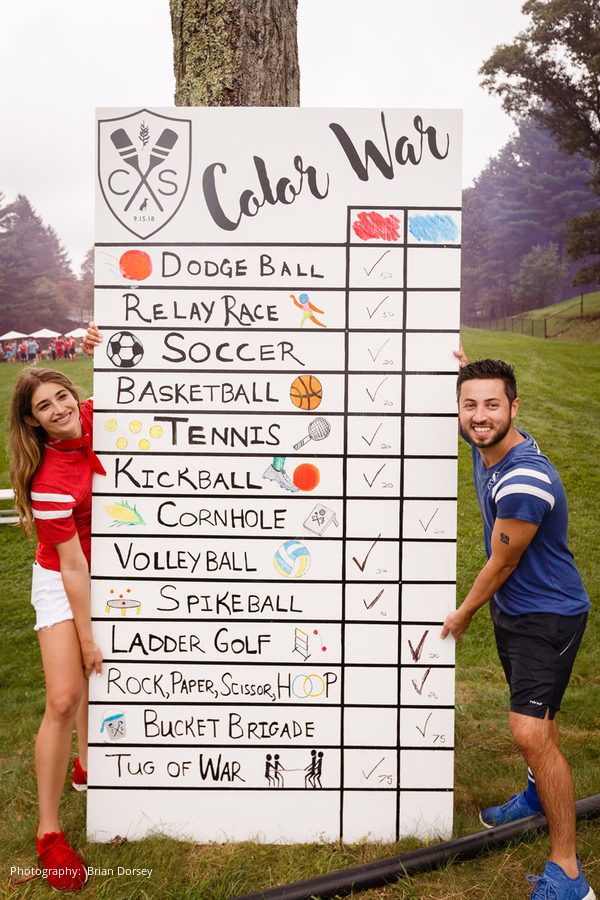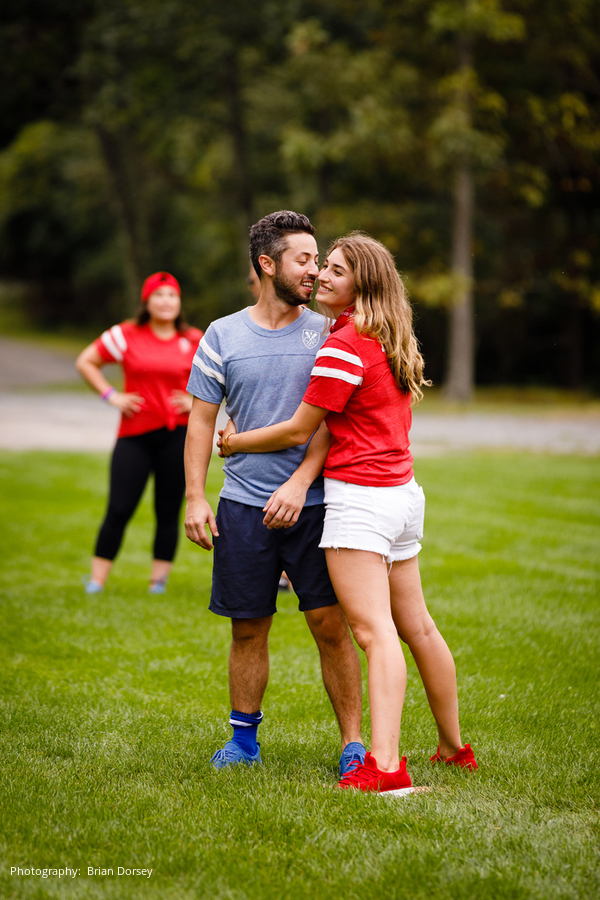 On Friday, the couple’s friends joined them for lunch and semi-competitive games. Everyone was gifted with custom name pillows on their bed, along with t-shirts with their nicknames in their respective color-war team color. After lunch, smoke bombs were lit as they marched to the playing fields for an afternoon of dodging, throwing, catching, running, and laughing. It was as if they were 12-year-old campers again.