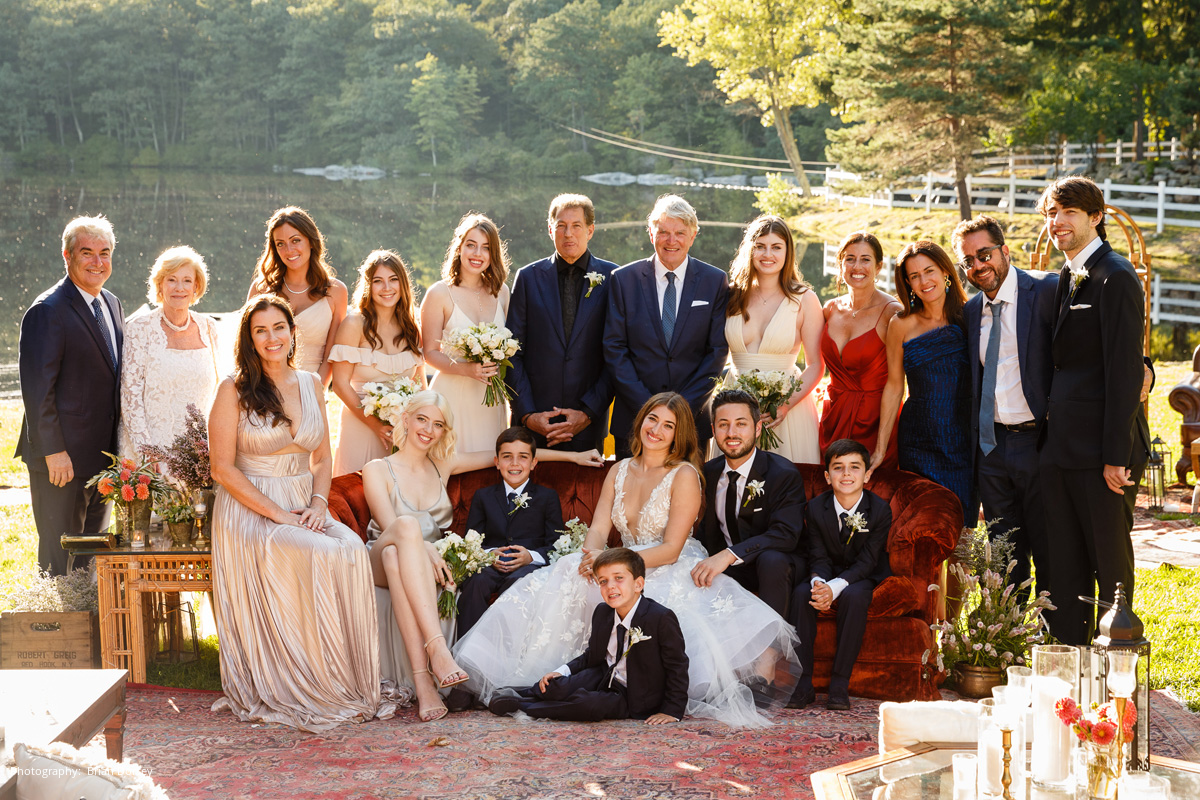 The bride’s favorite part of the wedding weekend was the ceremony, during which a waterside clearing in the woods was transformed into an enchanted fairy tale forest. She walked down the aisle to music that was composed and pre-recorded by her father, and each keepah was handknit by her grandmother.