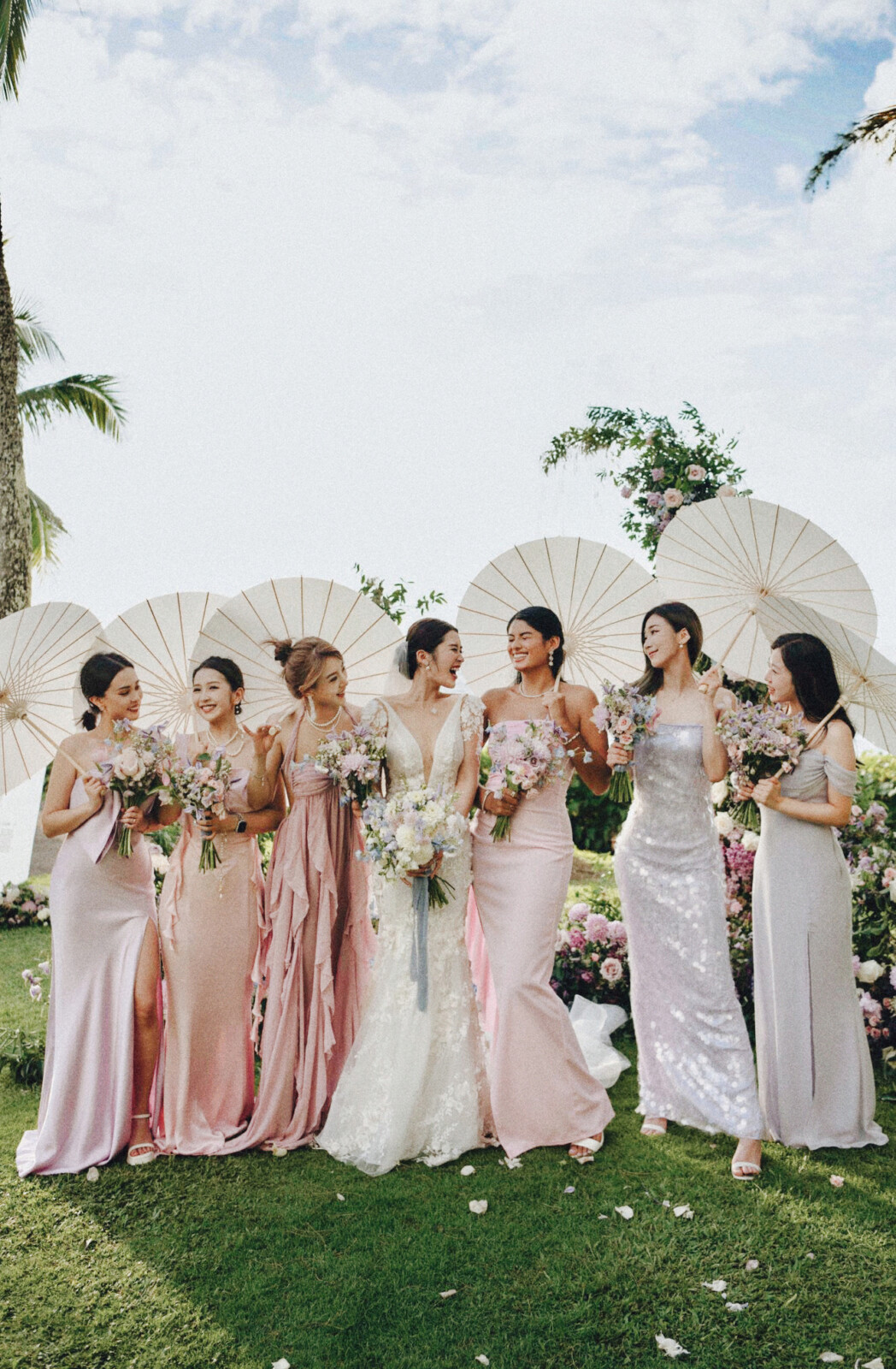 Leo exuded classic charm in a Dior tuxedo and loafers, transitioning to a more relaxed yet refined Loro Piana look for the reception. The bridal party, dressed in dreamy shades of pink and purple, reflected the pastel elegance woven throughout the event. Irene encouraged her bridesmaids to choose their own gowns, ensuring everyone felt confident and beautiful.