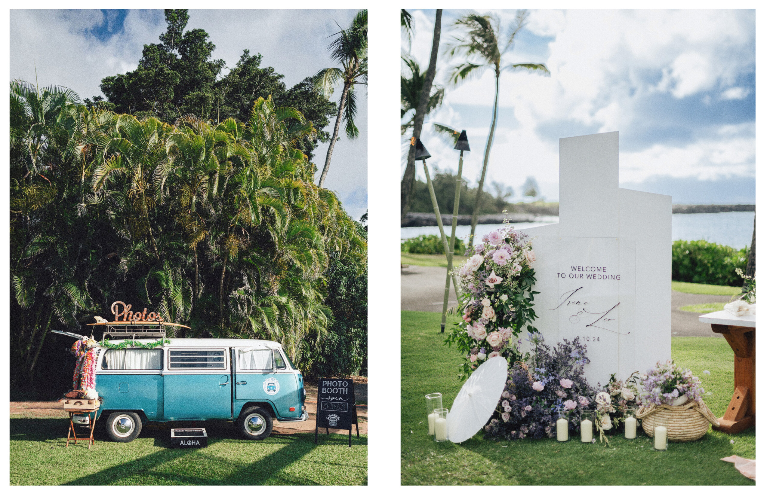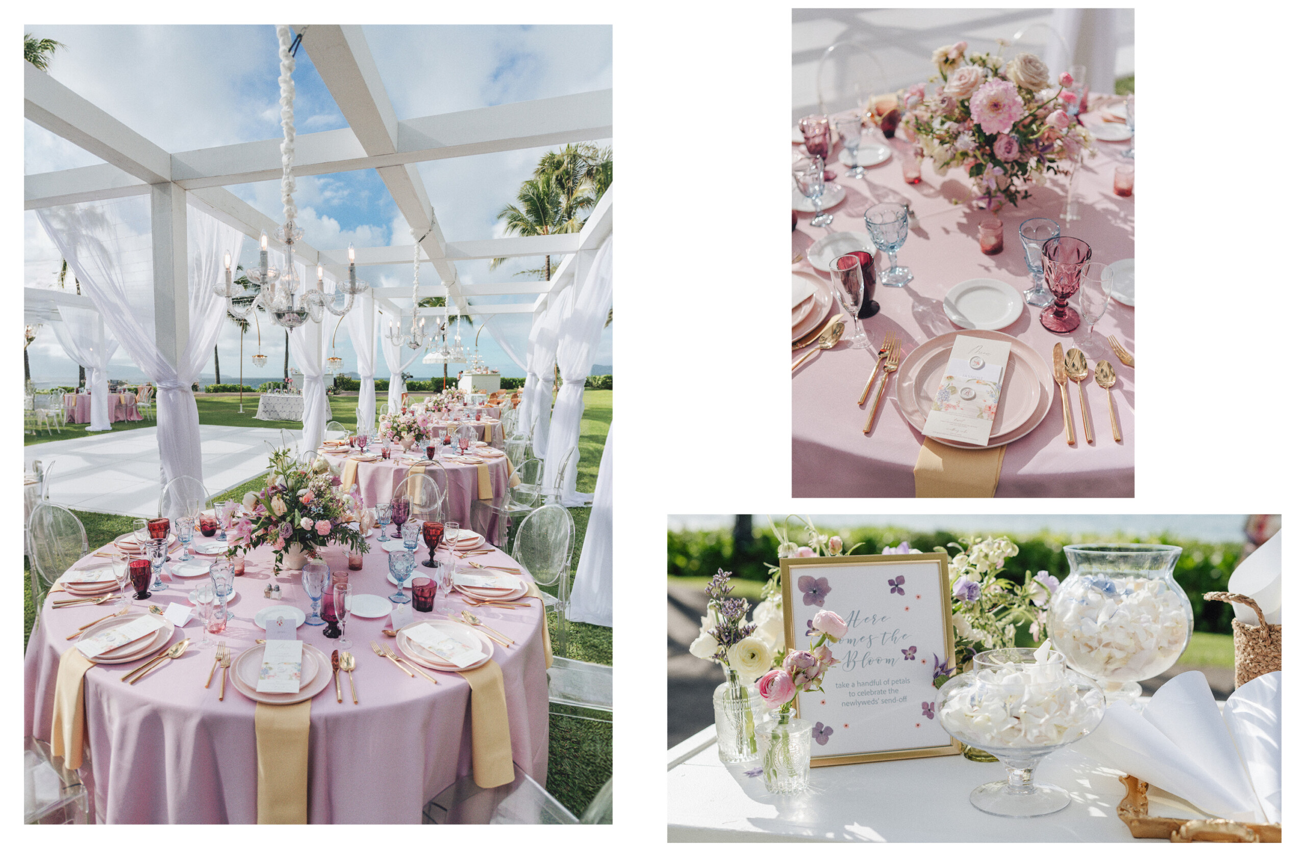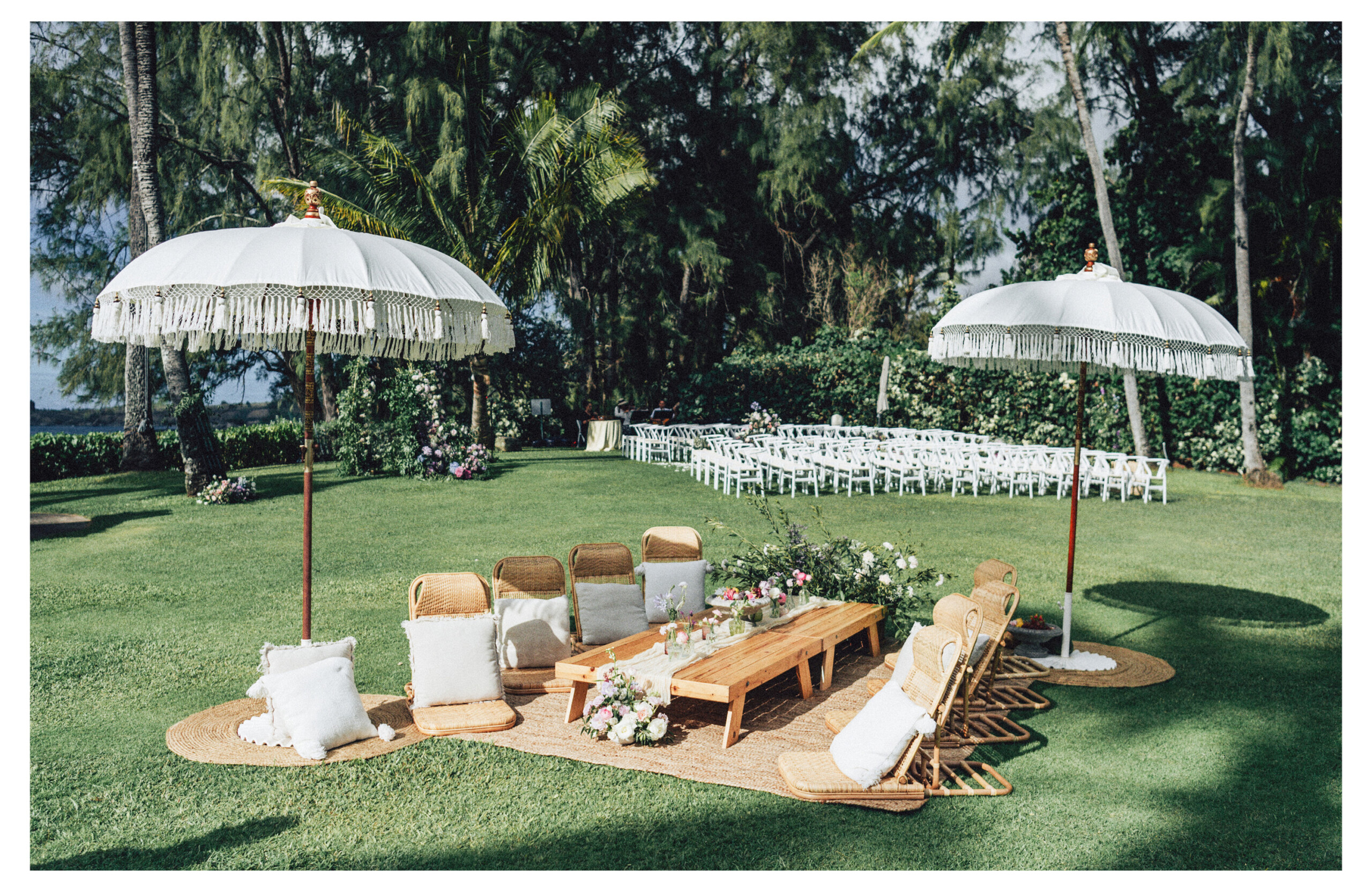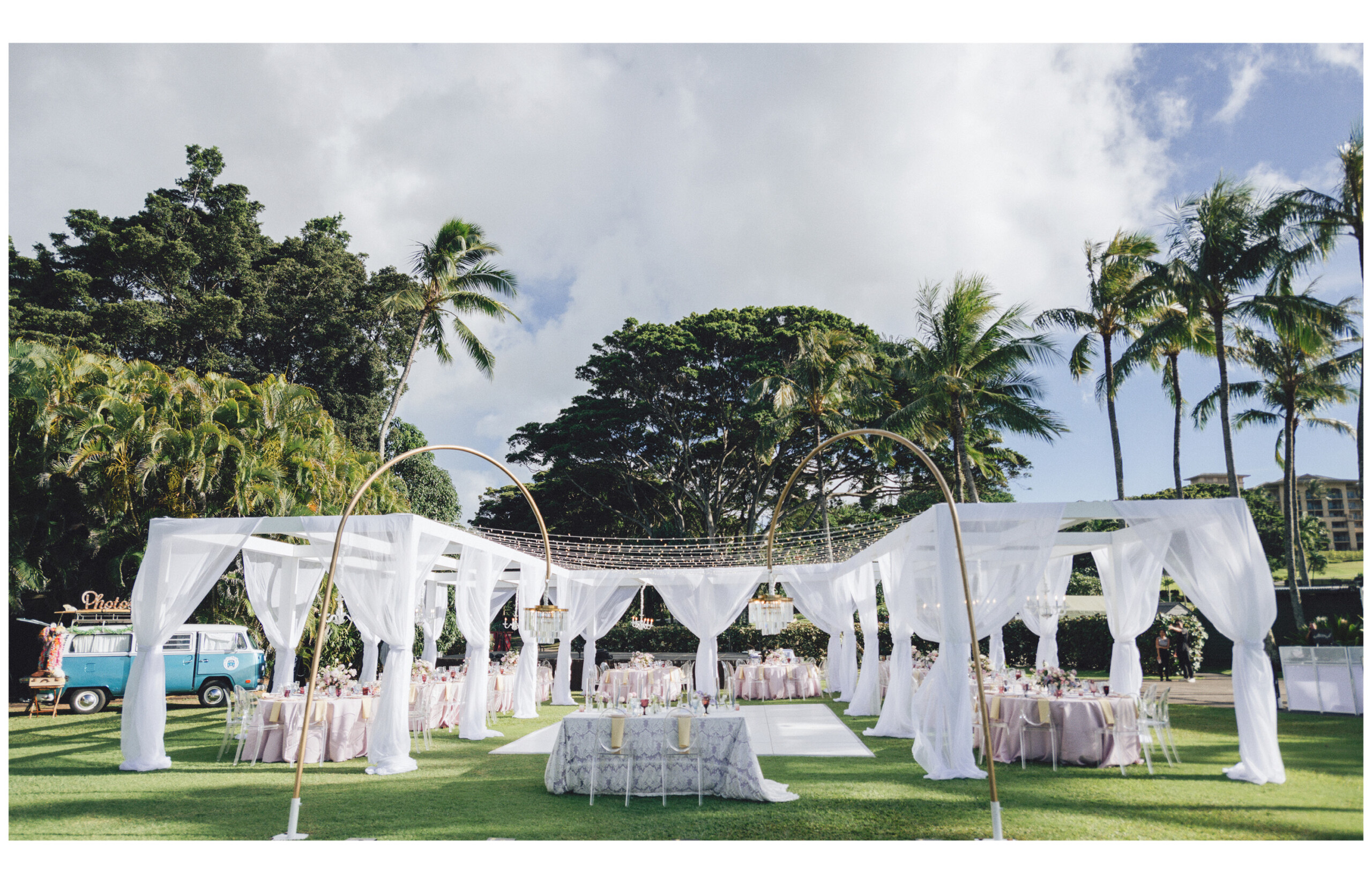 Location: The Ritz-Carlton Maui, Kapalua, Maui, Hawaii; Event Planner & Design: Manna Sun Events; Floral Design: Dellables Floral Artistry; Rentals: BBJ La Tavola Linen, Let's Entertain Maui, Set Maui, Maui Luxe Picnics; Wedding Dress: Galia Lahav; Makeup: Abbie Chung; String Trio & DJ: Manutea Nuie; Officiant: Fred Torres; Stationery: Miss B Calligraphy, Inkinity Studio; Photo Bus: The Maui Photo Bus; Videography: Kenson Production; Photographer: Daqi Vision
