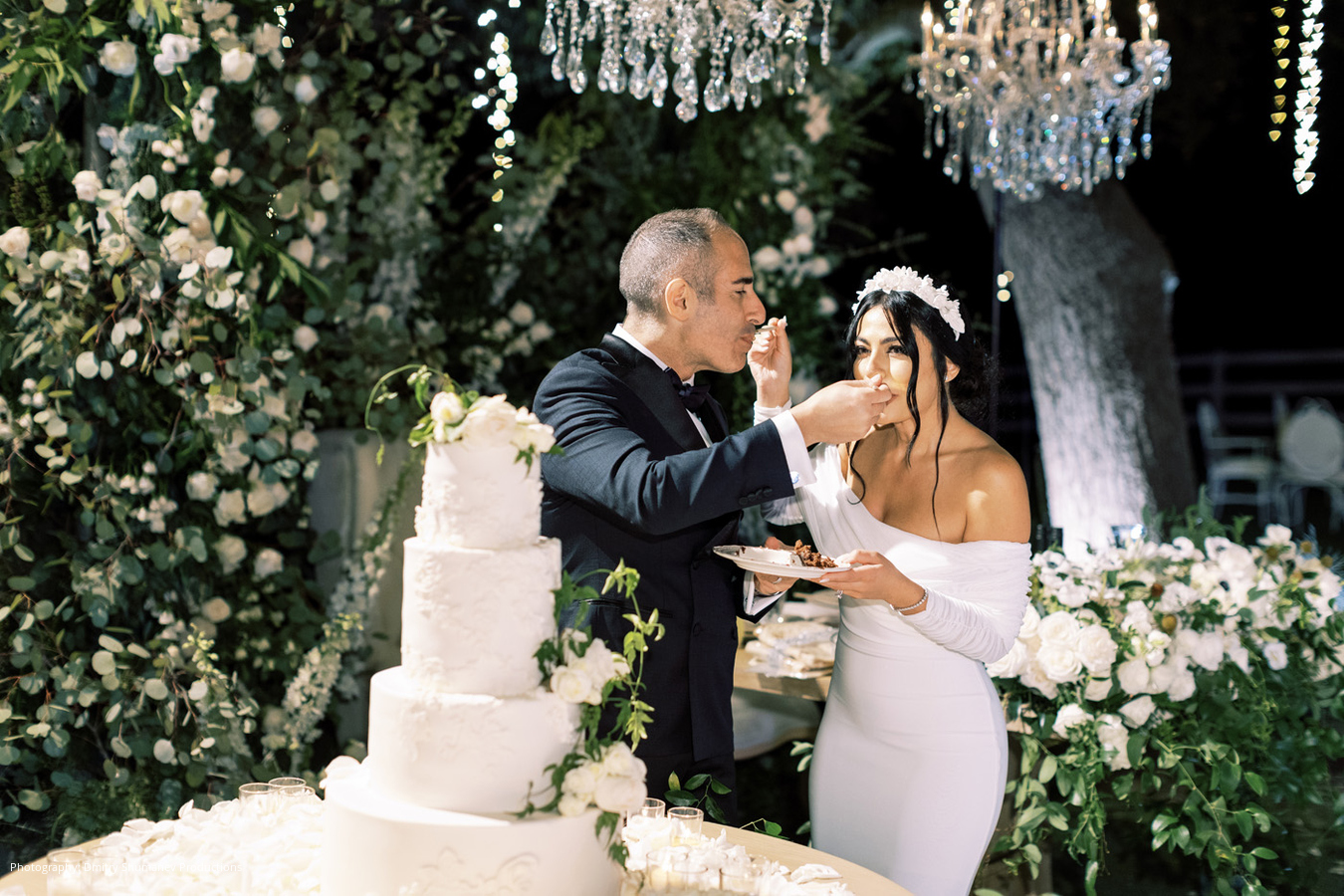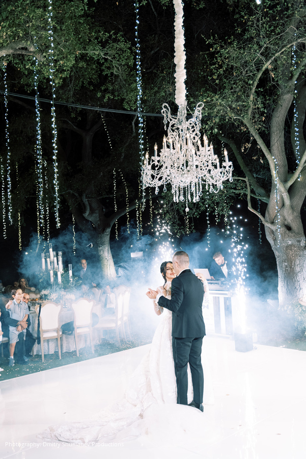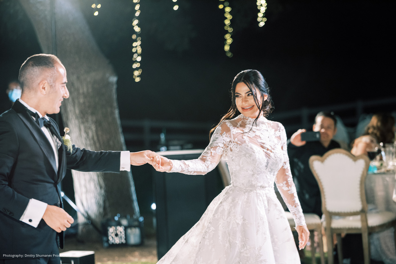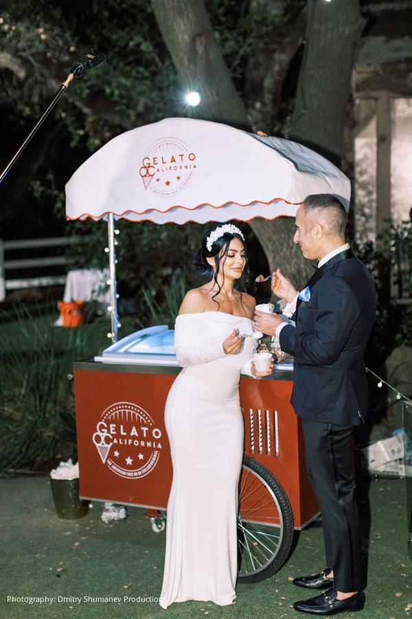 The wedding décor included white roses, romantic tablescapes, and a beautifully lit ambiance. Catering was provided by Lady Bug, along with custom cocktails from Crystal Bartenders. As gelato lovers, the bride and groom made sure plenty of ice cream was served alongside a wedding cake from the Butter End, and guests enjoyed themselves while dining beneath chandeliers and a summer night’s sky.