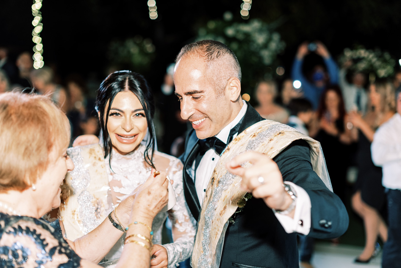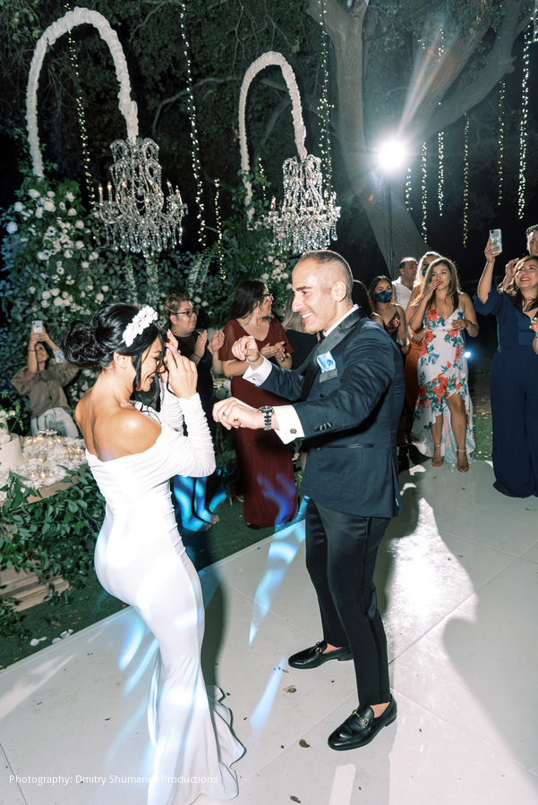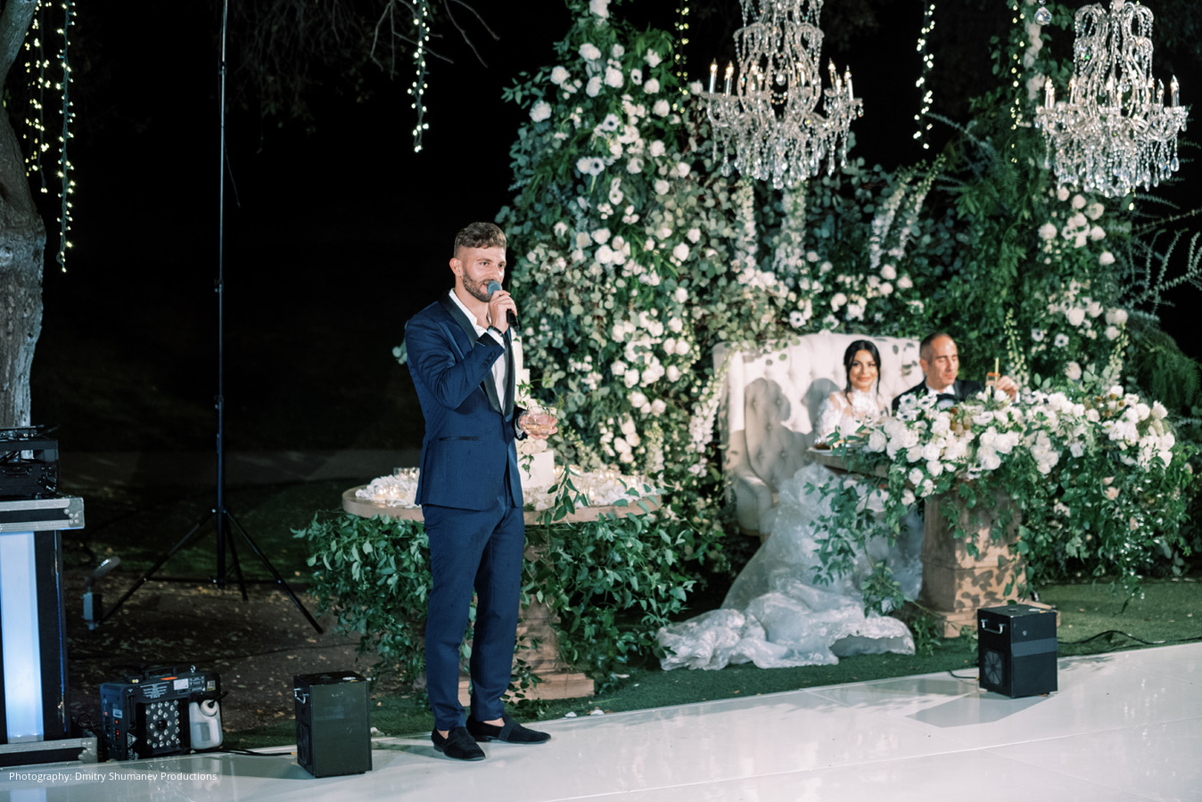 The wedding décor included white roses, romantic tablescapes, and a beautifully lit ambiance. Catering was provided by Lady Bug, along with custom cocktails from Crystal Bartenders. As gelato lovers, the bride and groom made sure plenty of ice cream was served alongside a wedding cake from the Butter End, and guests enjoyed themselves while dining beneath chandeliers and a summer night’s sky.