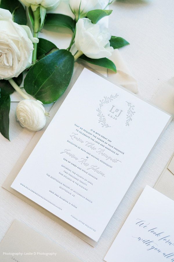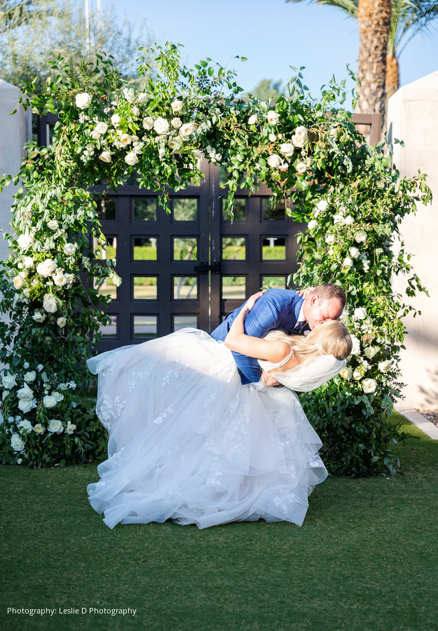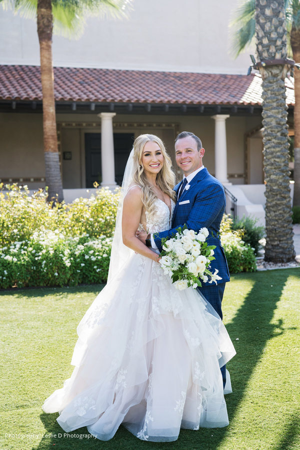 “April 4, 2020, was meant to be our original wedding date,” Lauren shares, “as the fourth day of the fourth month adds up to eight, representing infinity. However, the novel coronavirus threw a curveball into our plans, as Arizona was under a strict lockdown. We were able to pivot with the support of our fantastic wedding planner, Mandy Marie Creative, our wonderful vendors, and The Scottsdale Resort at McCormick Ranch.