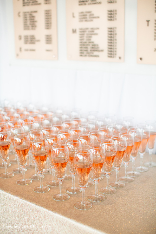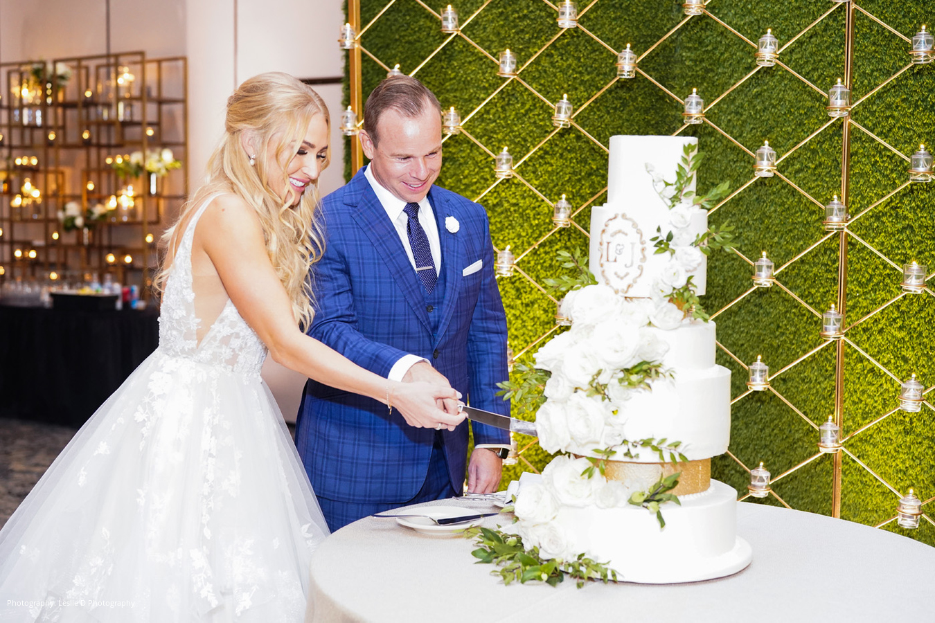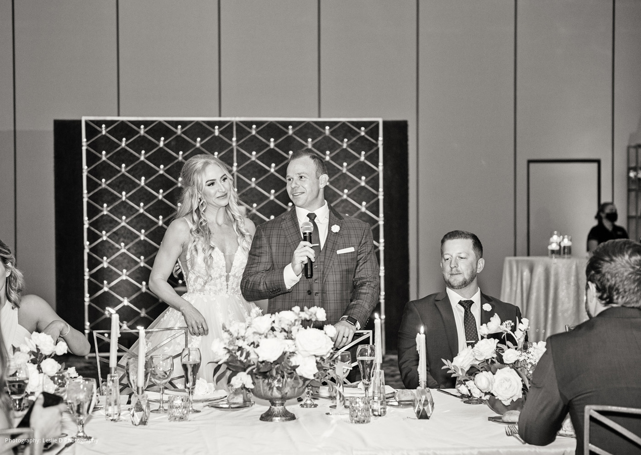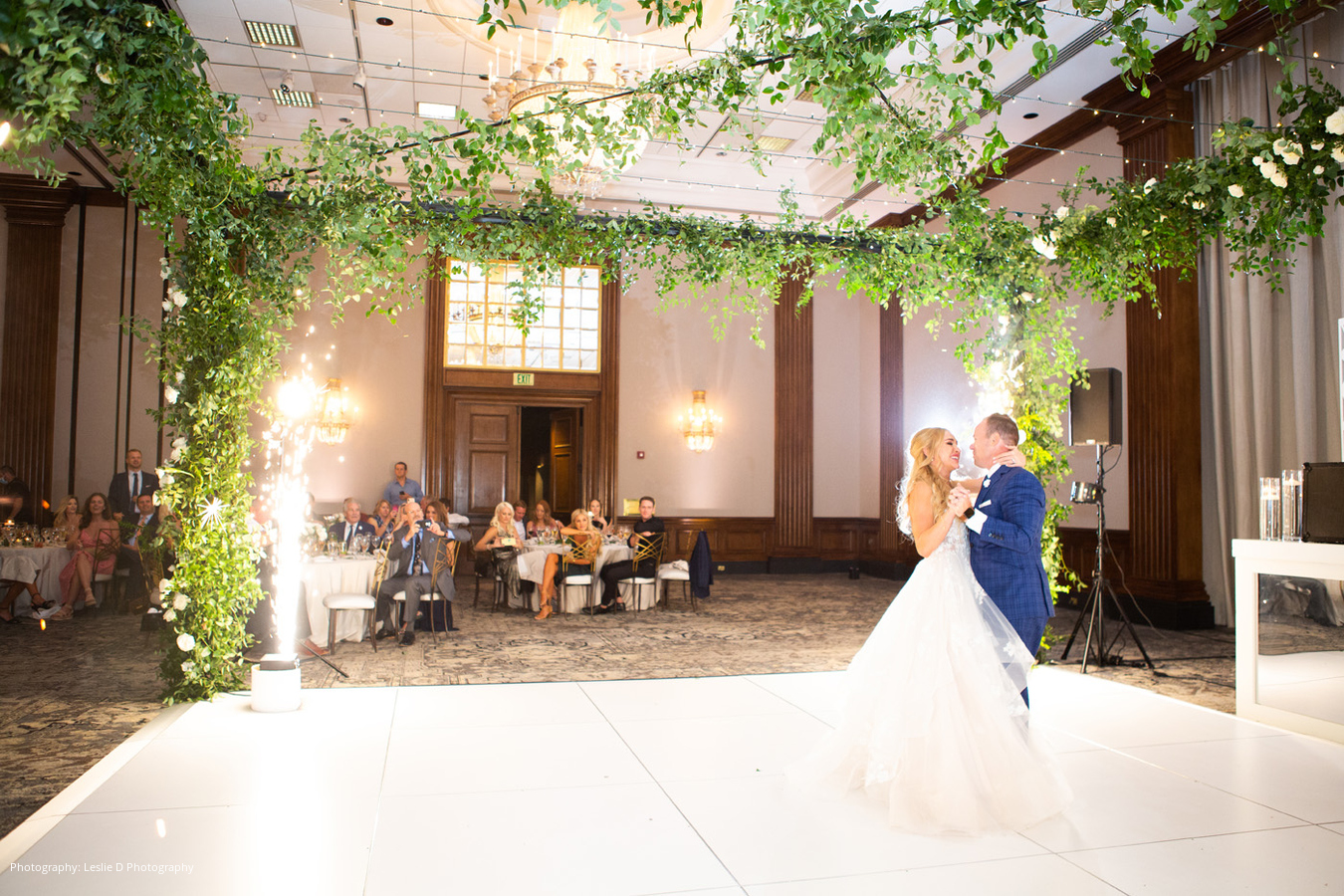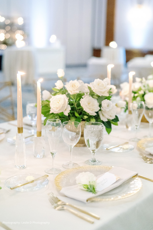 When the big day arrived, a violinist serenaded the bride and groom as they had their first look under an arch of white roses and greenery. They laughed and cried as they read their vows privately to each other and said, “I do,” and the couple made sure to enjoy each moment of their intimate September wedding. Later that evening, a ballroom reception unfolded with white florals and candlelight, perfectly captured by Leslie D Photography.