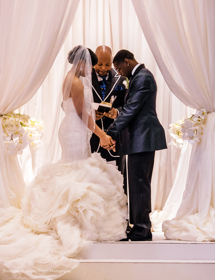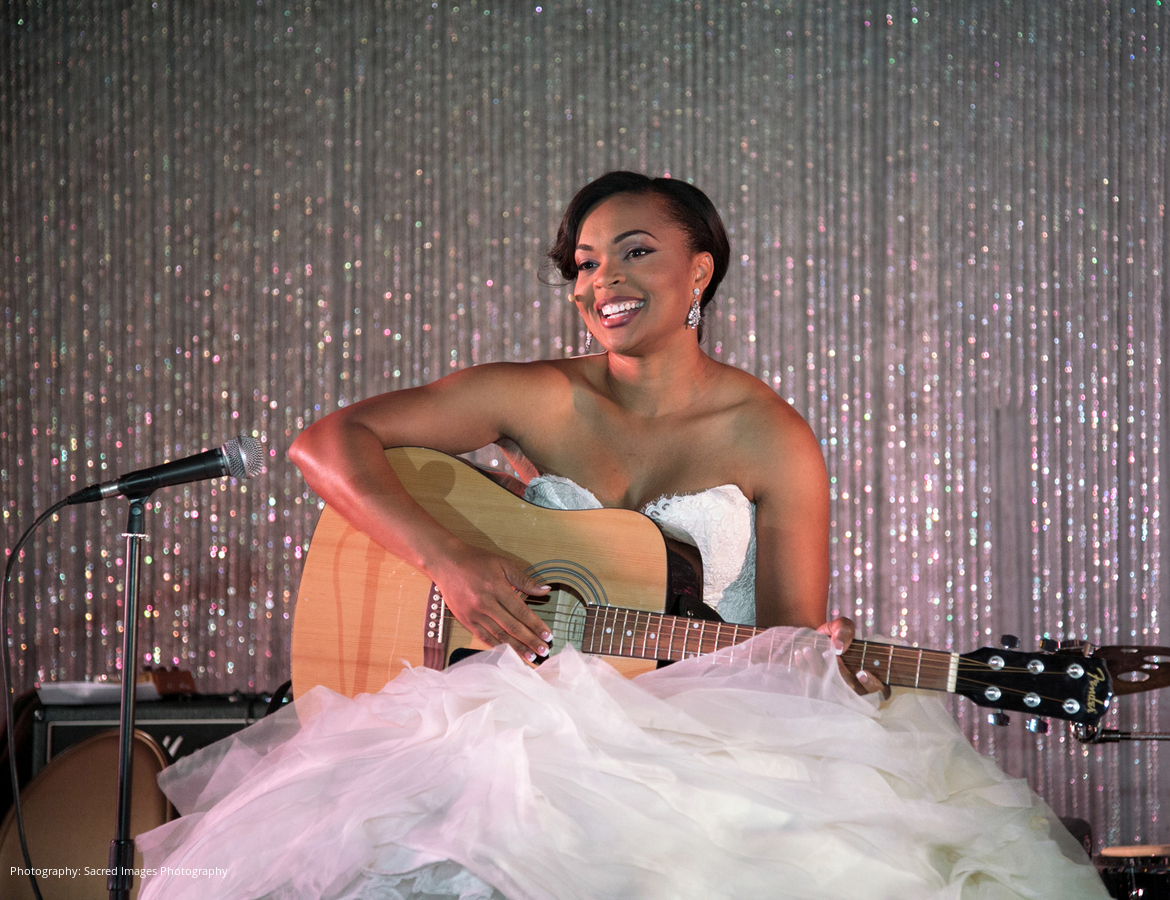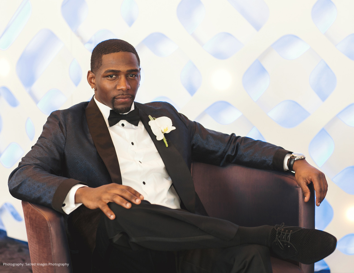 Once they decided to host their wedding at Union Station in Dallas, Texas, all the other details fell into place. With Brice’s main concern being the wedding attire, he selected a blue tuxedo jacket by Louis Vuitton for himself, along with custom navy suits for the groomsmen. Meanwhile, Andrea spent six months learning how to play the guitar Brice had given her, because she wanted to surprise him at the wedding.
