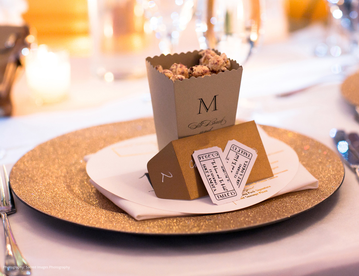 The tone of the wedding was first set with save the date cards that looked like a movie poster, a wedding website that mimicked the look of a movie site, and formal gold letterpress invitations. At the wedding venue, the first floor check-in area was designed to look like a vintage theater entrance with marquee posters and a wooden ticket booth. From there, guests were given programs that looks like large vintage movie tickets, and sipped champagne as they entered the second-floor ceremony room with an 80-foot aisle.