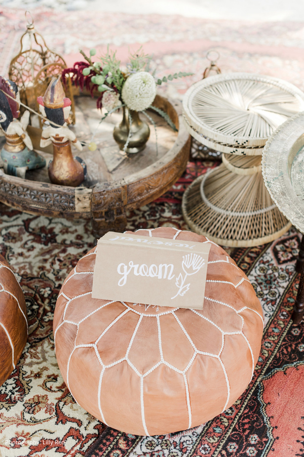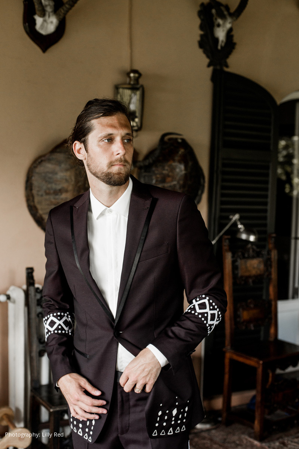 The couple spent nearly two years enjoying their engagement, and truly taking in every moment of the wedding planning process. “Our non-traditional vision gave us the opportunity to create unique aspects of the day, to really make it ours,” Ashley describes. “Being in the fashion industry, we both wanted to give our guests a glamorous, runway-esque experience. I created the bridesmaids’ gowns with warmer tones in mind, complete with pearled capes, luxurious silks, and topped with gold crowns. The groom and groomsmen modeled embroidered tuxes; and designing my own wedding gown was something I knew would be my pride and joy – complete with dramatic veils and 100% ivory silk, of course.”