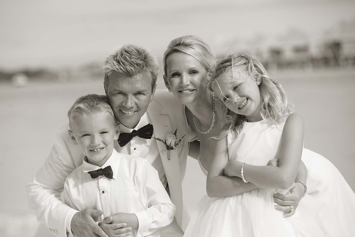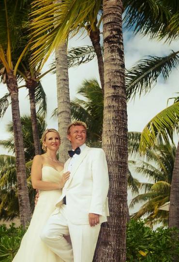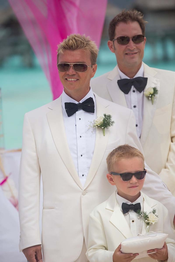 The wedding planning process was assisted by wedding planner, Marie Perrier at the Four Seasons Bora Bora, who helped bring the couple’s vision to life. It was a perfect day in the tropics when Robert and Sharon took their vows on a beach surrounded by friends and family. A string quartet played, shells and flowers lined the aisle, and the couple’s children were the flower girl and ring bearer.