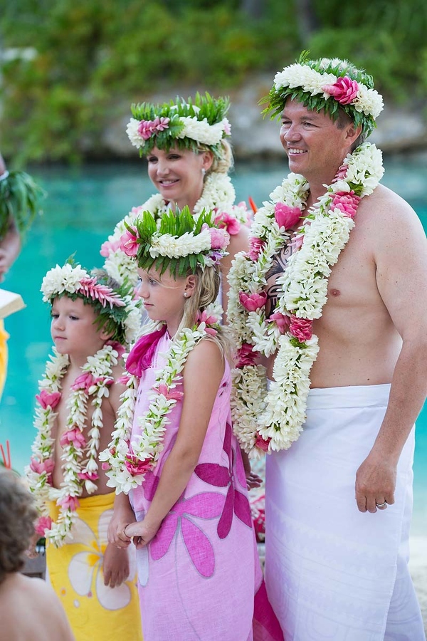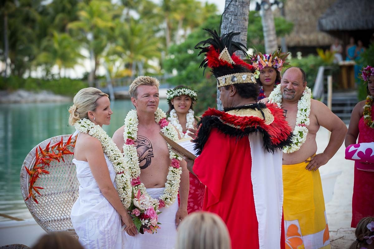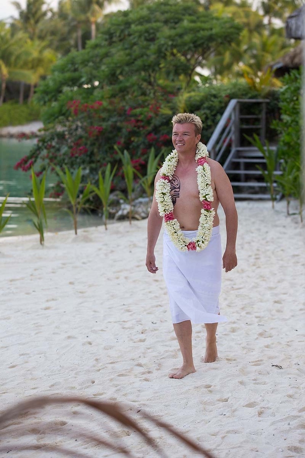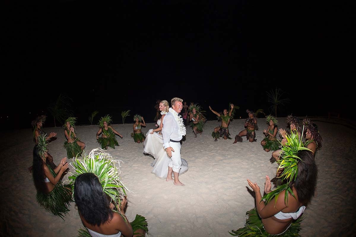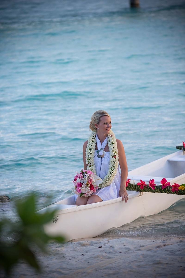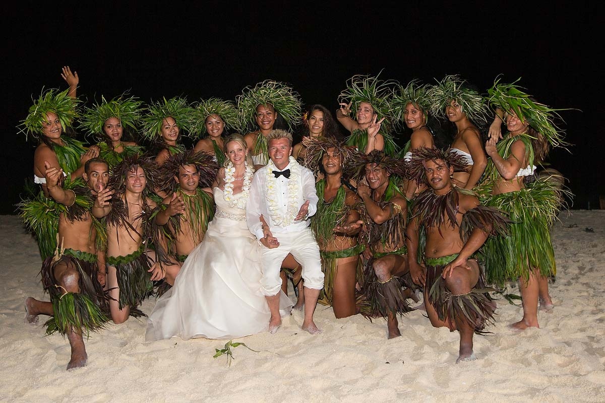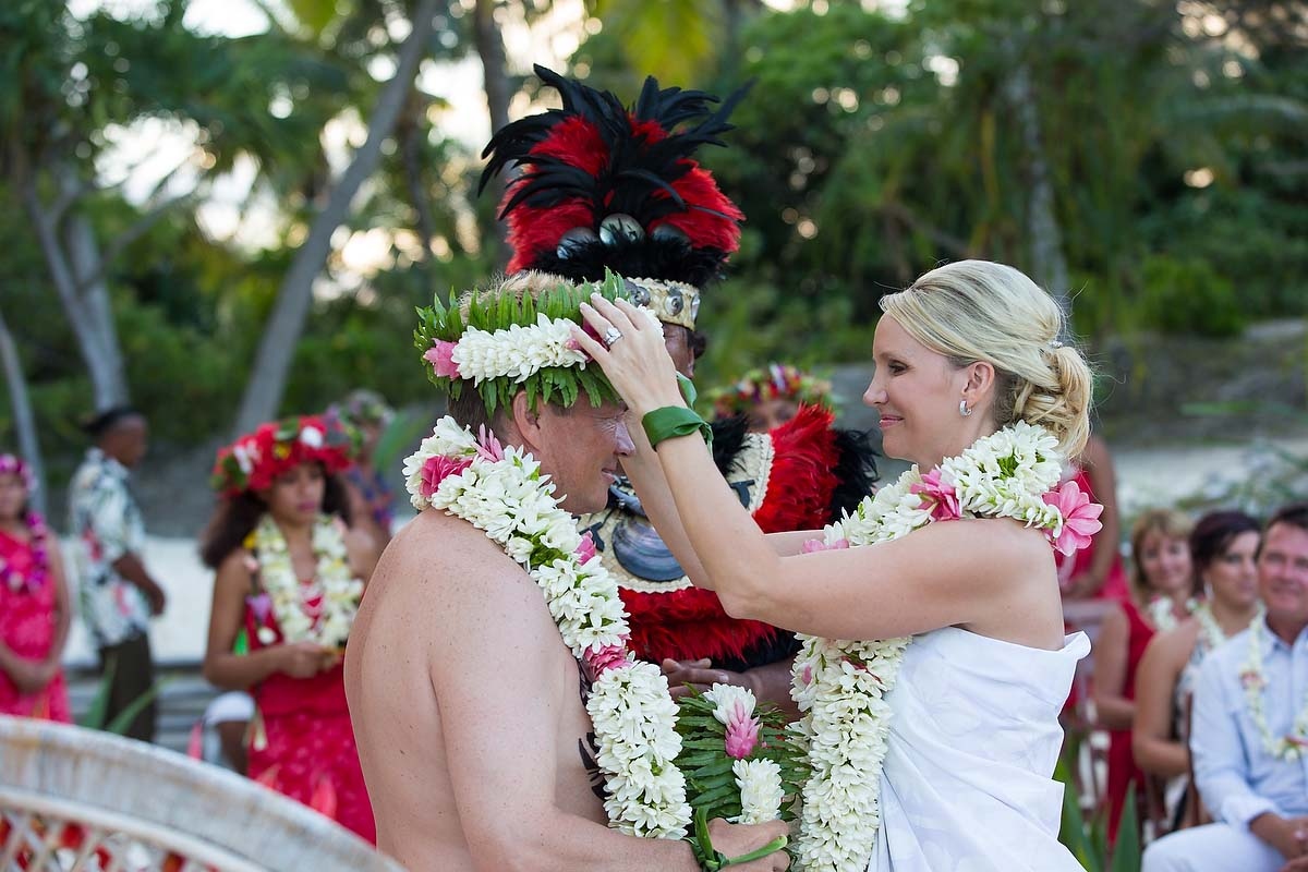 Later that day, the couple’s unsuspecting guests were treated to an elaborate Polynesian wedding celebration, arriving at the site to the pounding of Polynesian tribal drums and dancers. The sound of conch shell horns filled the air as the bride was escorted across the lagoon in a Polynesian outrigger canoe, ready to be presented to her husband and a warrior priest.