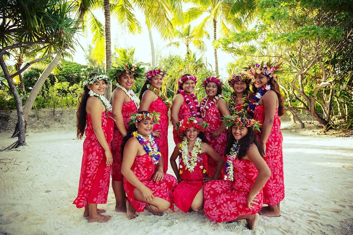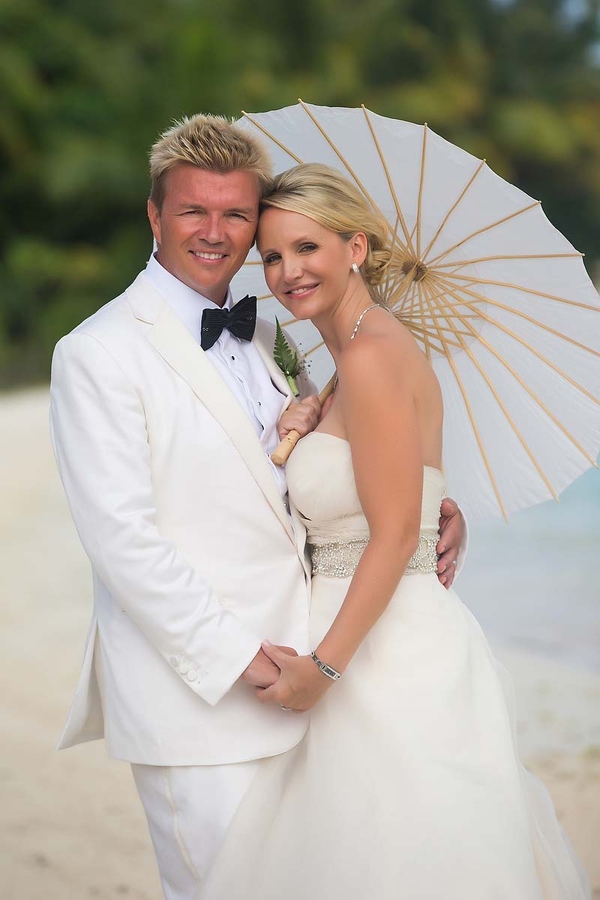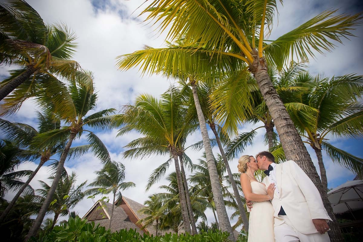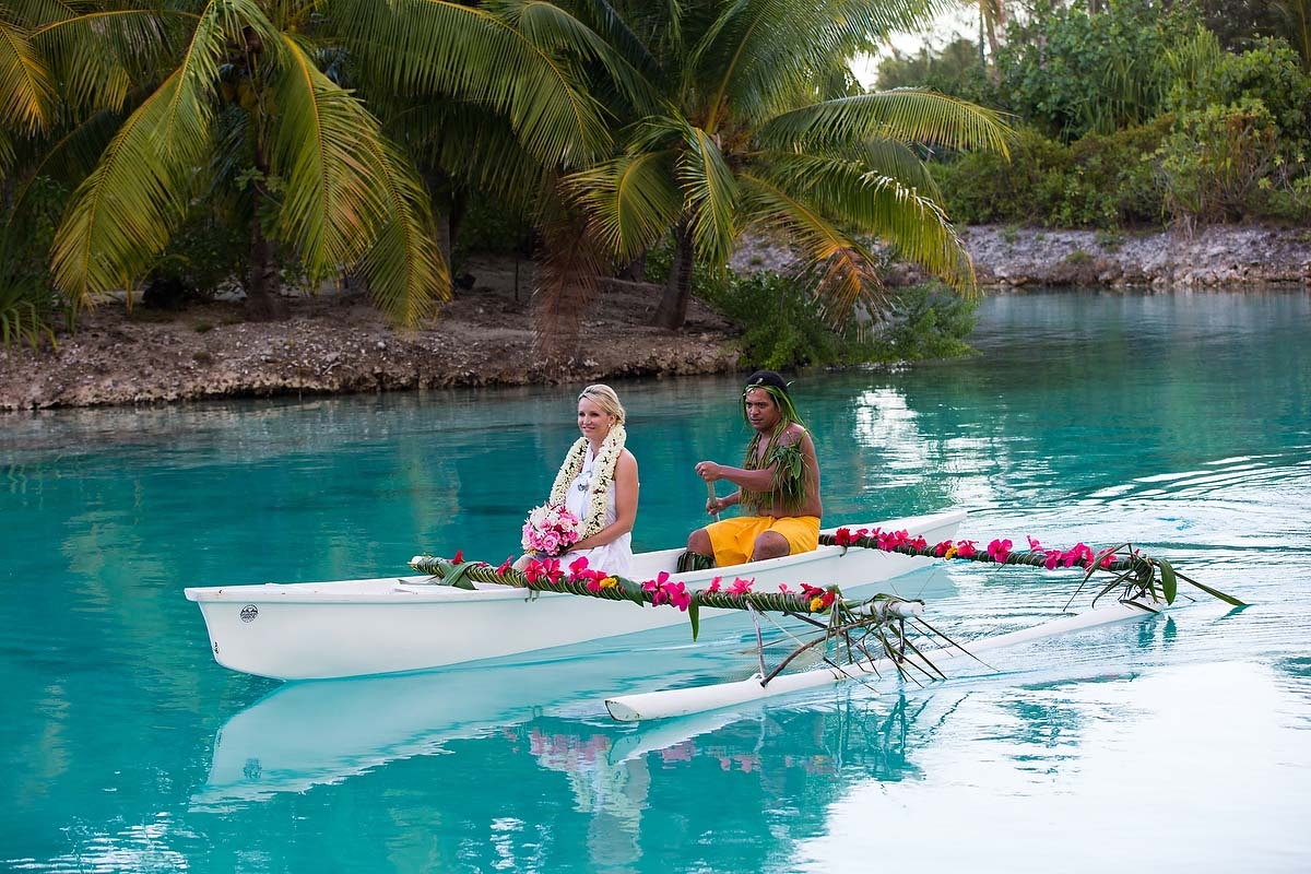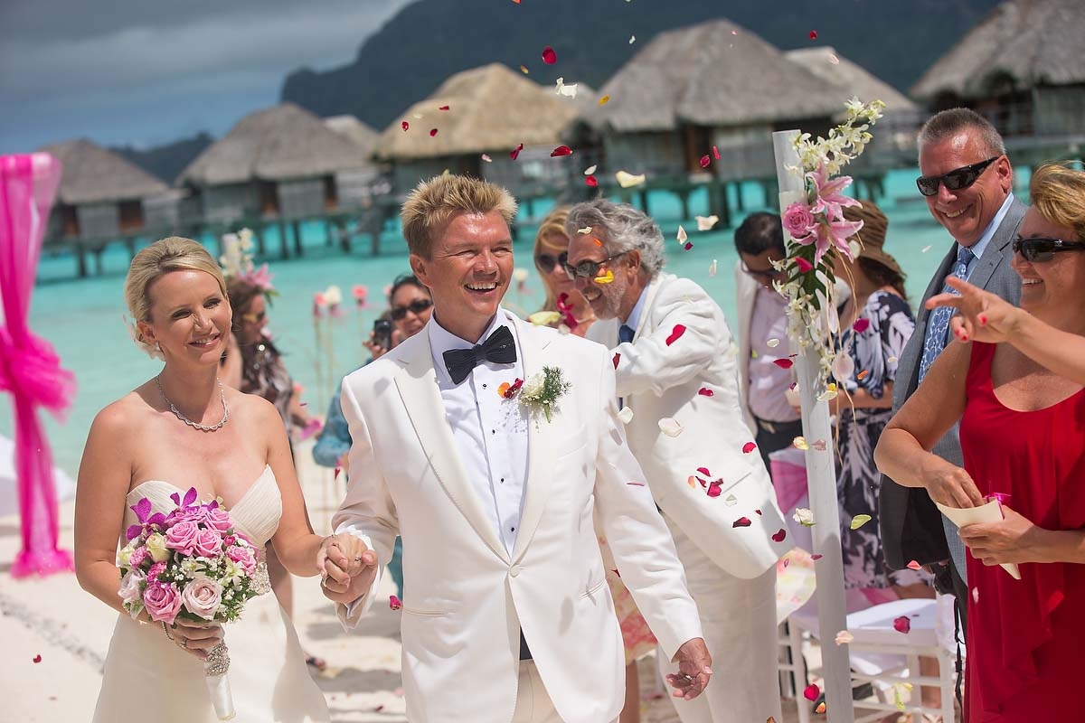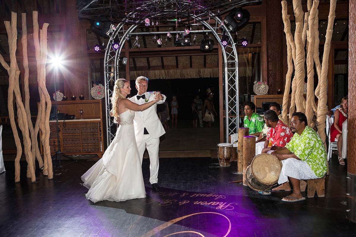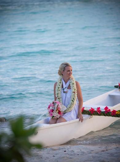 Later that day, the couple’s unsuspecting guests were treated to an elaborate Polynesian wedding celebration, arriving at the site to the pounding of Polynesian tribal drums and dancers. The sound of conch shell horns filled the air as the bride was escorted across the lagoon in a Polynesian outrigger canoe, ready to be presented to her husband and a warrior priest.