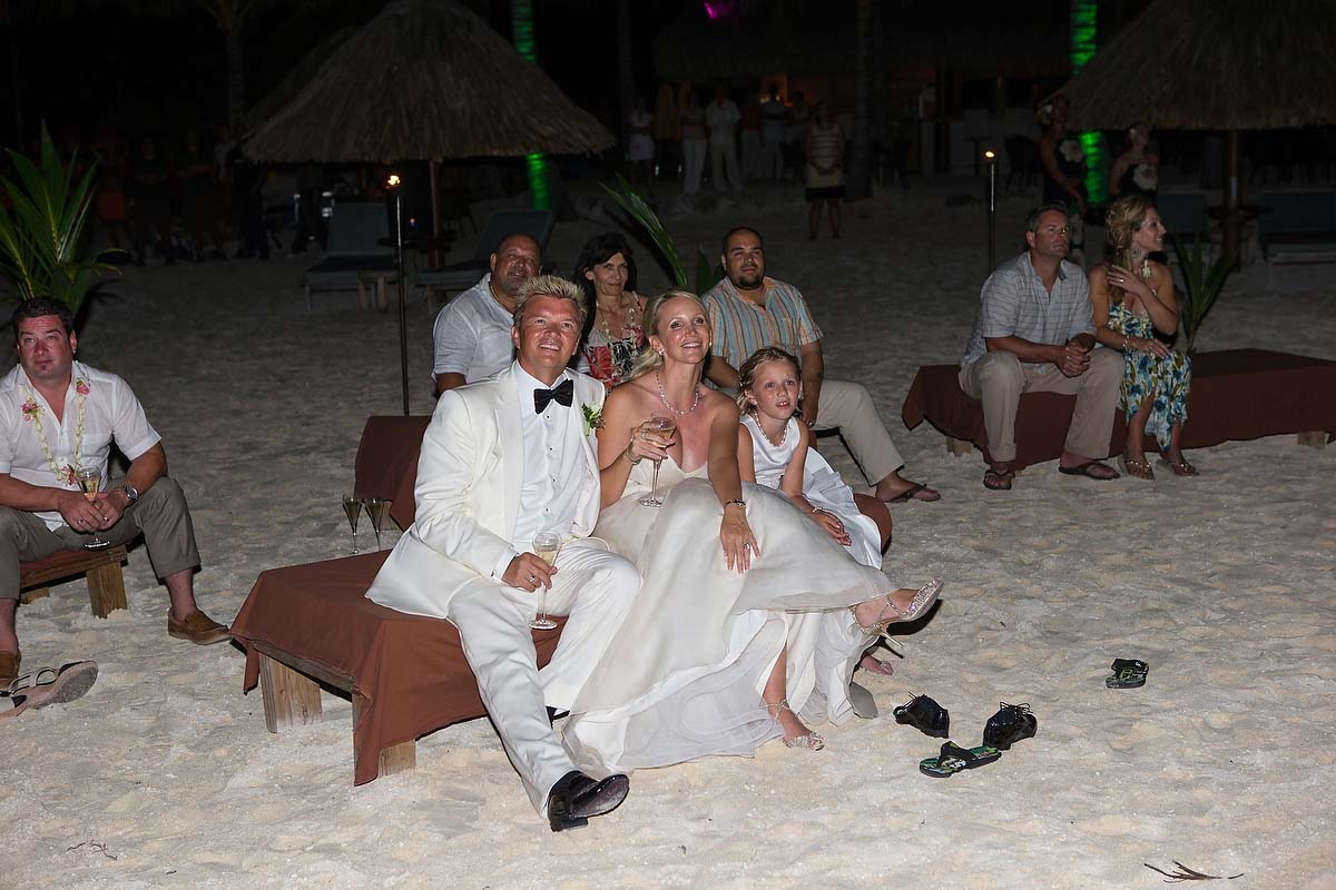 During the beachside reception dinner, beautiful details awaited the wedding party such as Swarovski starfish napkin holders, ice sculptures, giant clamshells filled with bottles of champagne, and lush floral arrangements. Dinner was a five course French meal starting with lobster bisque, and ending with the cutting of the wedding cake.