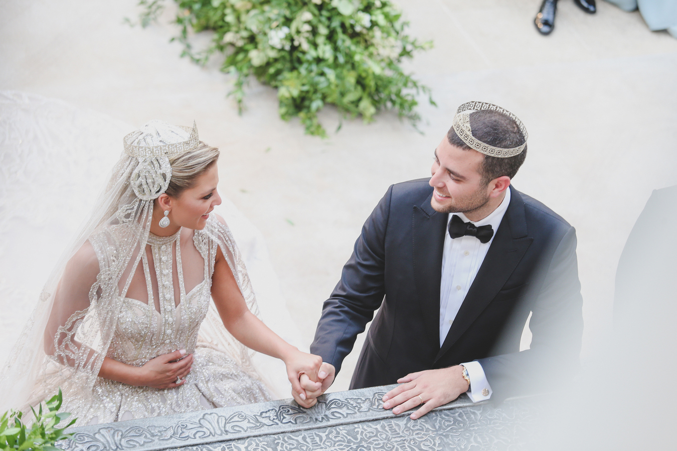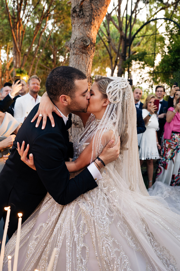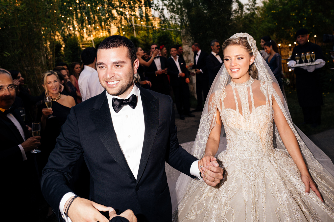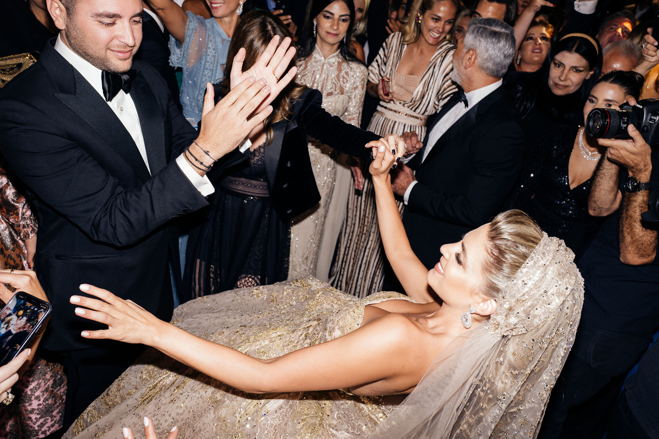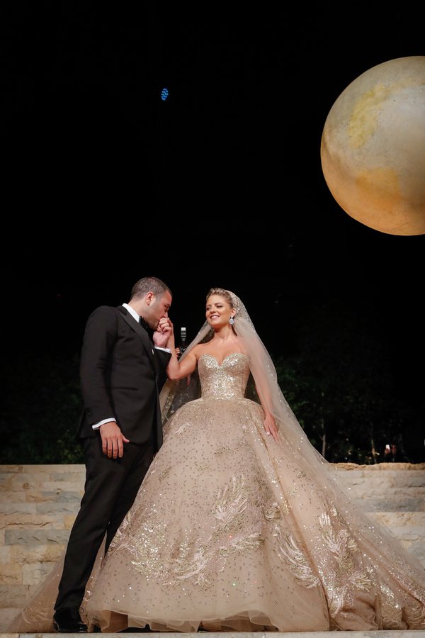 To match the scale and glamour of their wedding vision, the couple decided to return to their roots for a lavish destination affair. “We wanted to get married in Lebanon as we both grew up there, but also because the country offers the possibility to create different atmospheres with the mountains not too far from the city,” says Elie. “We organized a three-day celebration that started with an oriental pre-cocktail party, followed by the religious ceremony the next day, and later on a 1,200-guest afterparty held in Faqra. The celebrations ended on the third day with a pool party in the mountains.”