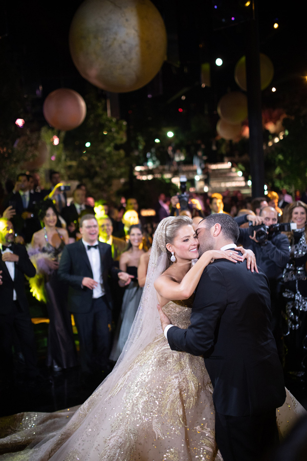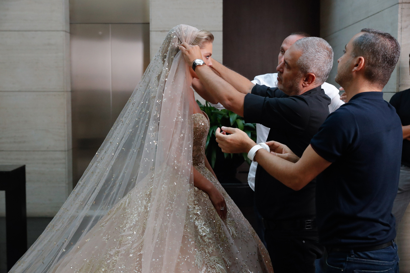 Christina and Elie were wed during a religious ceremony abiding by Lebanese and Maronite traditions. The bride wore a sleeveless gown with a high neckline, voluminous skirt, 4.5-meter train, and a matching veil and headpiece. It took a total of twelve embroiderers, three pattern makers, six tailors, three artwork designers, and ten petites mains to create the gown made of tulle, silk and lurex embroidery, and half a million sequins. Later that evening, Christina changed into her second dress consisting of a heart-shaped corset, 650,000 gold sequins, 150,000 Swarovski strass pieces, and a sequined veil – the final masterpiece after 450 hours of embroidery, 150 hours of moulage and volume creation, 80 hours of embroidery layout design, and 200 hours of tailoring.
